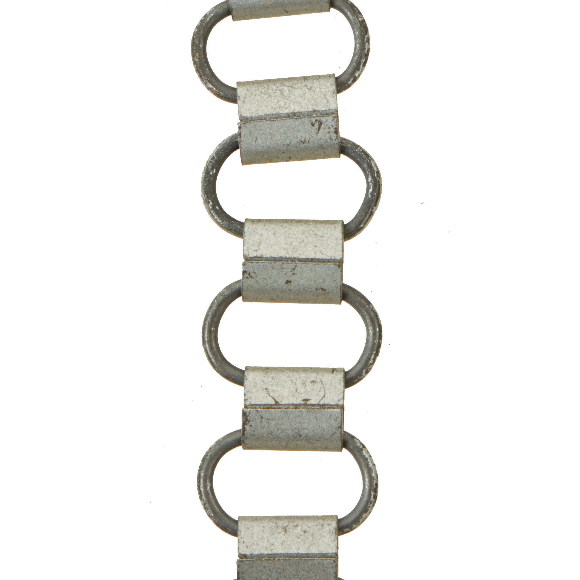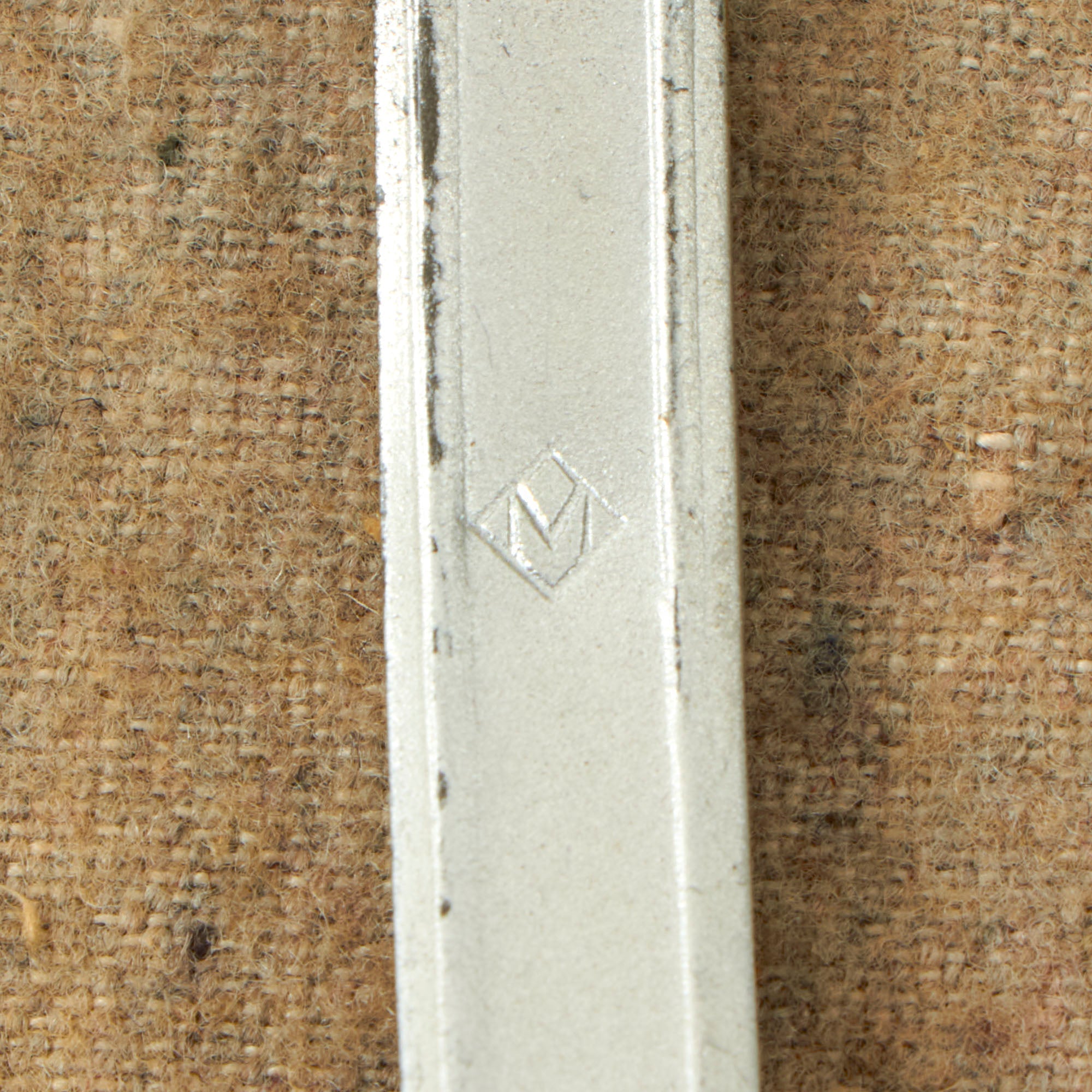 This is an excellent example of a Third Reich Feldgendarmerie gorget, made of stamped steel with a steel chain, both of which look to be aluminum painted. It was made by J.C. Maedicke of Berlin, who also was known for making belt buckles and other clothing accoutrements. The back of the long central hook is marked with their "M inside a diamond" trademark logo.
