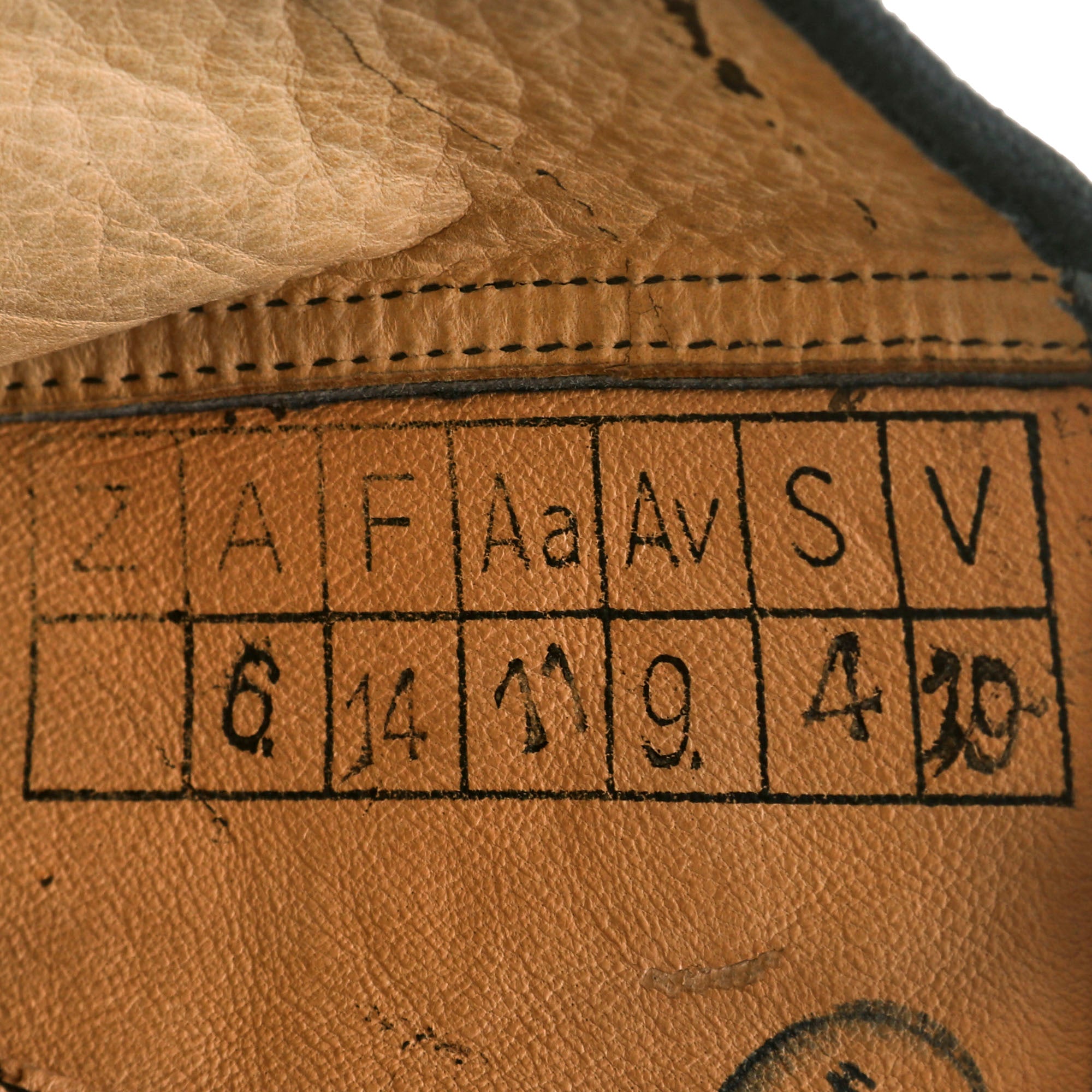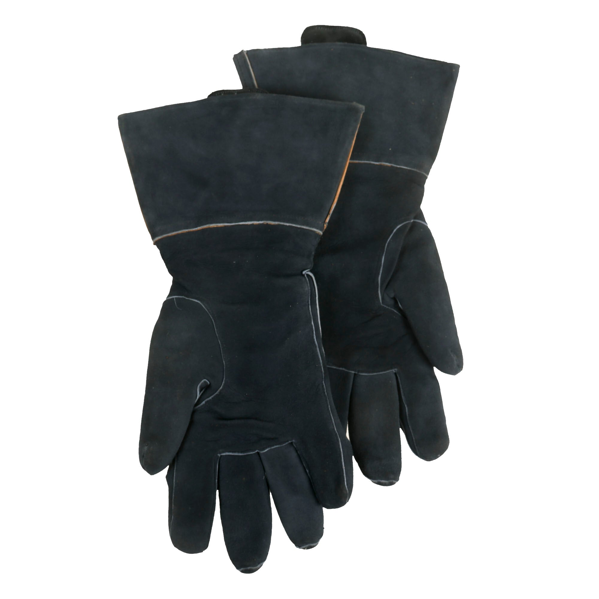 Original Items: Only One Pair Available. This is an excellent condition pair of German World War Two Luftwaffe Pilot's Flying Gloves, which do not appear to have been used for any substantial amount of time. The gloves feature dark blue suede leather exteriors, with natural leather interiors on the wrist guards, and blue wool interiors on the "glove" portion of the gauntlet style gloves. Electrical elements are enclosed in the glove with the standard Luftwaffe "male" press-stud connectors at the sleeve end of the gloves. These would snap onto the matching "female" connectors on the flying suit or trousers.