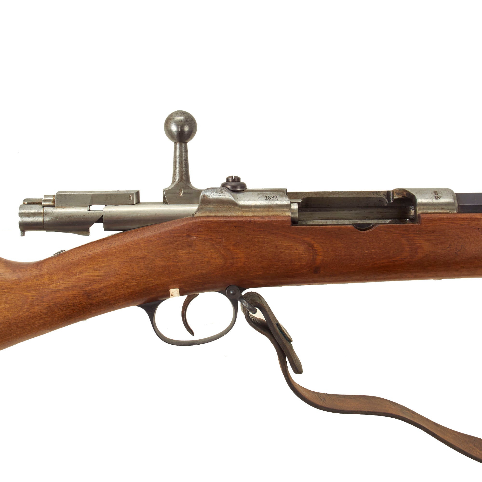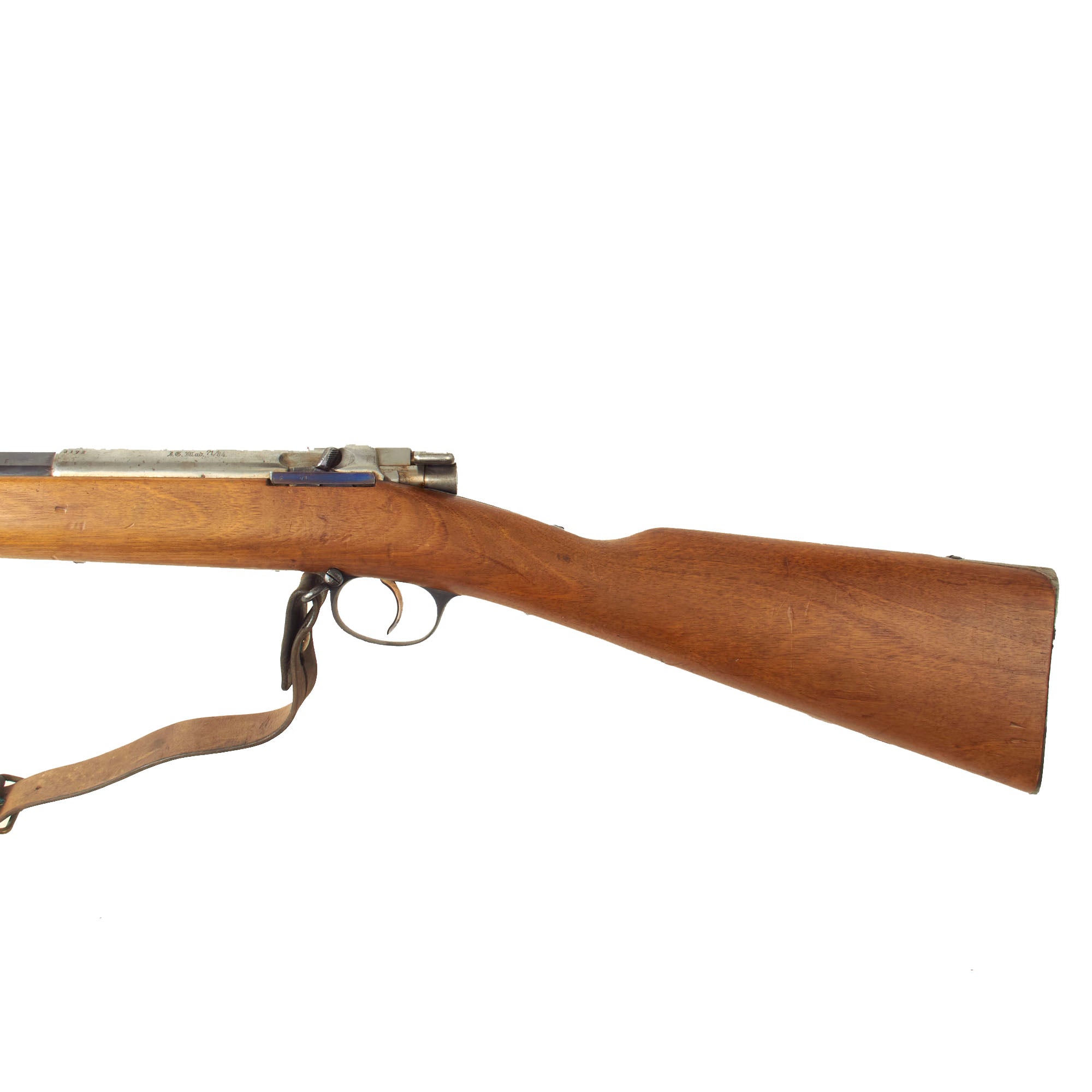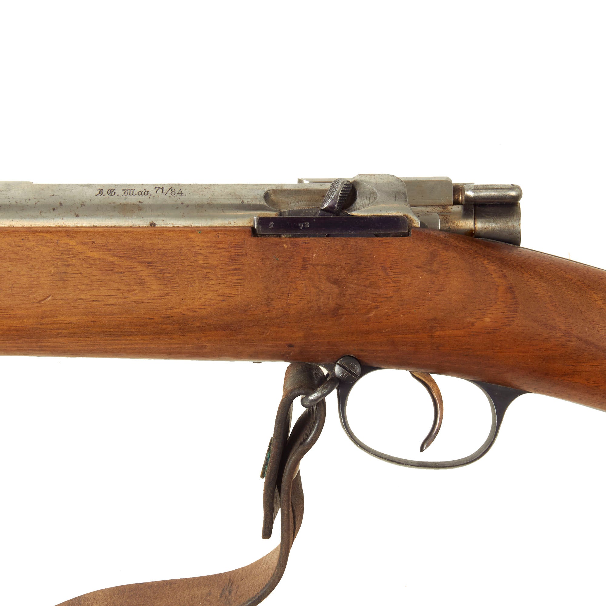 The receiver is dated 1887. on the right and marked I. G. Mod. 71/84. on the opposite side in "Black Letter" typeface. The rifle is complete with all major parts intact and functional, and almost all of the original finish. The receiver is bright steel with minor staining, while the barrel and other fittings are a lovely blued finish, with just some light wear in areas. It looks like an unissued gun that was kept in storage for decades, with maybe a wipe down occasionally to keep it clean. It has been fitted with an original sling, which definitely shows great age.