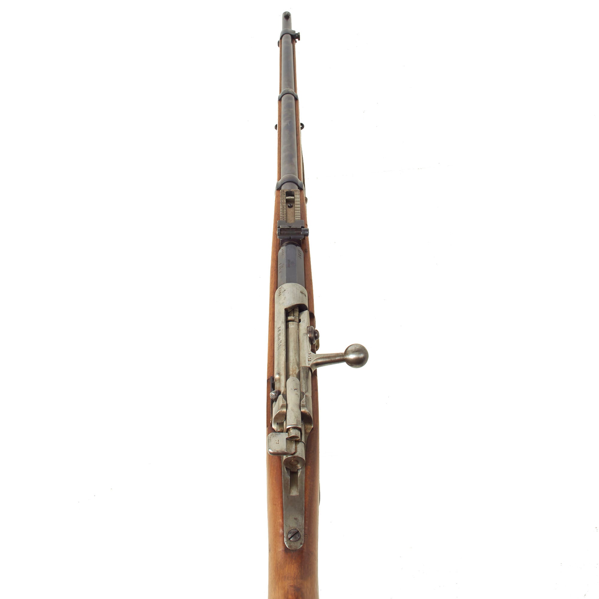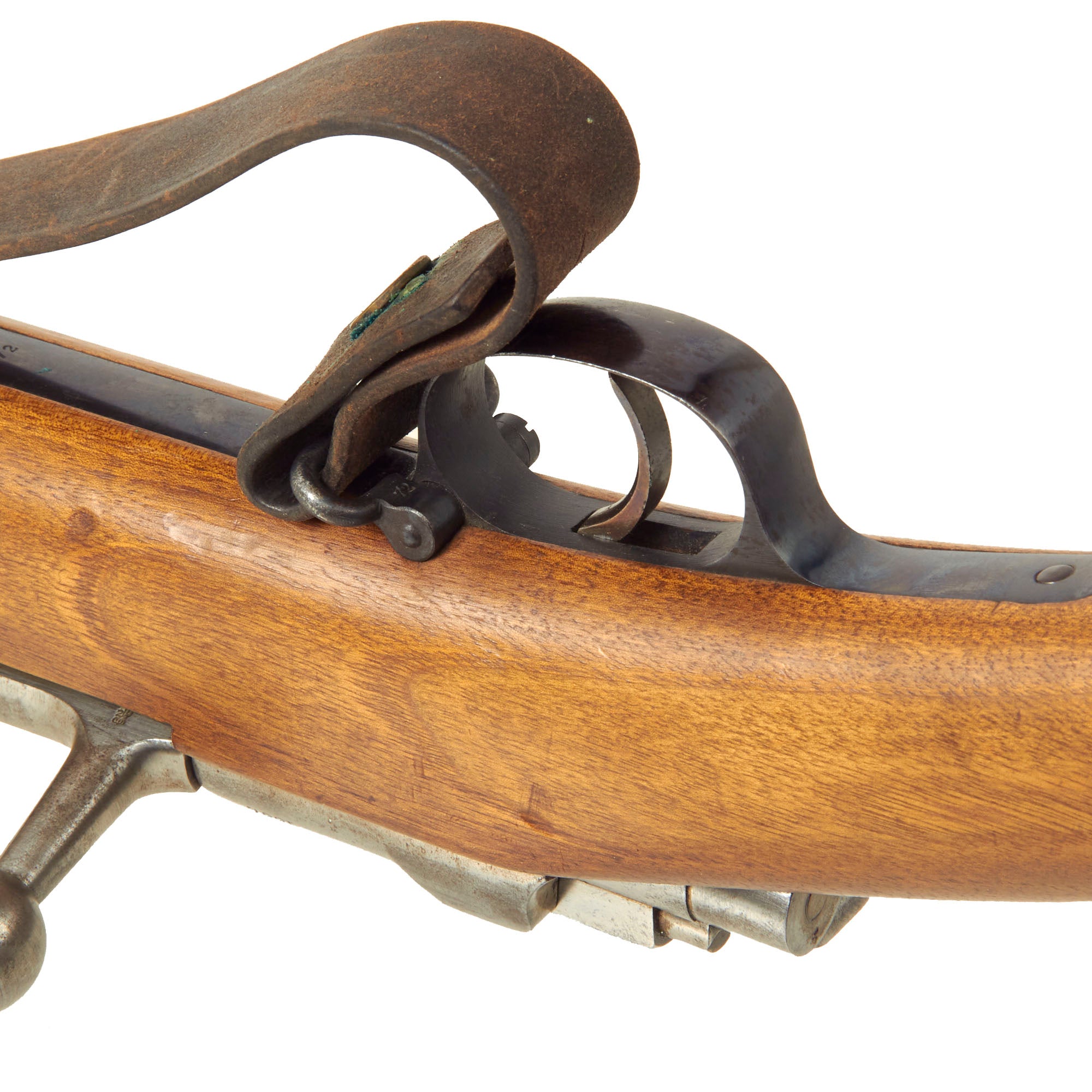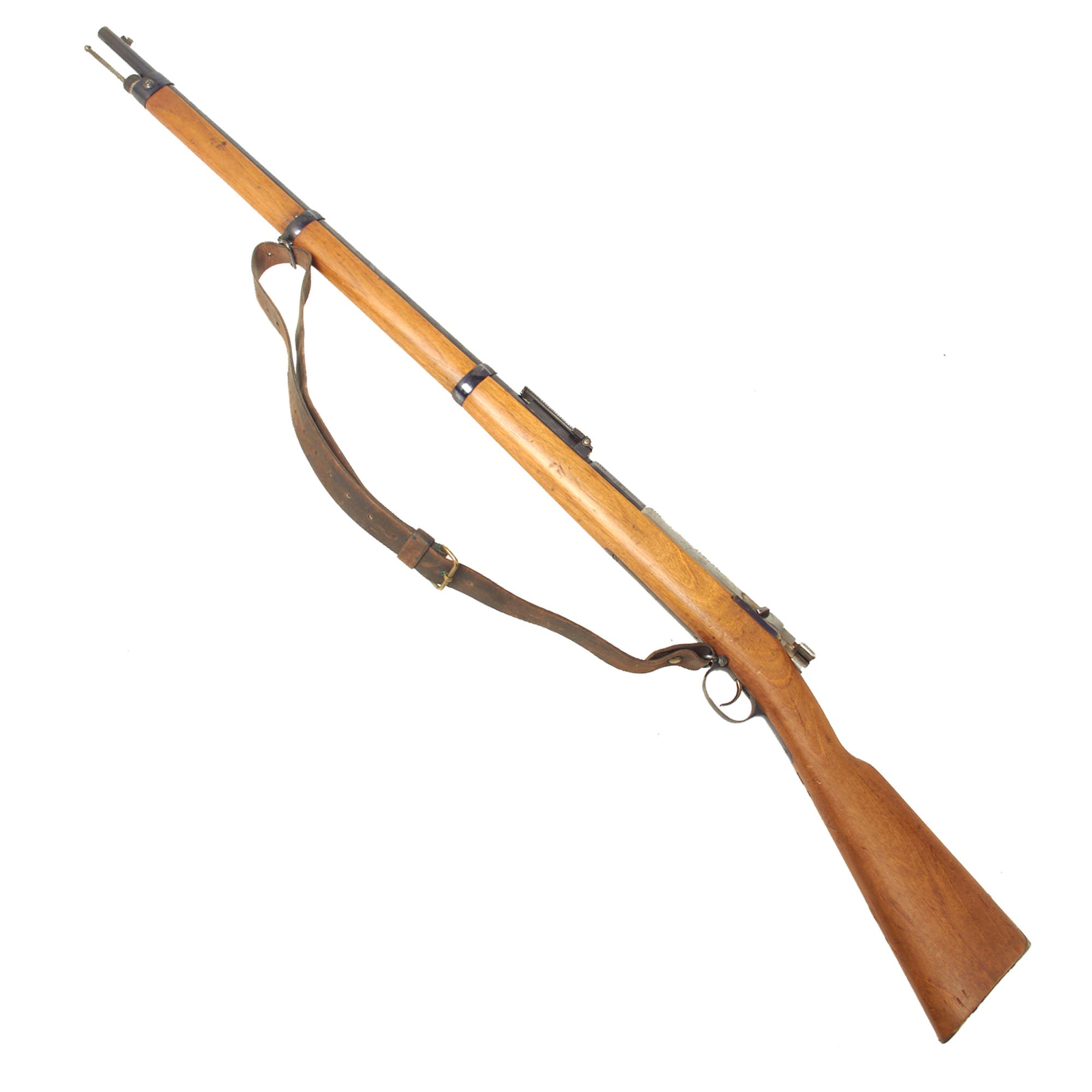 The receiver is dated 1887. on the right and marked I. G. Mod. 71/84. on the opposite side in "Black Letter" typeface. The rifle is complete with all major parts intact and functional, and almost all of the original finish. The receiver is bright steel with minor staining, while the barrel and other fittings are a lovely blued finish, with just some light wear in areas. It looks like an unissued gun that was kept in storage for decades, with maybe a wipe down occasionally to keep it clean. It has been fitted with an original sling, which definitely shows great age.