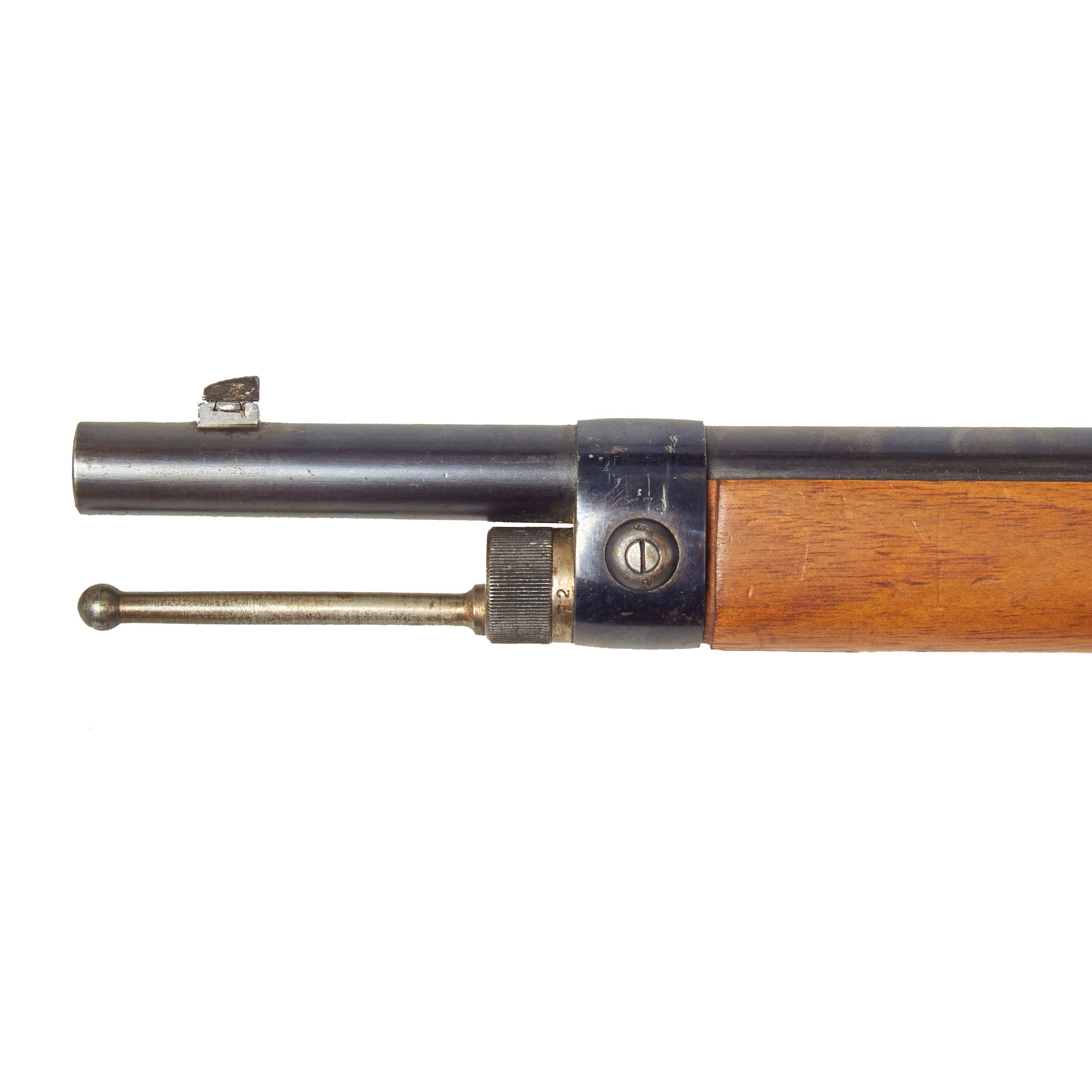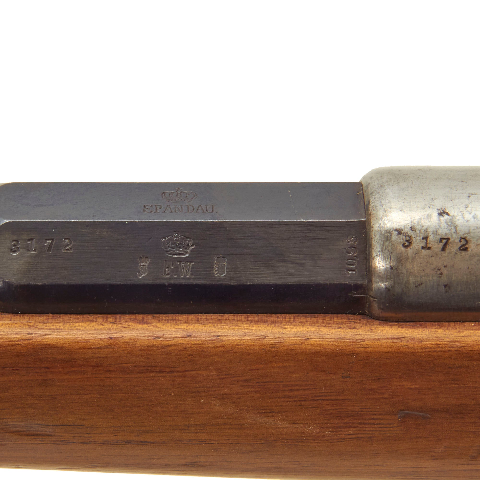 The top of the chamber is marked Crown over SPANDAU, for the Prussian (and later Imperial) Spandau arsenal in Berlin, a storied production plant that would produce weapons up until 1919, including the famous MG08 Maxim. Below this is the Crown over FW proof for Kaiser Wilhelm I, who used this cypher during his reign 1861-1888. Next to this is a 10,95 designation, giving the bore diameter in millimeters.