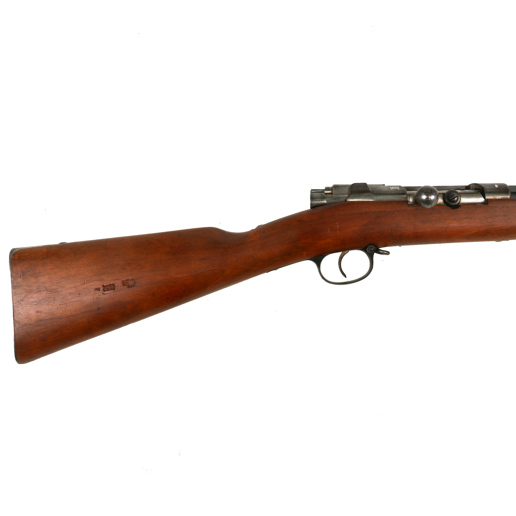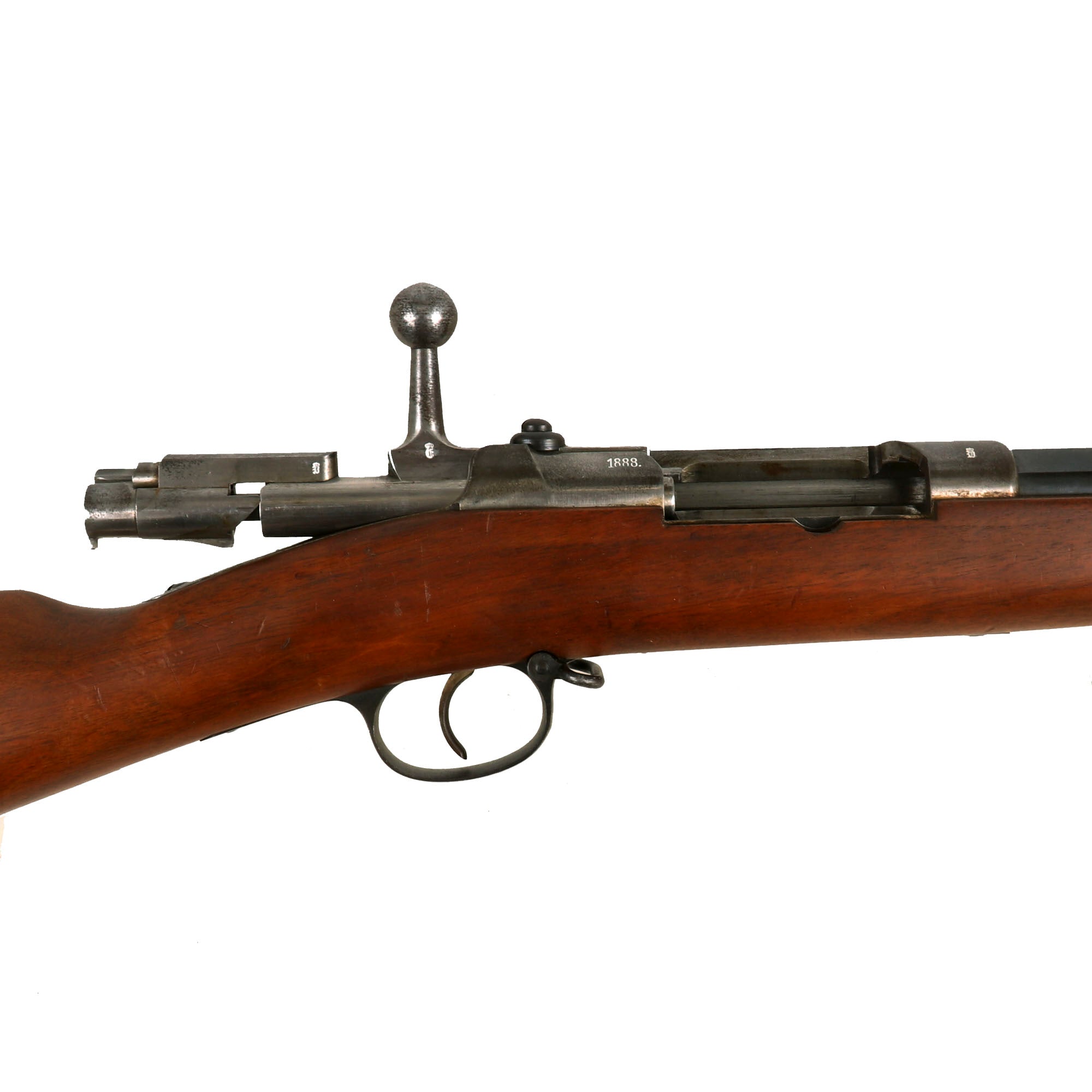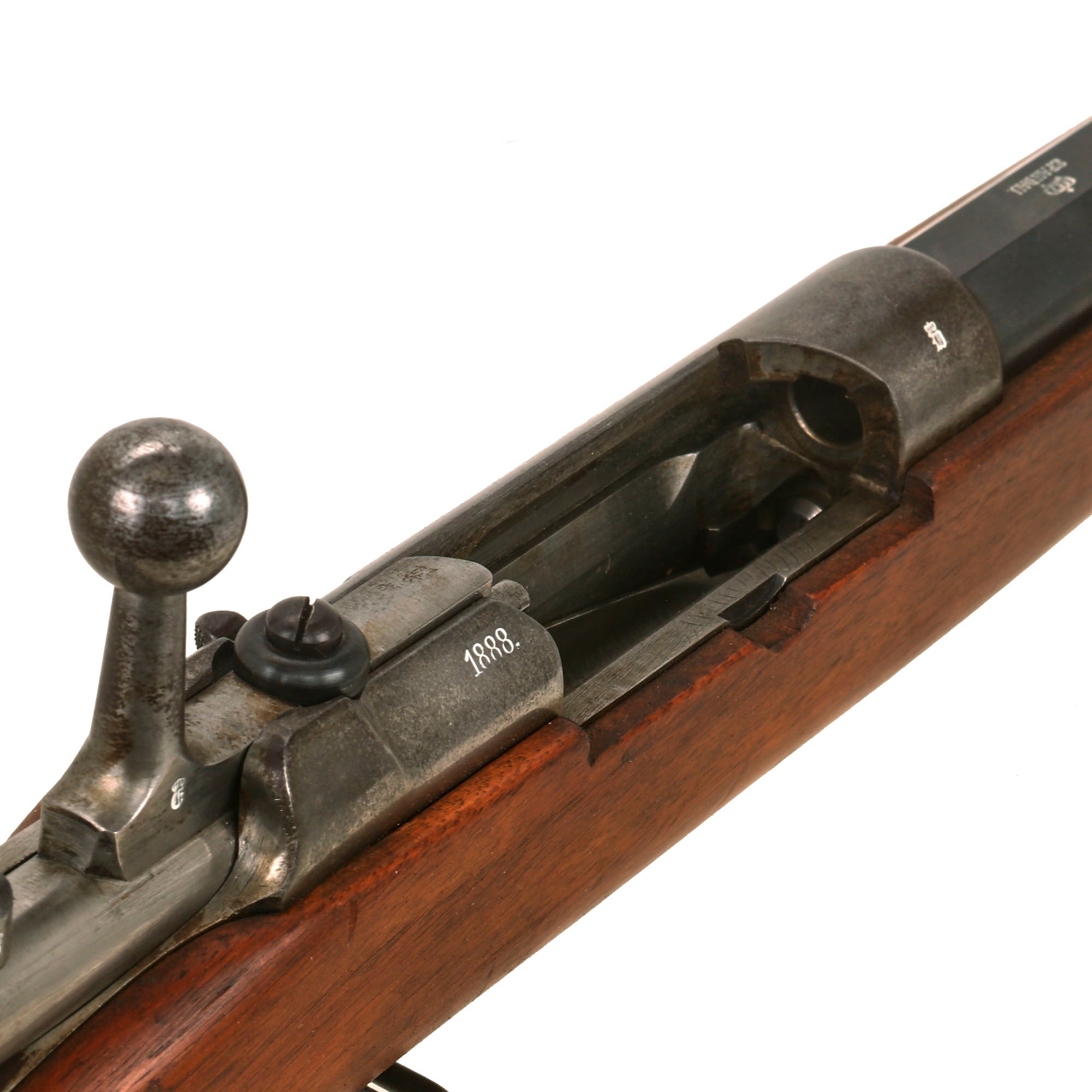 The receiver is dated 1888. on the right and marked I. G. Mod. 71/84. on the opposite side in "Black Letter" typeface. The rifle is complete with all major parts intact and functional, and almost all of the original finish. The receiver is bright steel with minor staining, while the barrel and other fittings are a lovely blued finish, with just some light wear in areas. It looks like an unissued gun that was kept in storage for decades, with maybe a wipe down occasionally to keep it clean, which allowed light staining to take hold on the bright steel.