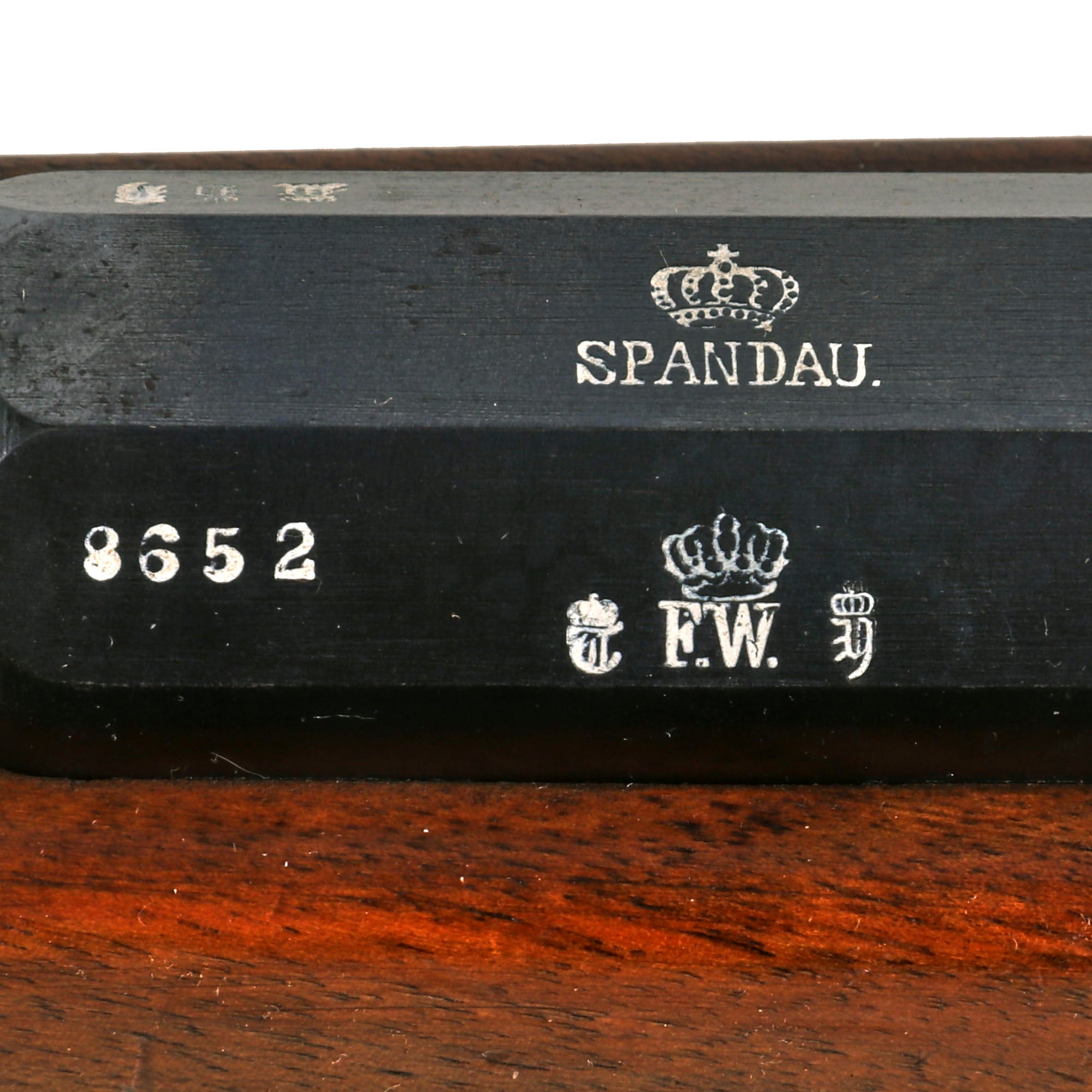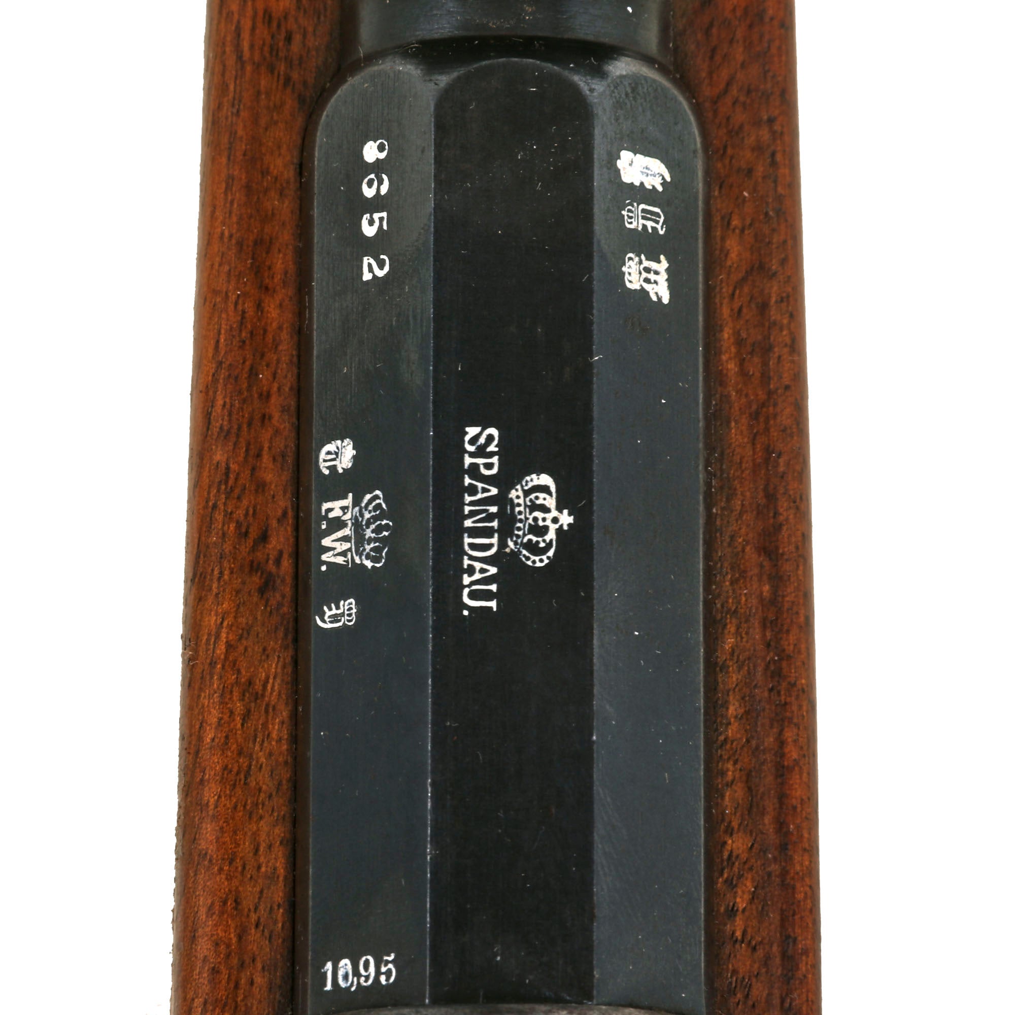 The top of the chamber is marked Crown over SPANDAU, for the Prussian (and later Imperial) Spandau arsenal in Berlin, a storied production plant that would produce weapons up until 1919, including the famous MG08 Maxim. Below this is the Crown over FW proof for Kaiser Wilhelm I, who used this cypher during his reign 1861-1888. Next to this is a 10,95 designation, giving the bore diameter in millimeters.