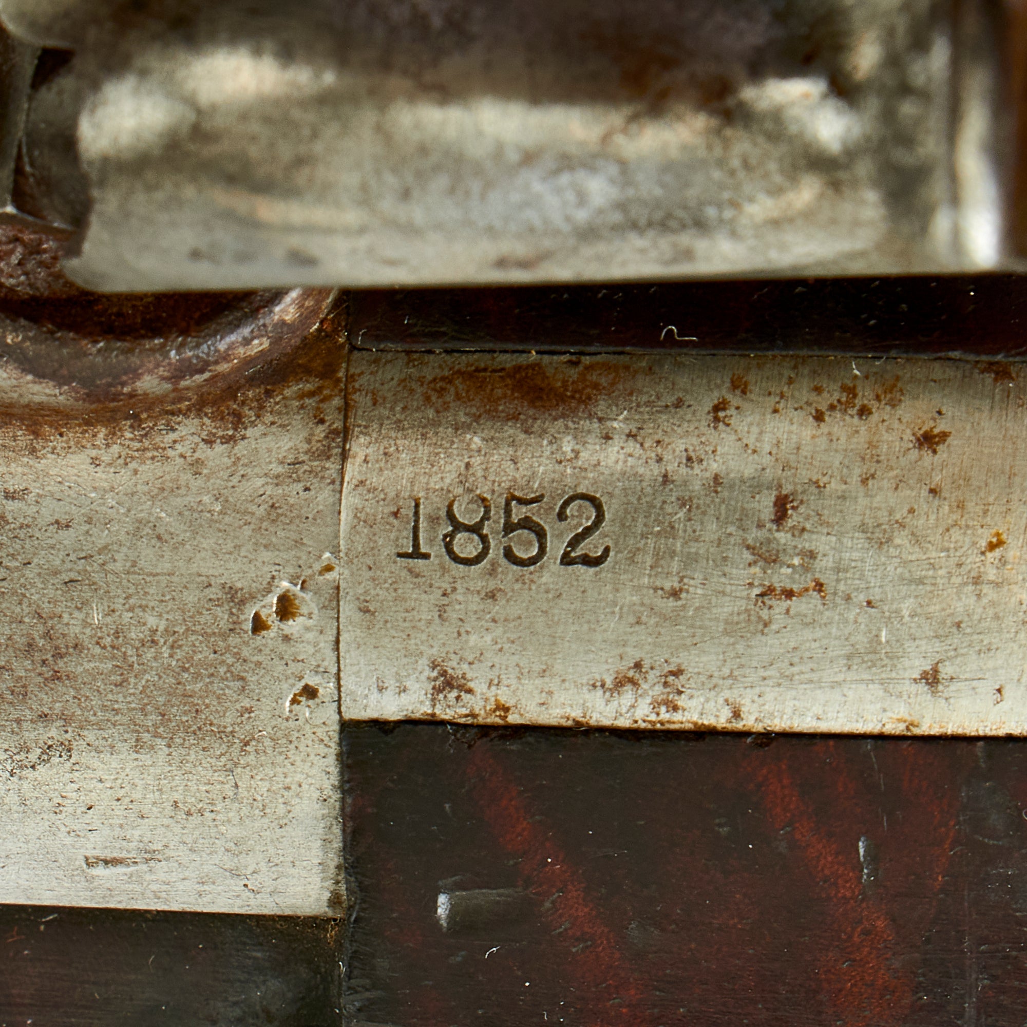 It has a fantastic walnut stock, with great grain some lovely figuring throughout the grip area and forward to just past the trigger guard, which is almost "burl" level. It features all brass mounts, all in good lightly used condition with a lovely patina. There is even a crisp and fully legible stylized "boxed" W.A.T. cartouche, indicating inspection by Captain William Anderson Thornton, who worked from 1841 to 1861, inspecting various small arms, specifically including pistols from Aston, Waters, and Johnson.