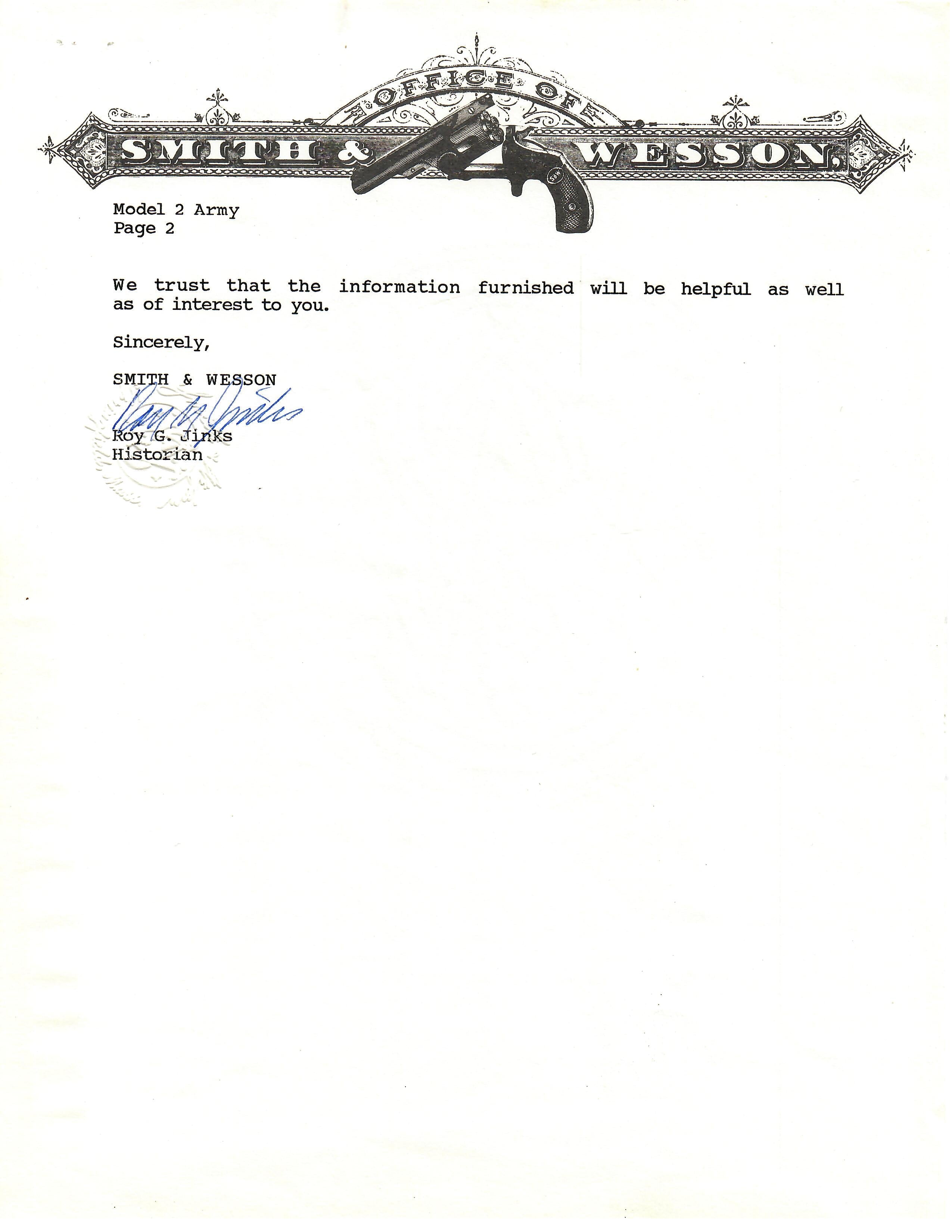 The serial number is 27627, dating the year of production to be approximately late 1864, about a 80% of the way through wartime production. In a first, we have a letter on official SMITH & WESSON LETTERHEAD, giving research information about this revolver. We were not even aware that letters as these were obtainable, and it is the first example that we have ever seen. Dated December 20 1991, it bears the signature of Roy G. Jinks, the Smith & Wesson historian, stamped with a S&W Raised seal.