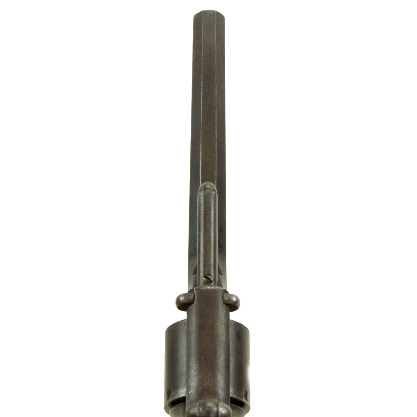 The rosewood grips on the revolver are original and have matching serial number 27627 on the inside of the right scale, and still almost all of the original factory varnish, though there is some wear on the corners. The revolver has a lovely aged patina overall, with some areas of the original blued finish still present, giving it a great look.