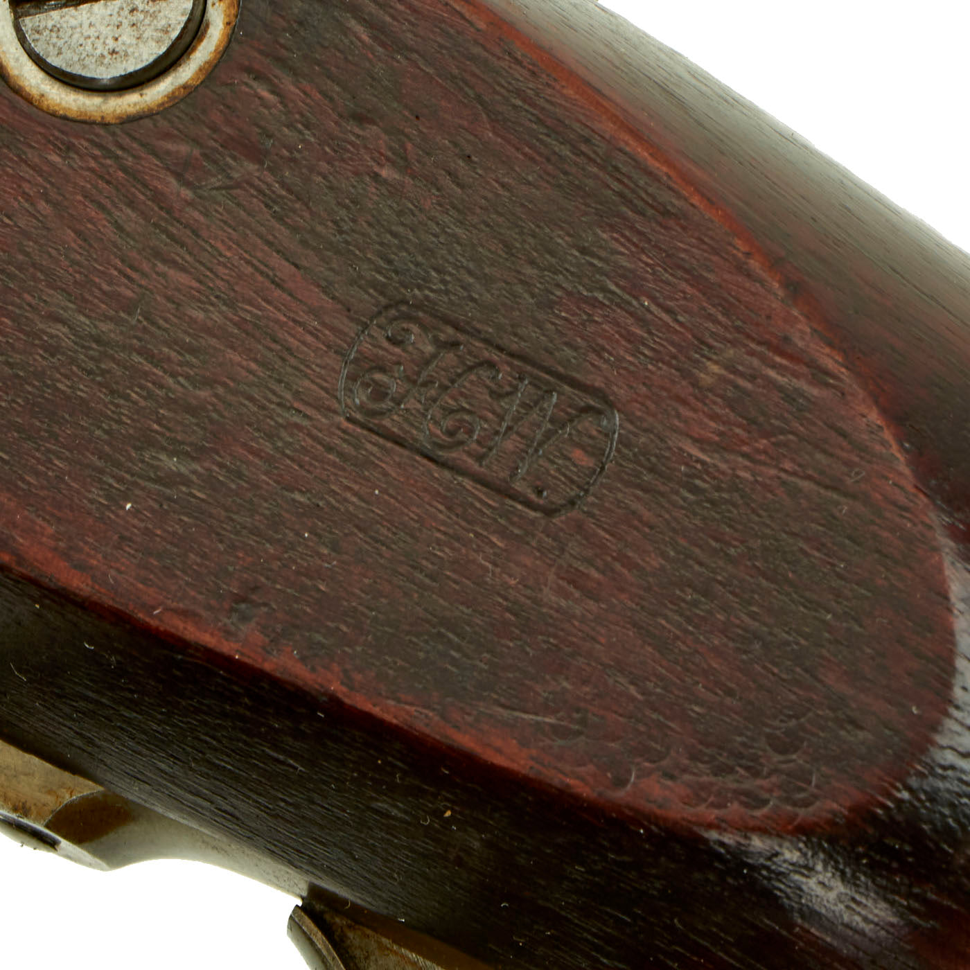 It comes complete with the original brass-fitted leather scabbard, which has passed the test of time with flying colors. The leather shows some cracking in the finish, but no bends or breaks, and the stitching looks to be complete. The only real issues to note with the scabbard are dents on the drag, and one of the four rivets holding it on is missing. It fits on the rifle easily, locking in place, and can be removed easily as well.