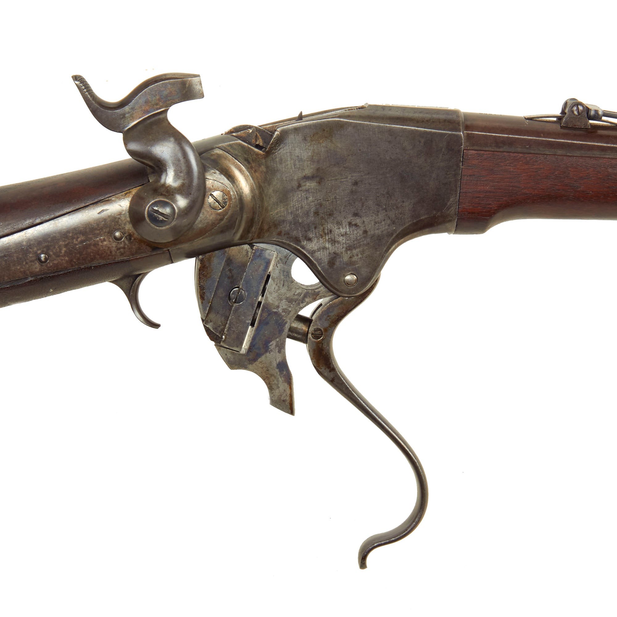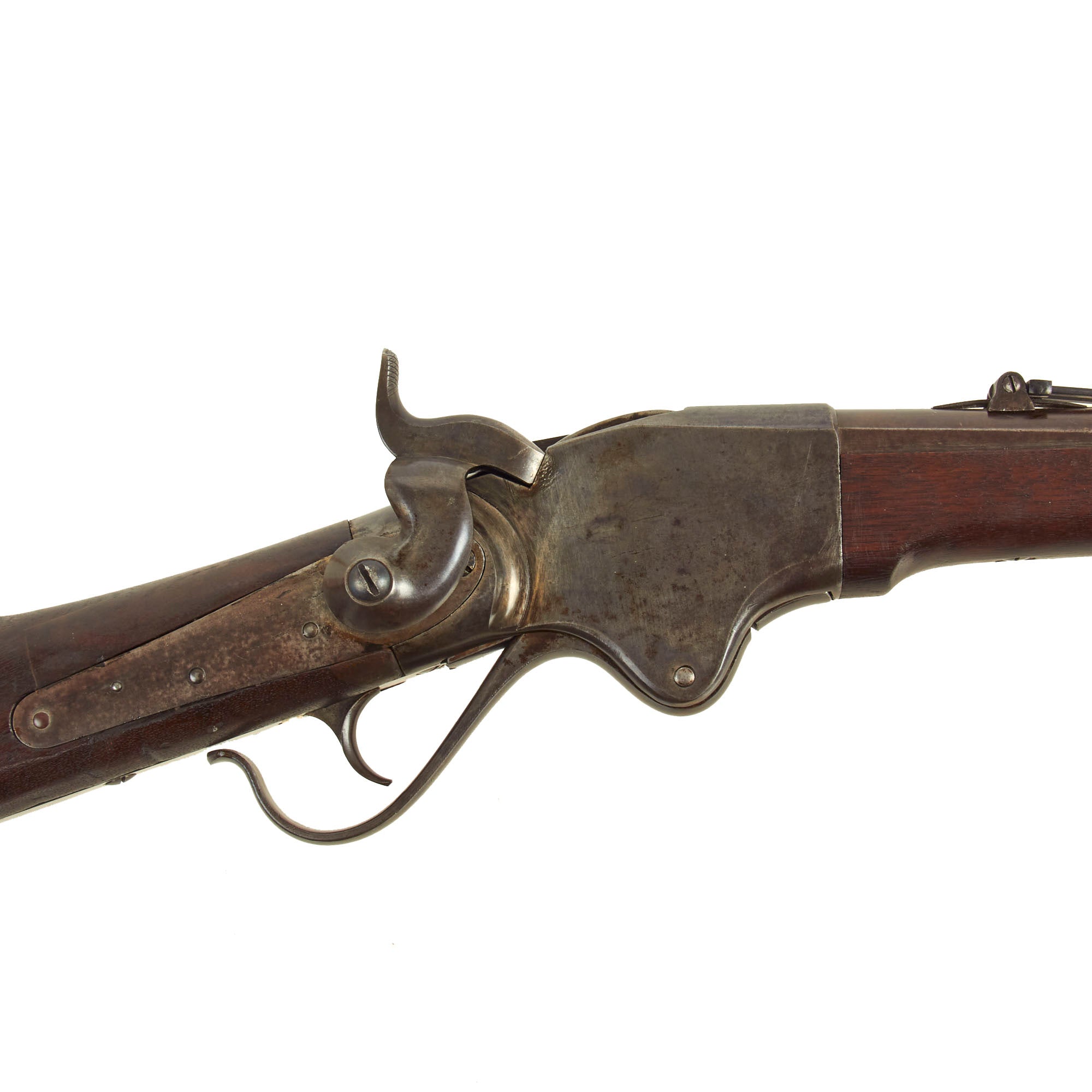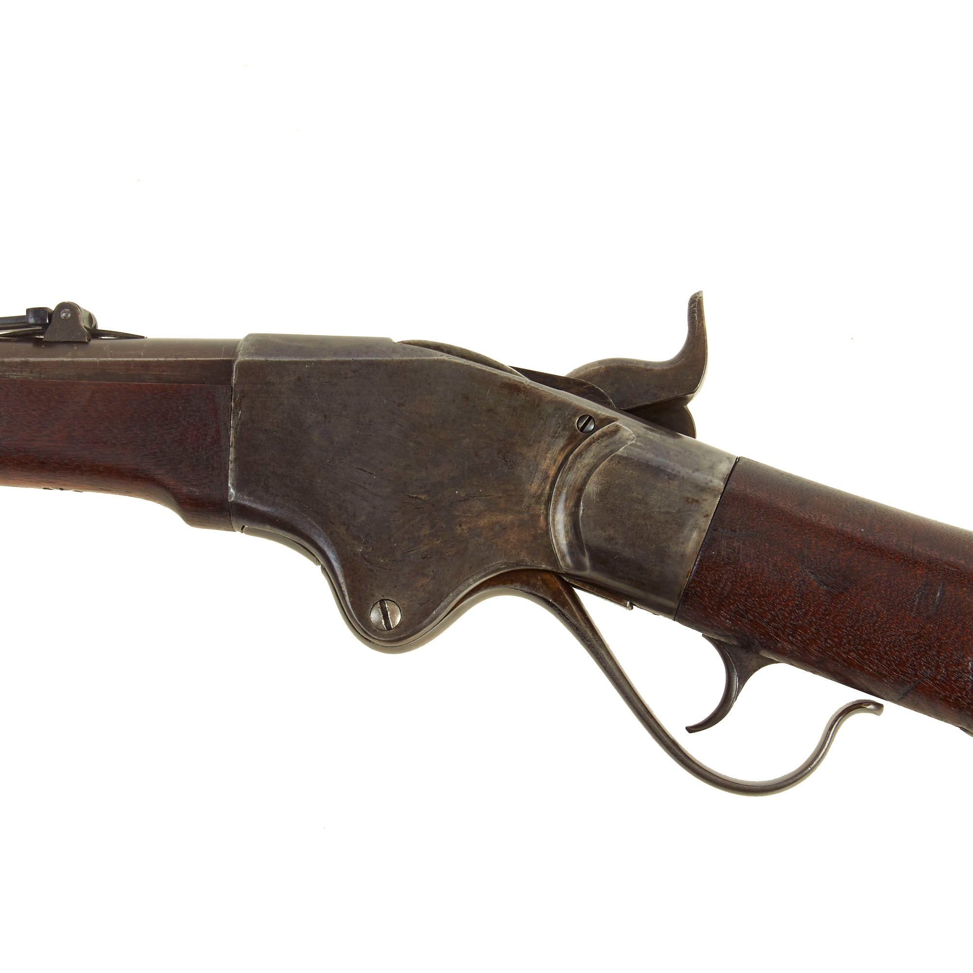 The Model 1865 rifle was made by both Spencer and by Burnside under license, and they each had their own serial number sequences. The metalwork of this rifle is in very good shape, with the original case hardened finish faded to a great gray patina over almost all of the metal surfaces of the rifle. The original ladder sight is complete and fully functional. The action functions well, though we have not tested the ability of the magazine to feed. This rifle is not equipped with a Stabler cutoff, and we see no evidence that it ever was.
