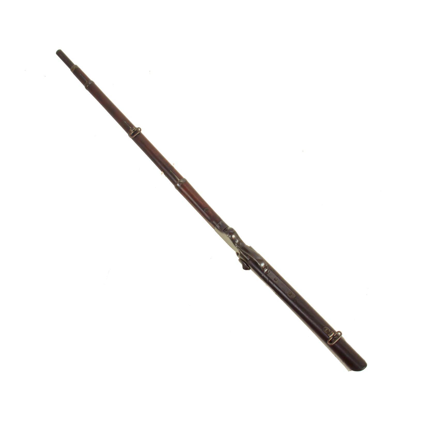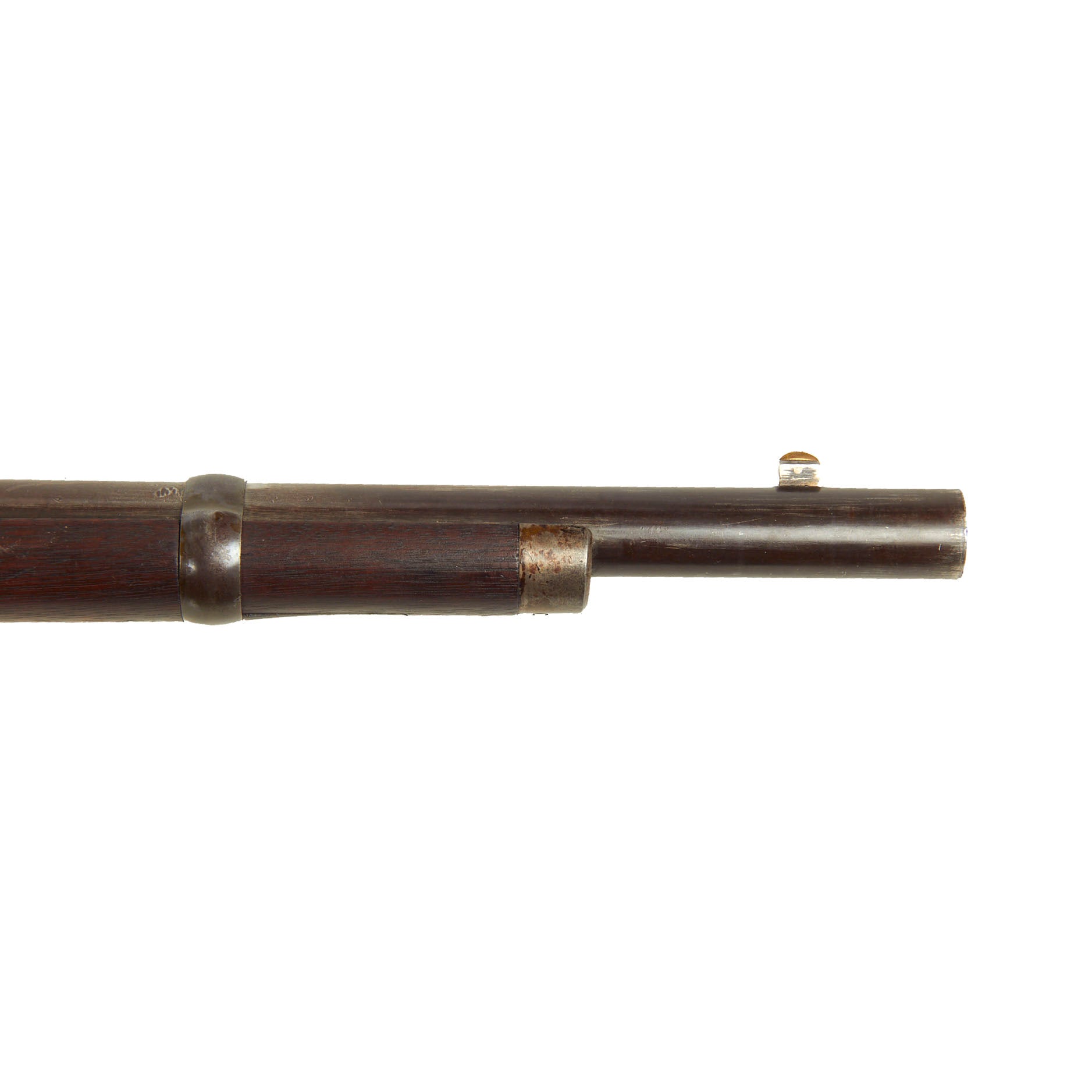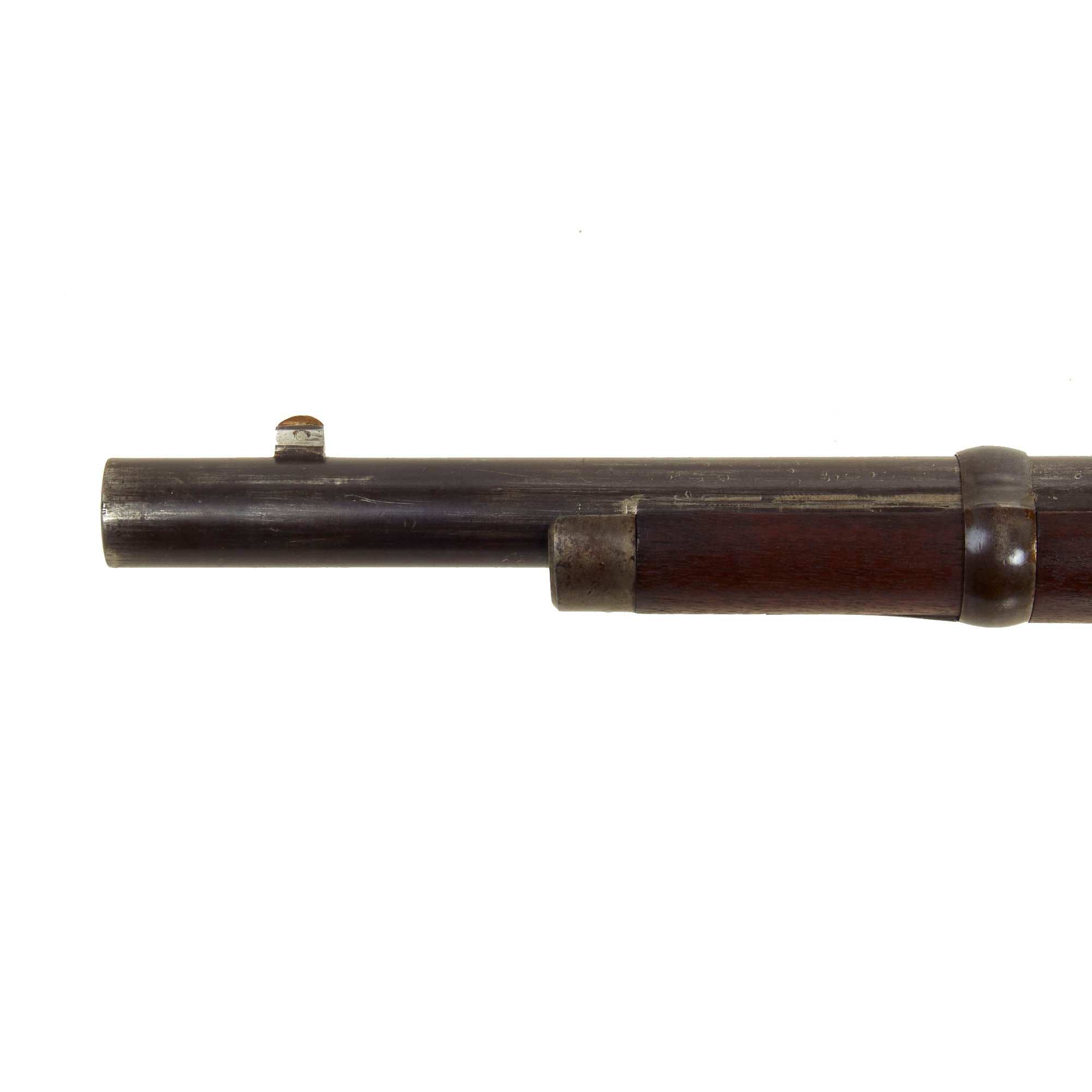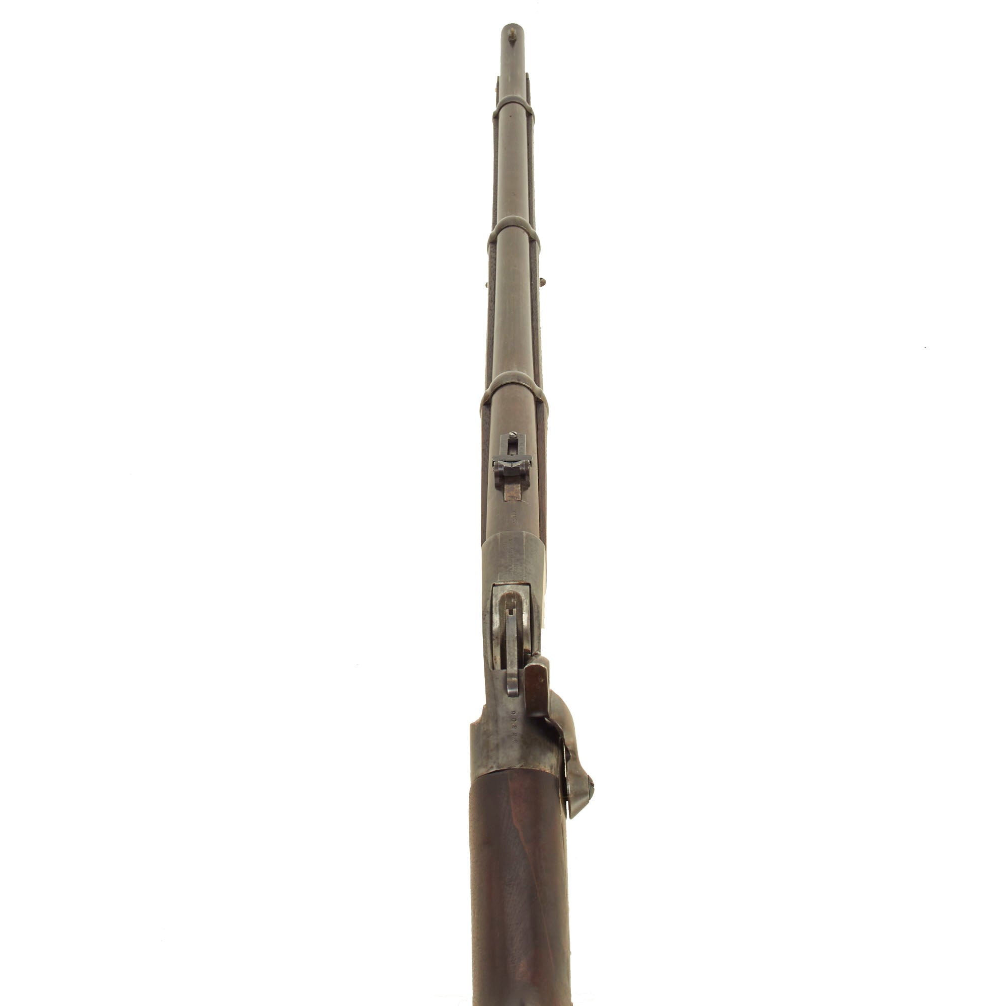 The Model 1865 rifle was made by both Spencer and by Burnside under license, and they each had their own serial number sequences. The metalwork of this rifle is in very good shape, with the original case hardened finish faded to a great gray patina over almost all of the metal surfaces of the rifle. The original ladder sight is complete and fully functional. The action functions well, though we have not tested the ability of the magazine to feed. This rifle is not equipped with a Stabler cutoff, and we see no evidence that it ever was.