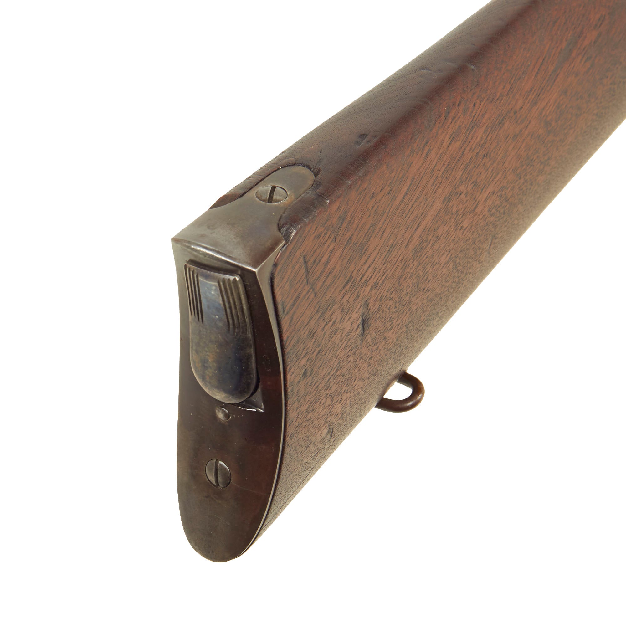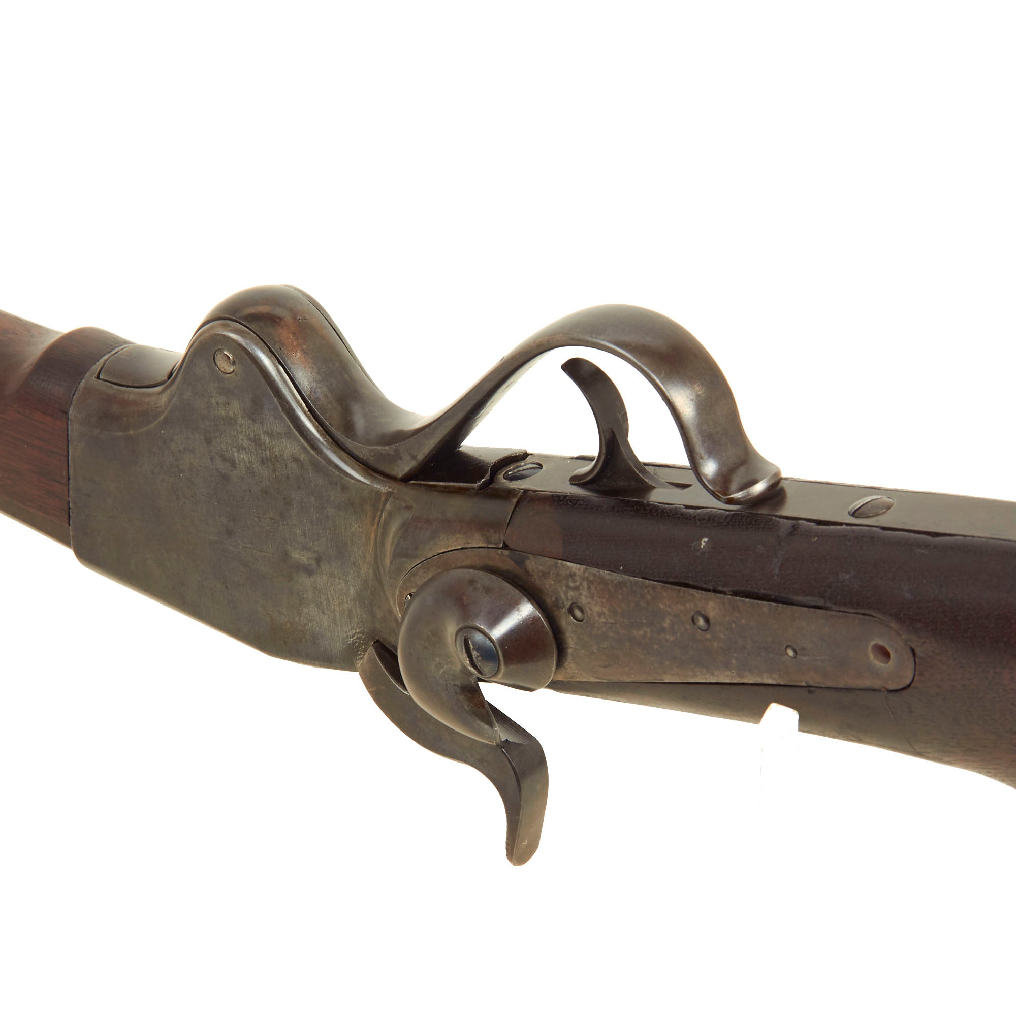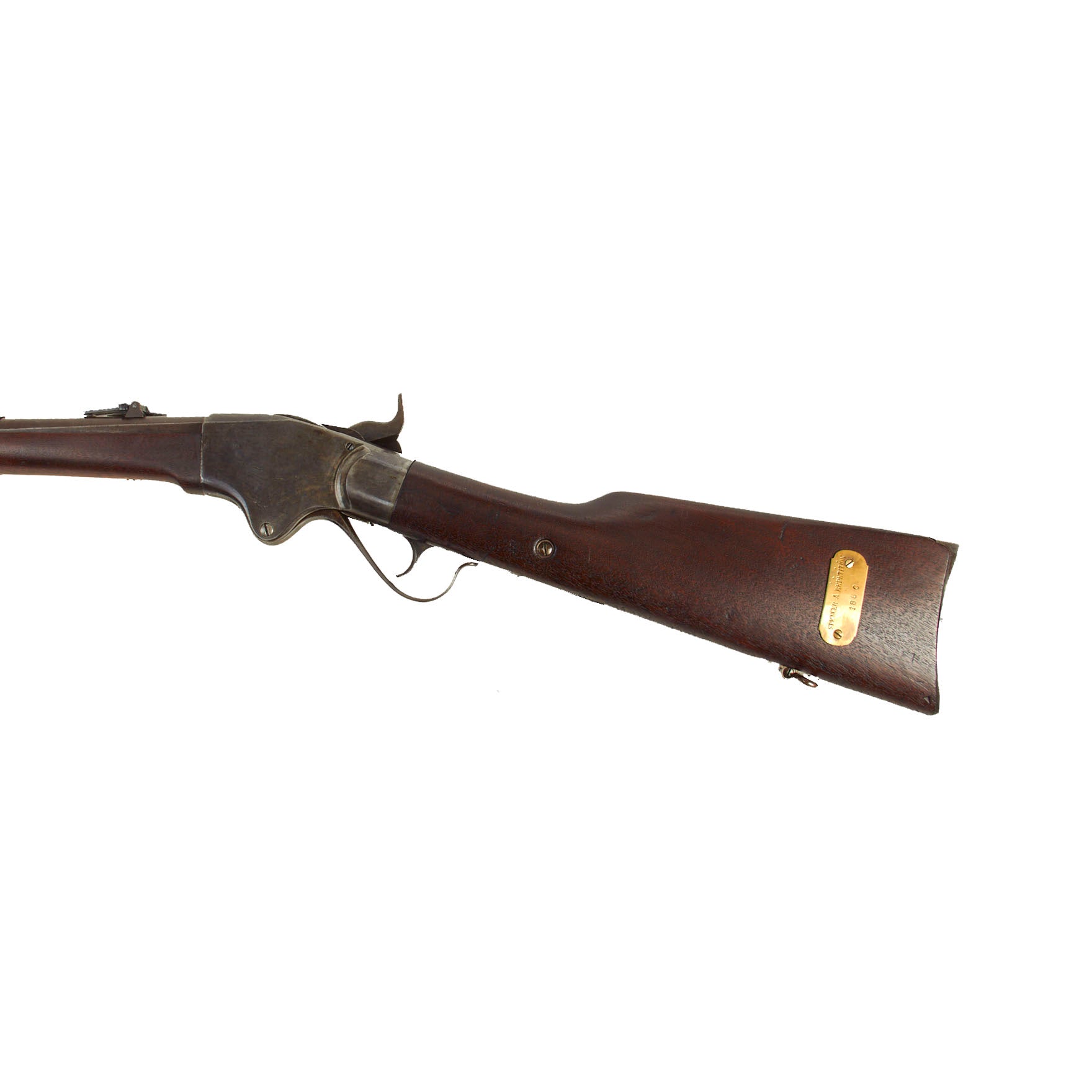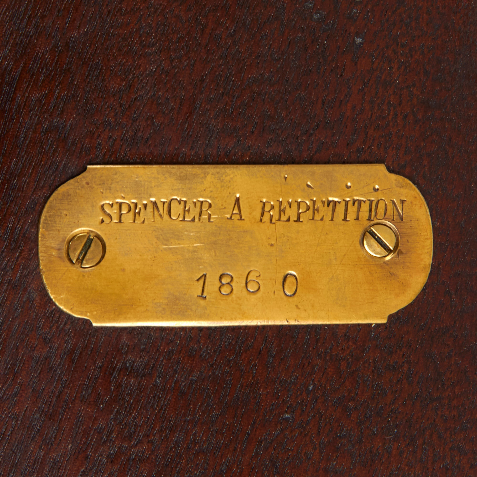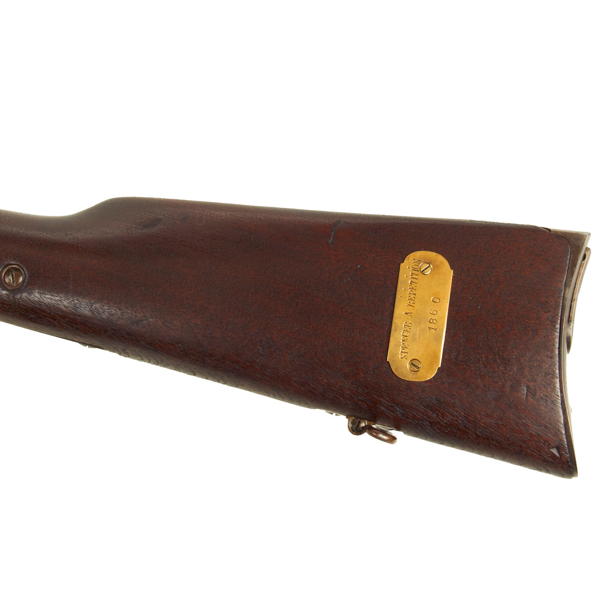 The stocks are still in very good shape, with a lovely light oil finish and a lovely red brown color. They show a few expertly executed old repairs, but otherwise look to have seen very little use at all. There are minimal dents and gouges present, though interestingly the left side of the stock has a brass plate reading SPENCER A REPETITION / 1860, which does not make sense, but may indicate that it was part of some museum collection in the past.