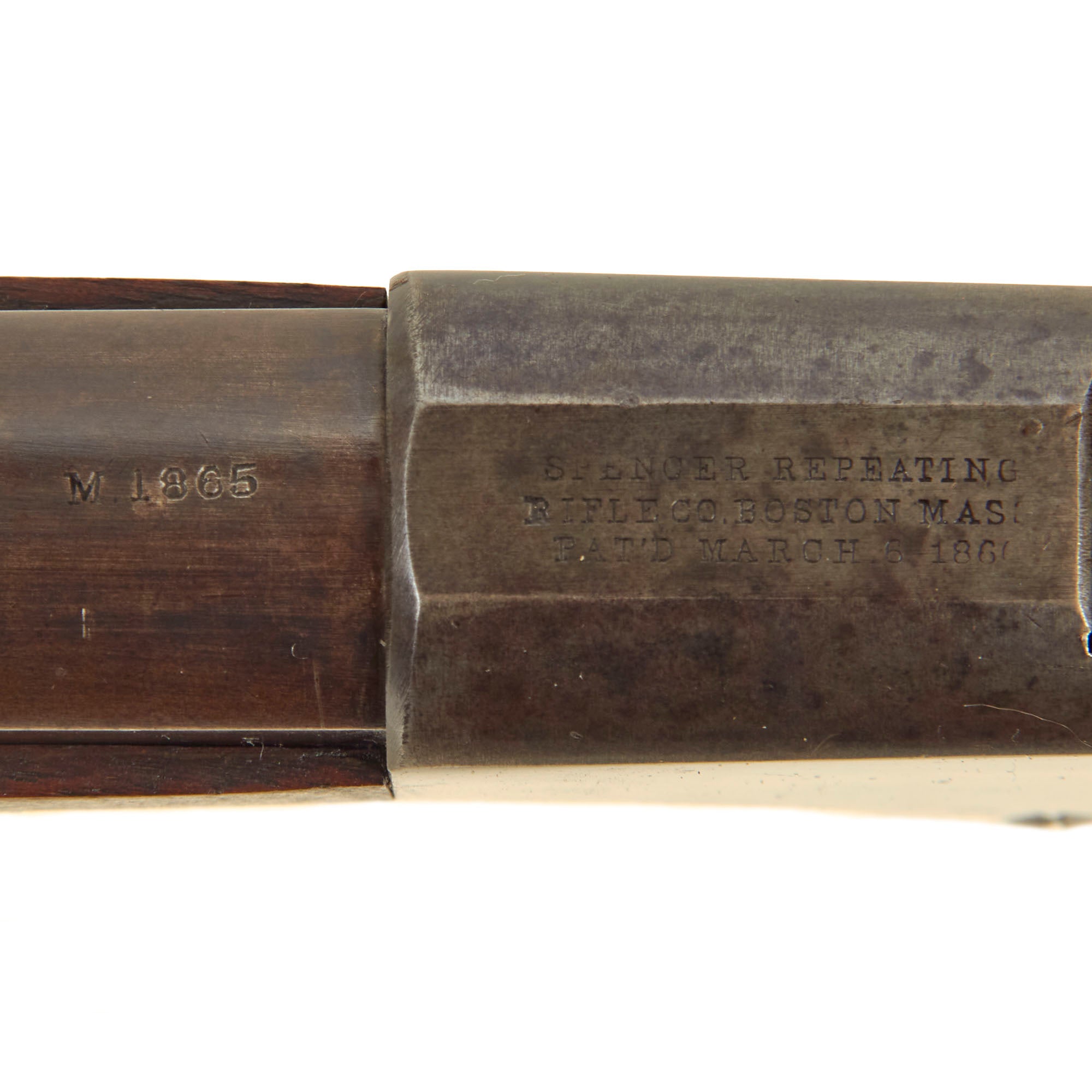 Here we have an excellent genuine Spencer Repeating Rifle Company Model 1865 infantry rifle, which is definitely one of the best condition Spencer manufactured Model 1865 examples that we have had. The rifles were produced in far smaller numbers than the carbines, making any example quite rare. It bears original serial number 90226 clearly on the tang of the receiver, as well as on the underside of the barrel under the fore stock. The barrel is correctly marked M.1865 over the chamber, and it has complete and crisp Spencer maker markings on top of the receiver: