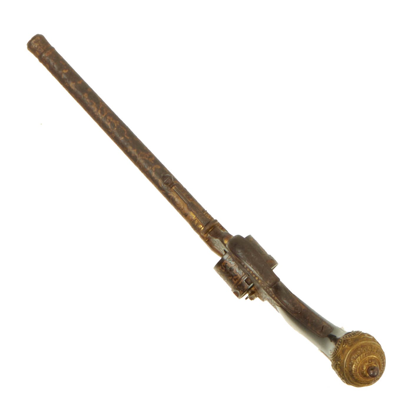 This revolver is definitely a work of art, and was intended as a showpiece, and most likely never intended to see any type of use. The bore of the barrel is completely smooth, and shows no signs of having been rifled. The gold wash also extends into the barrel by the cylinder, so definitely it was never meant for use.