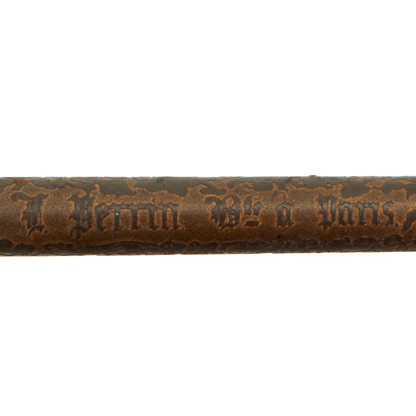 It is also marked PARIS on the right side of the frame by the arbor pin, with PERRIN & CIE BTÉ. "Bté" is short for Breveté, the French word for "Patented", indicating that it was a registered and protected design by Perrin. Originally known as Louis Perrin-Lepage, Perrin was one of the foremost high art gunsmiths of the era, with his best pieces housed in fabulous collections and prestigious museums.