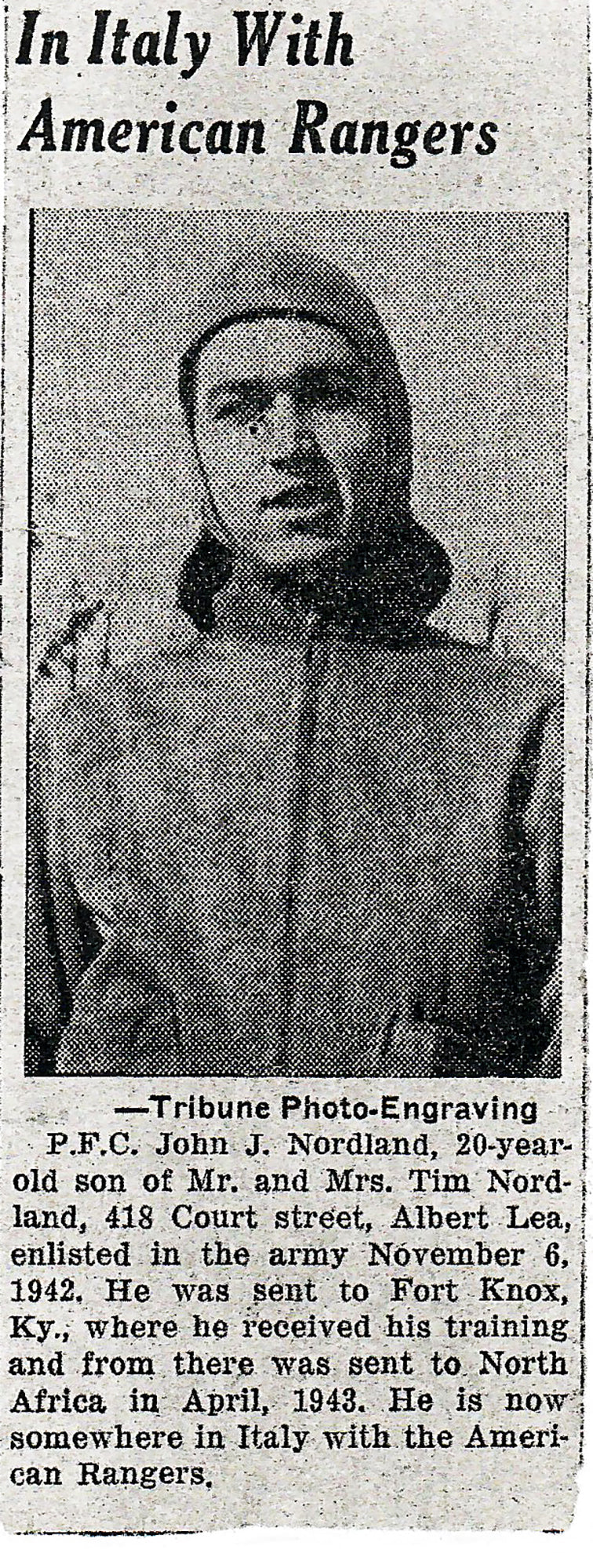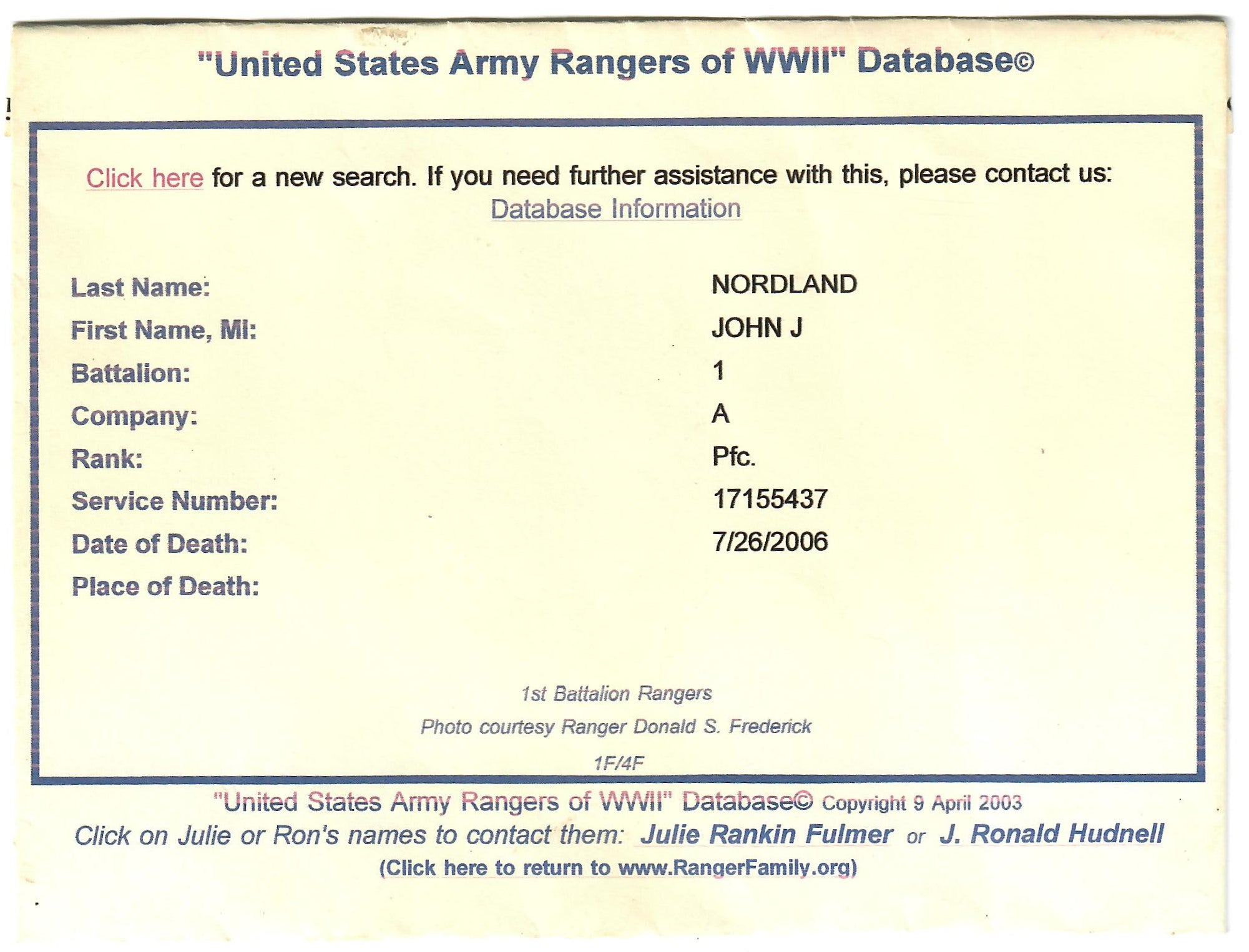 It should be noted that Nordland is listed on the roster of the 1st Ranger Battalion on page 367 in Robert W. Black’s Book Rangers in World War II. In addition, John Nordland’s Obituary from his death in 2006 is still available to view online: