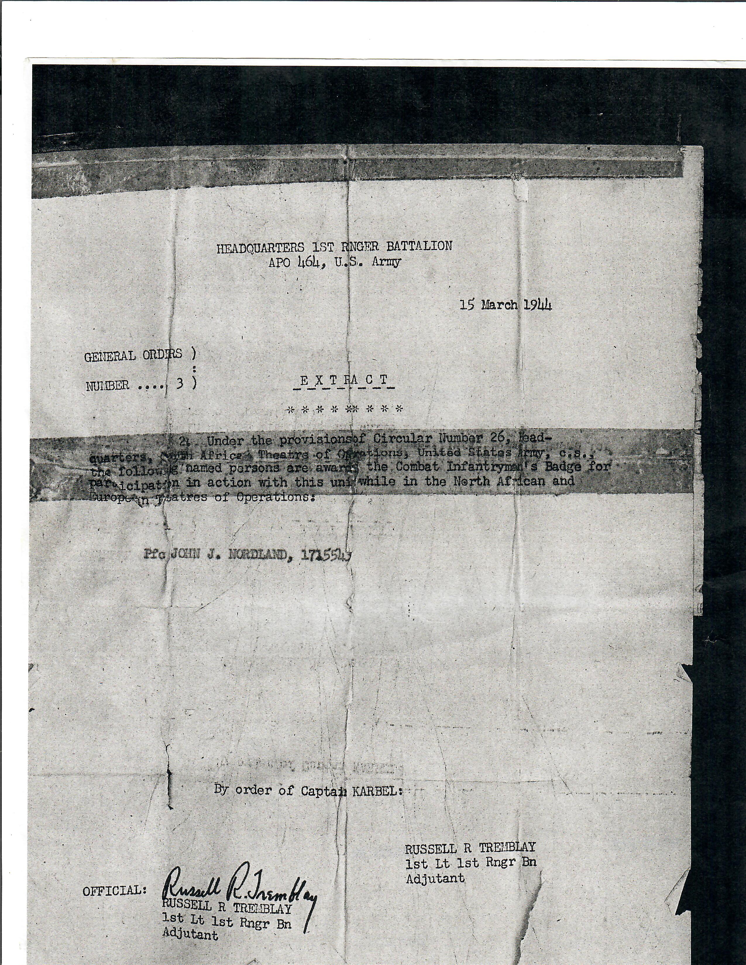 - Paperwork: Copy of Nordland’s National Archives Records Title Page, Copy of Nordland’s Title Page from the WWII Ranger Database, Two photocopied editions of the Ranger Association Newsletter, A Photocopy of Nordland’s Membership Card for the WWII Ranger Association, Photocopy of a 1943 Newspaper Clipping regarding Nordland serving overseas “somewhere in Italy” with the American Rangers, Photocopy of a July 25, 1944 Citation from the 1st Ranger Battalion authorizing Nordland to wear the Distinguished Unit Badge, a photocopy of a March 15, 1944 Citation from the 1st Ranger Battalion authorizing Nordland to wear the Combat Infantryman’s Badge.