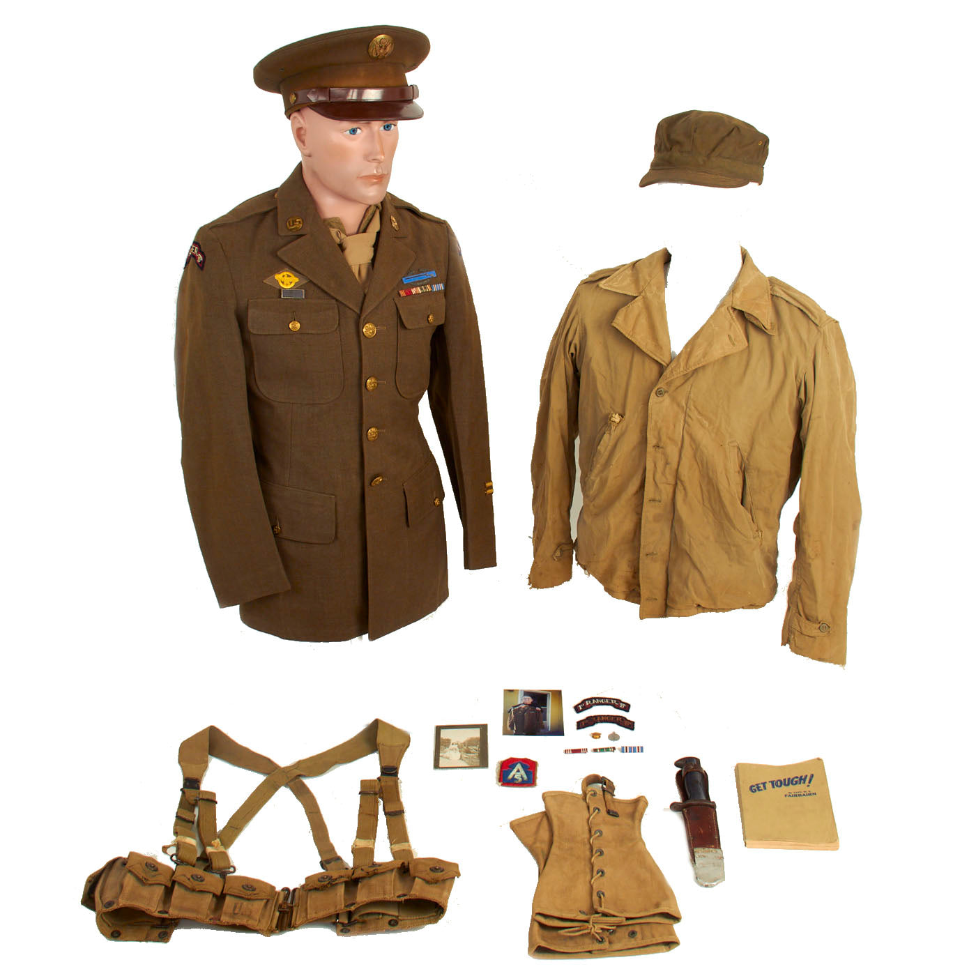 Original Item: One of a kind: This is absolutely one of the best groupings with rock solid provenance attributed to a member of Darby’s Ranger’s we have ever had the pleasure of encountering! Private First Class John J. Nordland, served as a member of the 1st Ranger Battalion (aka Darby’s Rangers”) in North Africa and Italy during the Second World War. This is an incredible grouping, which not only includes Nordland’s Dress Uniform, but also period photographs, additional insignia, copies of orders and paperwork, and his combat-worn field gear and M-41 Field Jacket! This particular set was obtained directly from the veteran in 2002, and has been in the collection of a long time collector until just recently coming to IMA.