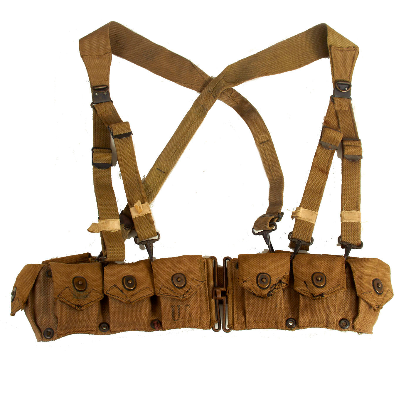 - Combat Worn M-1923 Cartridge Belt with M-1936 Field Suspenders. Condition matches the M-41 Field Jacket perfectly. Dirty, field worn. The suspenders have had the webbing taped with medical tape. Numerous field repairs to the belt… exactly as you would expect from an item with heavy field use.