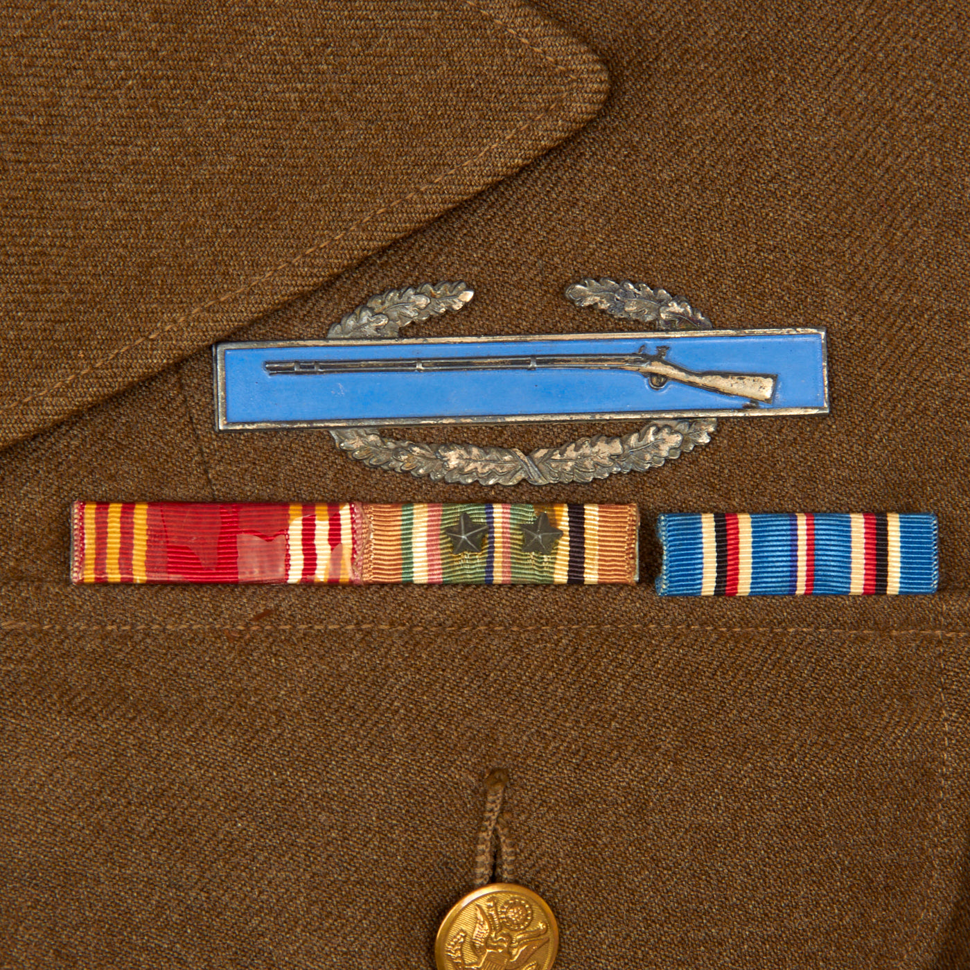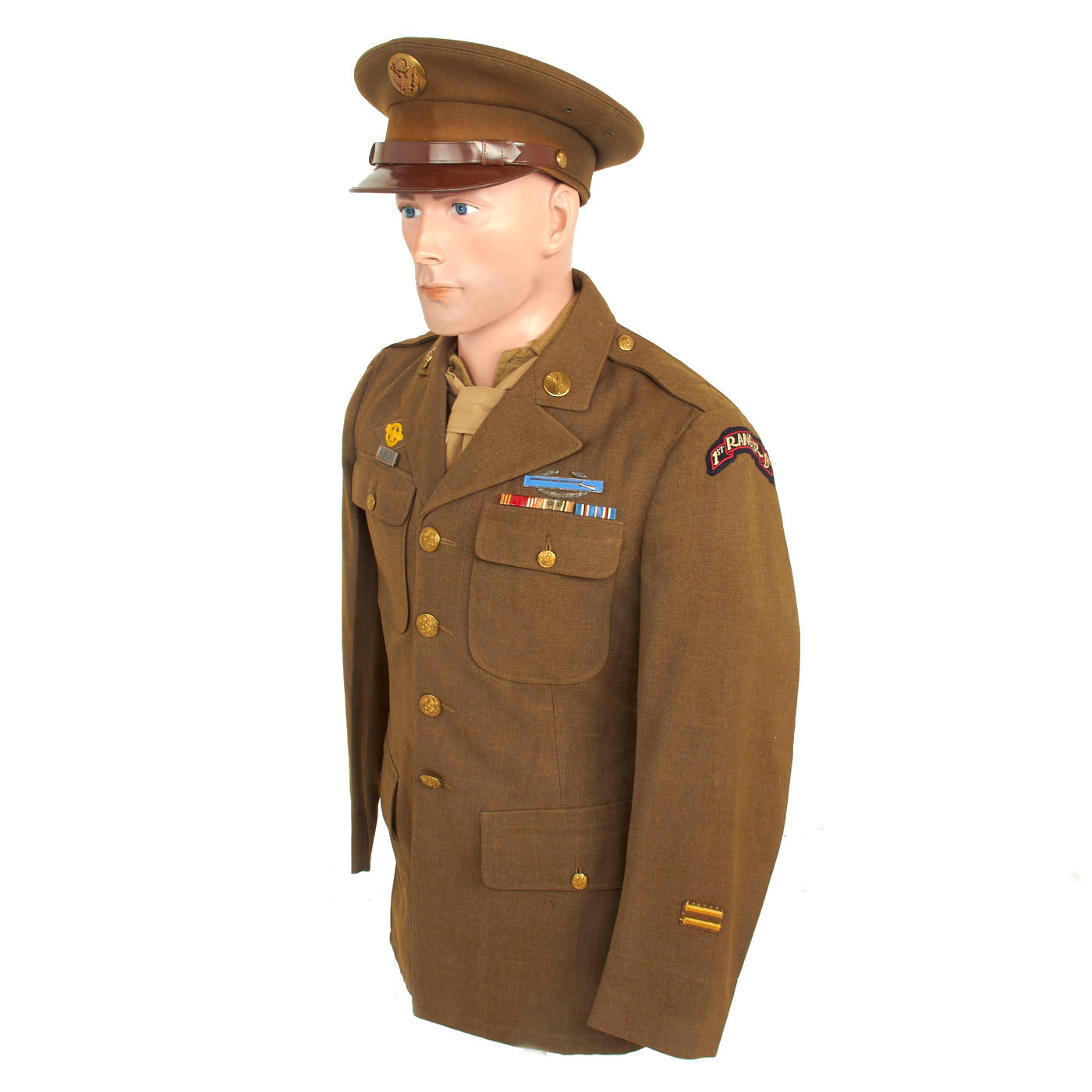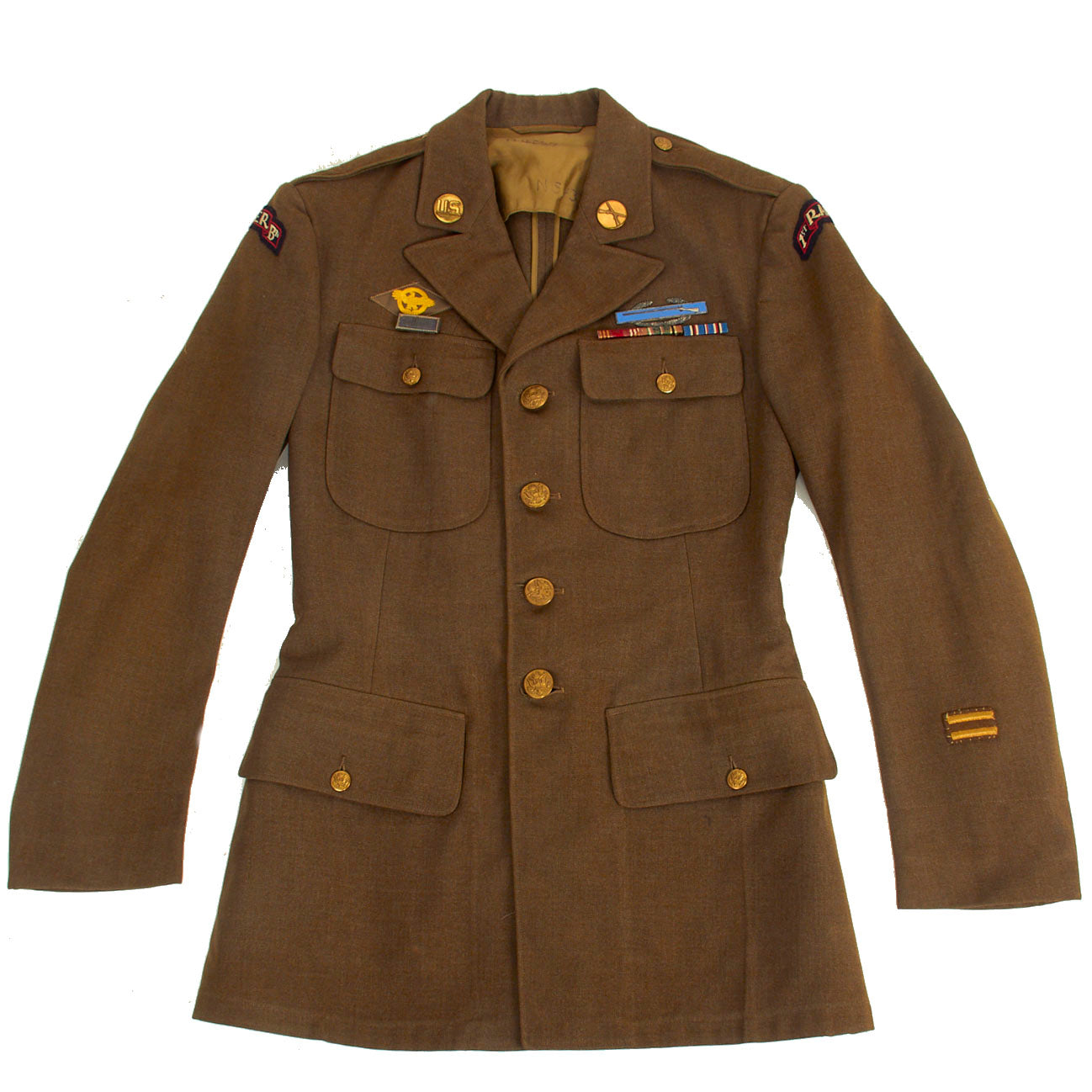 - Nordland’s uniform coat, or “A-Blouse” as they were often referred to, is unique in that it features “Double Patched” U.S. Made 1st Ranger Battalion Scroll on both the left AND right shoulder sleeves. A set of pinback “U.S.” and Infantry Branch insignia adorn the collar. His ribbons include the Good Conduct Medal, European Campaign with two Battle Stars, and a American Campaign Medal. The Good Conduct Ribbon and ETO Campaign Medal Ribbon are both mounted on the same bar, while the American Campaign Medal is separate (The included photograph of Nordland on his wedding day in 1945 features him wearing this exact uniform with just the Good Conduct and ETO Ribbons). This indicates that the American Campaign Medal was authorized later, and was likely added by Nordland at a later Date. Above the ribbons is a sterling “clutch-back” Combat Infantryman’s Badge, and above the right pocket is a pinback Presidential Unit Citation Ribbon, along with a “Ruptured Duck” sewn above. On the left cuff are sewn two overseas bars, denoting a year spent overseas. The jacket is a typical U.S. Issue Jacket, size 38R, and dated January 13, 1942. Nordland’s GI Laundry number is written inside the lining of the jacket at the nape. The uniform in its entirety is exactly the way it came from John Nordland in 2002. Accompanying photographs show an elderly Nordland posing with this exact jacket in front of his home in Albert Lea, Minnesota. The Uniform grouping has been in a private collection ever since.