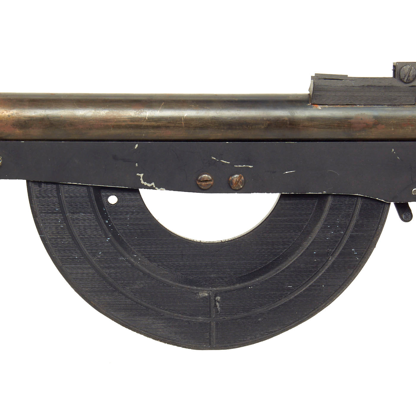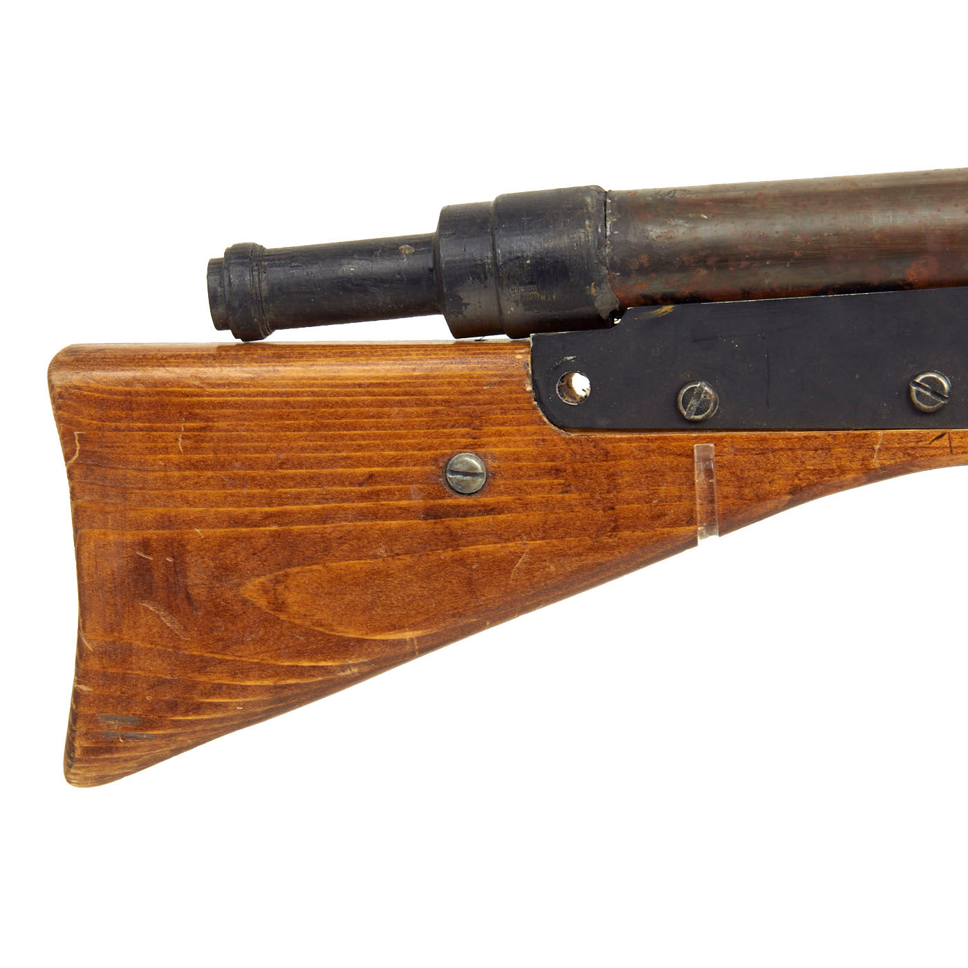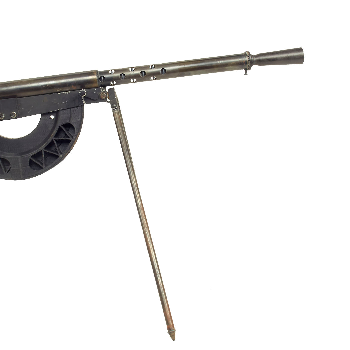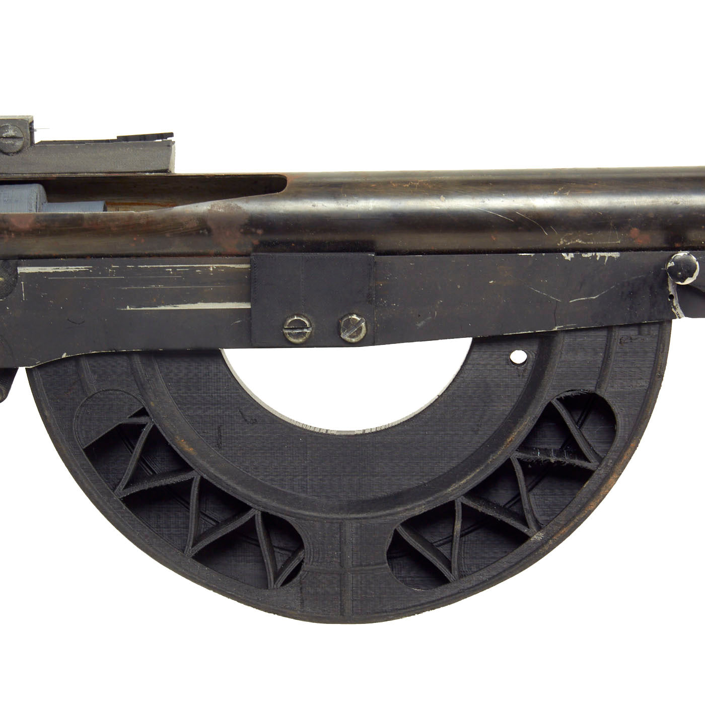 This is a lovely “homemade” Chauchat “Machine Rifle” which consists of 3D printed parts! We have no way of knowing which film this was used in if it was even used at all, regardless it is lovely! The 3D printed parts consist of the compensator, trigger assembly, barrel, bolt, sight and a few more of the internal components. The layering on the printed parts is really nice but they do appear to be uncured and the layering is visible slightly. The block that was printed to secure the bipods is unfortunately cracked and would need to be repaired to display properly.