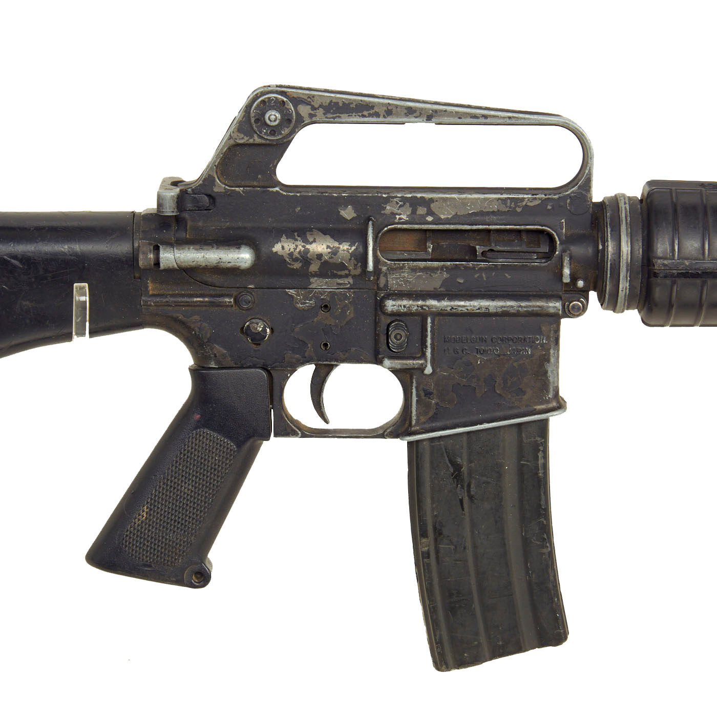 OMGC-M16/CP Replica M16A1 Cap Plug Firing Gun by MGC (Model Gun Corporation) Japan is in decent condition but we do not know if it is still capable of firing caps. It is nicely marked MGC and MADE IN JAPAN. This particular model is the MGC-M16/CP. These work with replica "cartridges", which have small caps "plugged" into the front of them, which then is detonated by the replica bolt. These would then be ejected like a real spent cartridge, and could be reloaded with additional caps.