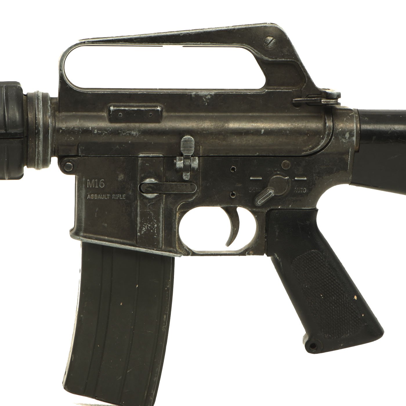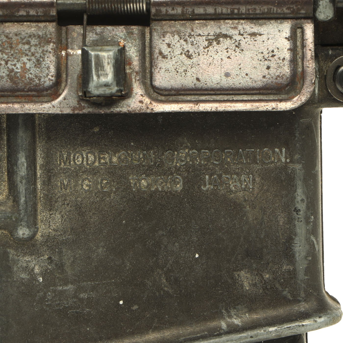 Original Item: Only One Available. This is a great U.S. M16A1 "Plug Fire" replica gun, made by the well-known Model Gun Corporation of Japan. This particular model is the MGC-M16/CP. These work with replica "cartridges", which have small caps "plugged" into the front of them, which then is detonated by the replica bolt. These would then be ejected like a real spent cartridge, and could be reloaded with additional caps. The cap gun is no longer functional and the barrel is slightly bent.