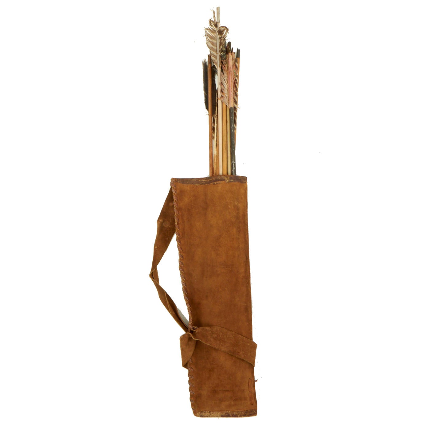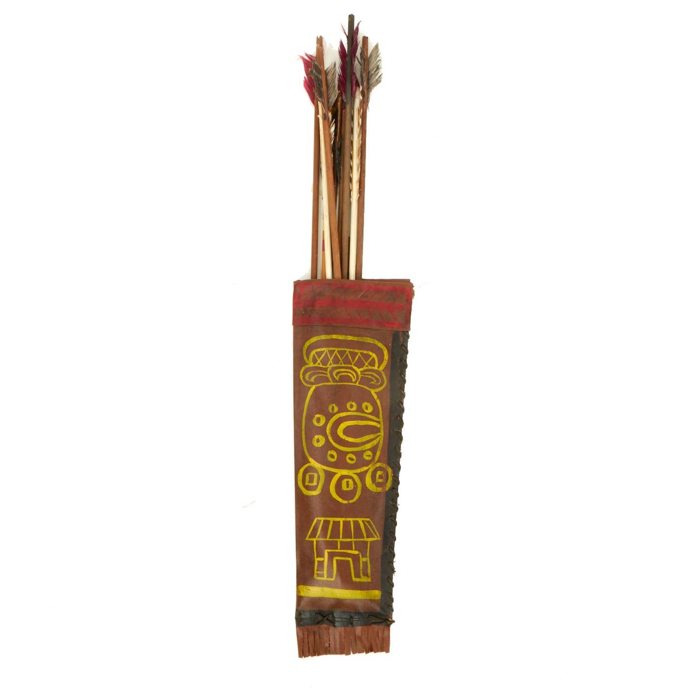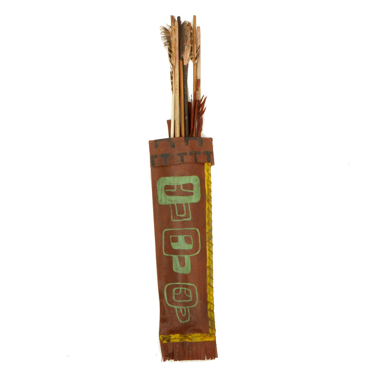 - 3 Quivers: A quiver is a container for holding arrows, bolts, darts, or javelins. It can be carried on an archer's body, the bow, or the ground, depending on the type of shooting and the archer's personal preference. One quiver is constructed of what appears to be real leather and is without any design. The other two quivers are similar in design and are constructed of a faux leather and feature imitation Native American style artwork on the face.