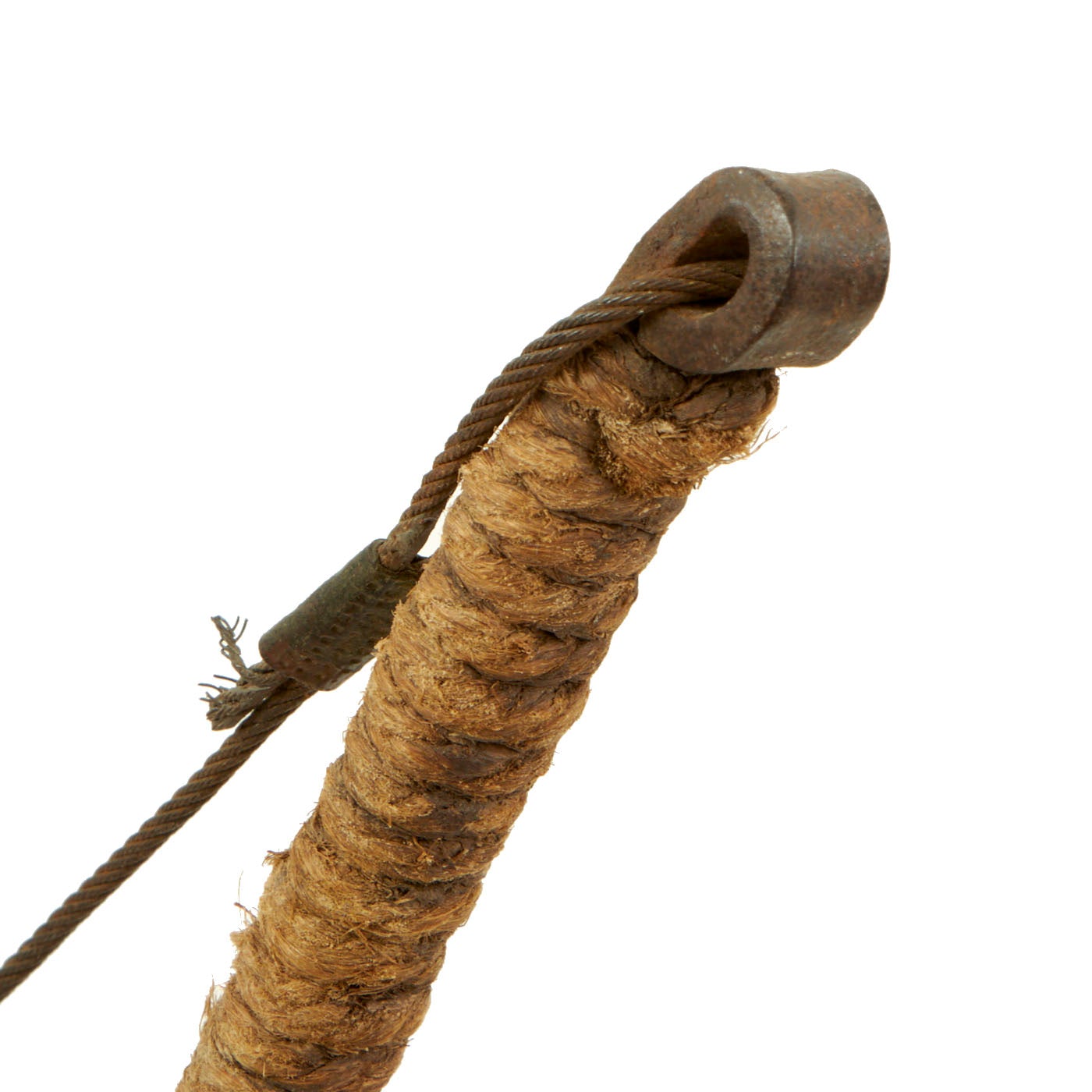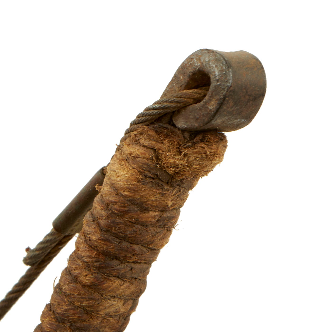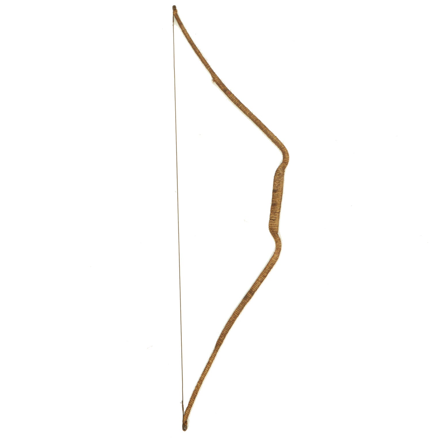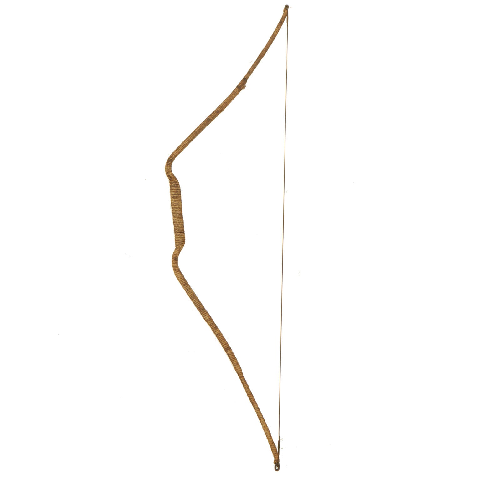 - Bow: The bow is constructed of steel and is wrapped in a heavy burlap type string. The drawstring used on the bow is thin gauged steel cable to better increase the overall durability of the bow while being used. From end to end the bow measures approximately 50”. The bow itself has about a 5 to 10 pound draw weight.