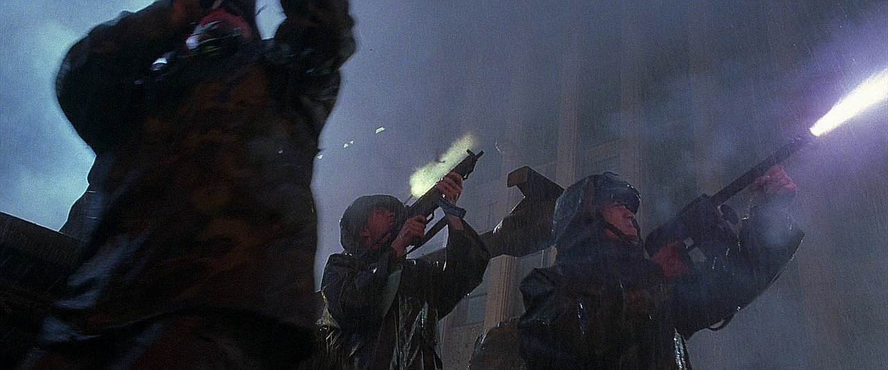 During the film When Godzilla charges a U.S. Army roadblock, some of the soldiers are shown firing at him with, oddly, Street Sweeper shotguns, a weapon that has never been used by any branch of the U.S. military. U.S. soldiers fire upon Godzilla during the second big confrontation with the monster. The soldiers are armed with M4A1 carbines, Street Sweeper shotguns, and at least one Heckler & Koch HK94A3 chopped and converted to resemble an MP5A3.