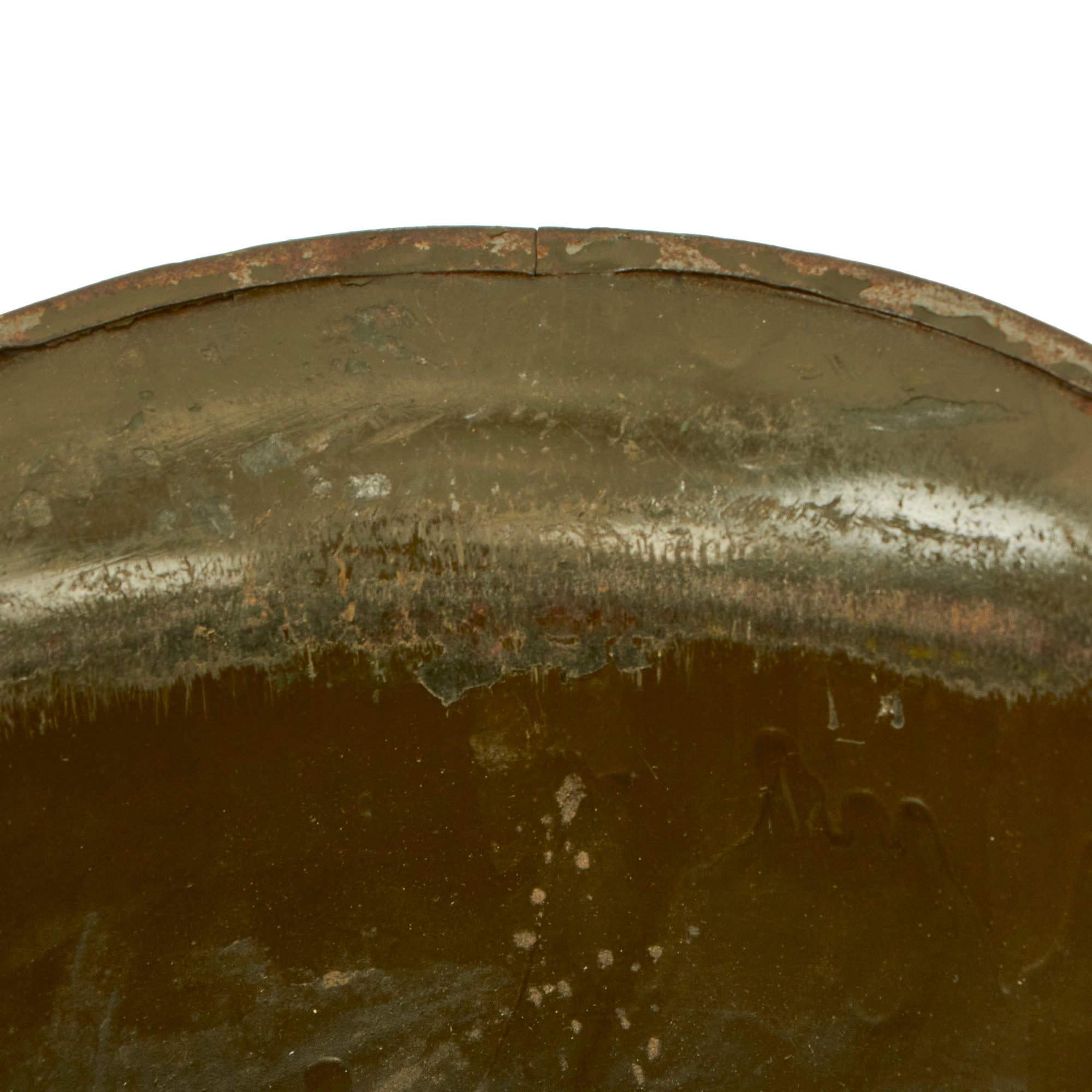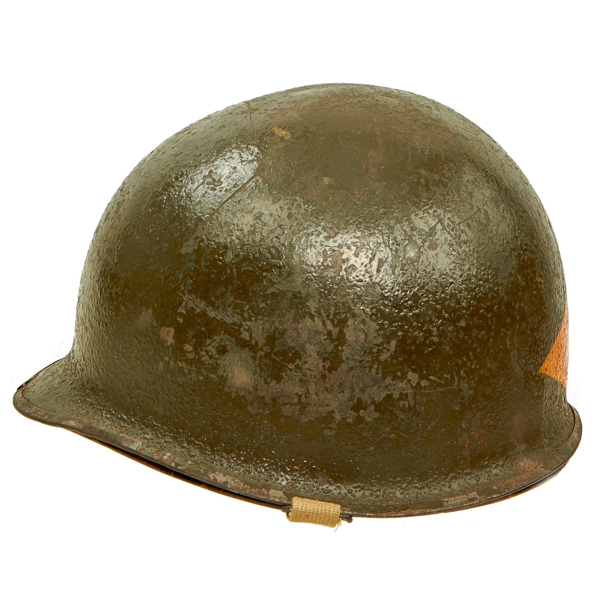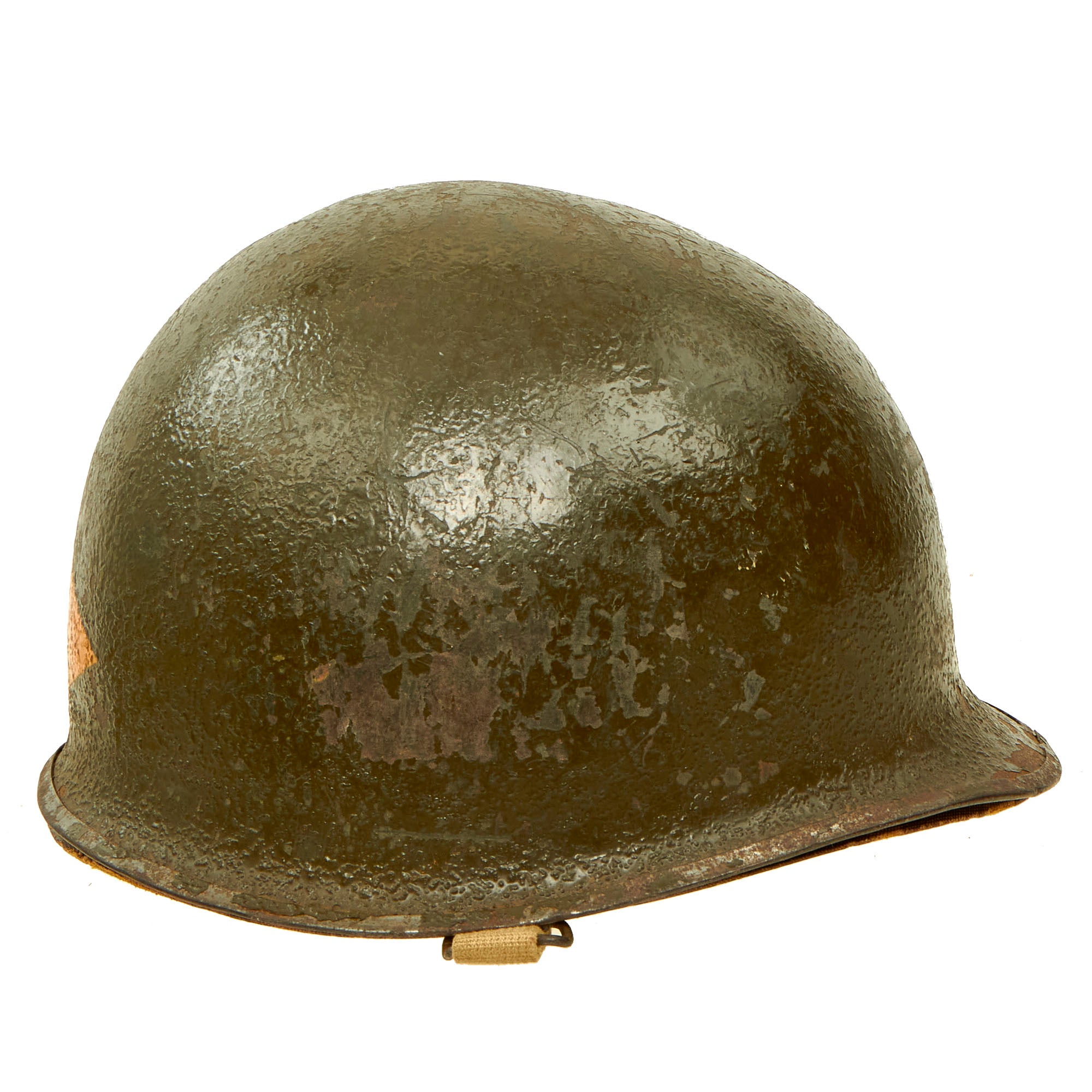 There is unfortunately no provenance we can provide for this helmet, aside from the source from which it came, which is why we are able to offer it at such an attractive price. It should be noted that when these items were originally sold back in 1998, none of these items were accompanied by a Certificate of Authenticity. They were originally sold on the reenactor market, as reenactors at the time, it was believed, would make the ideal customer who could repurpose these goods. The inside of the shell does not have a visible “SPR” stamp but it does have the appearance of having multiple markings on the interior of the shell.
