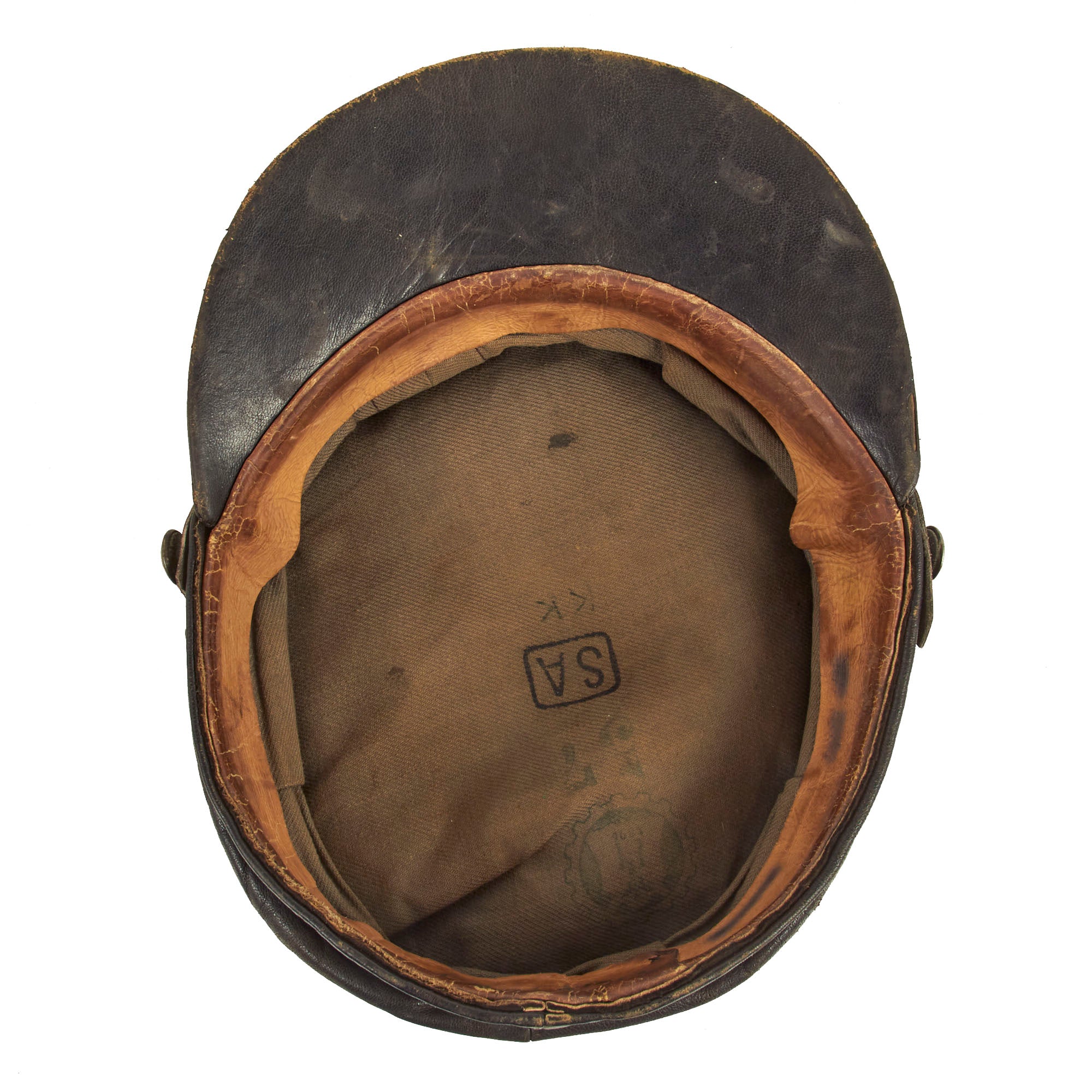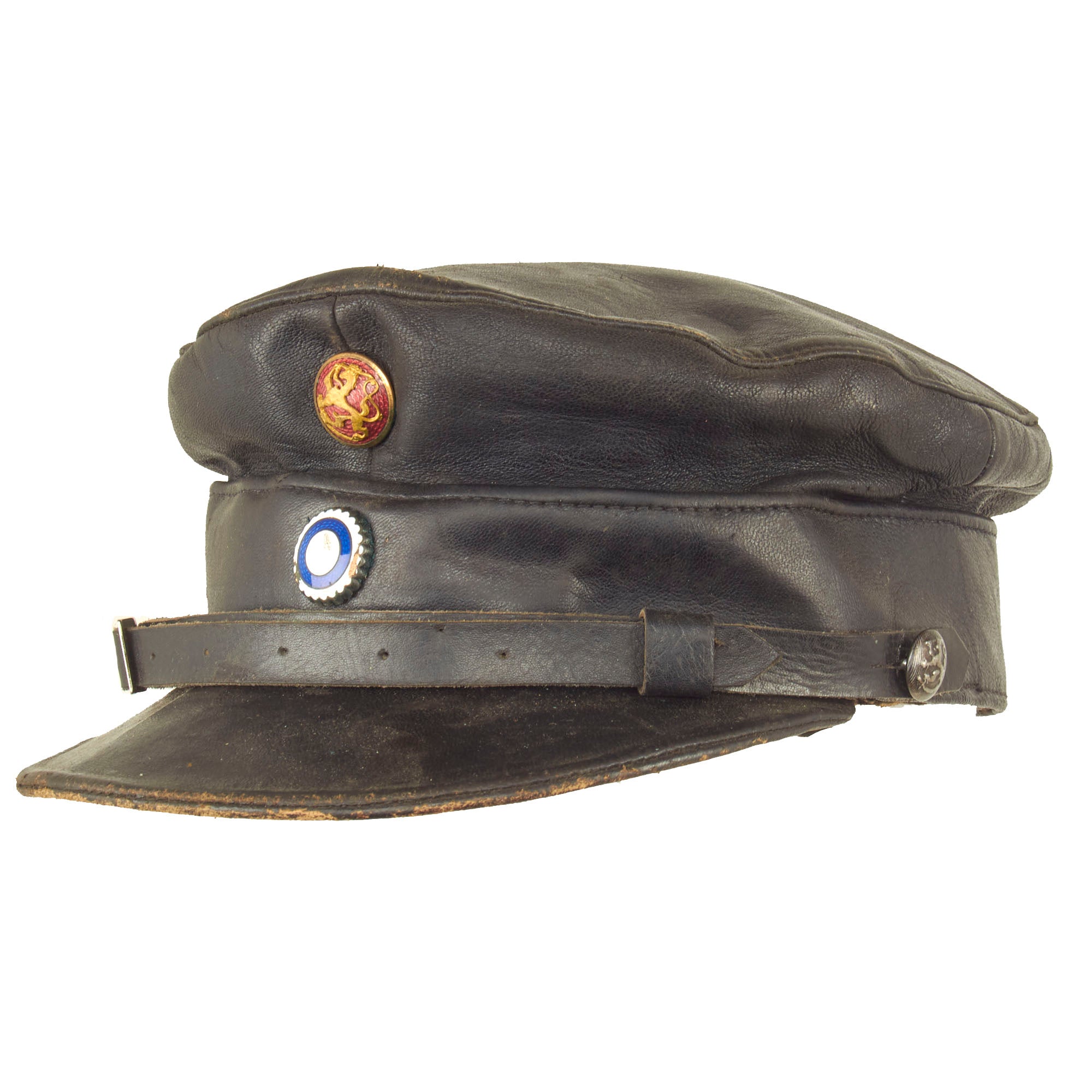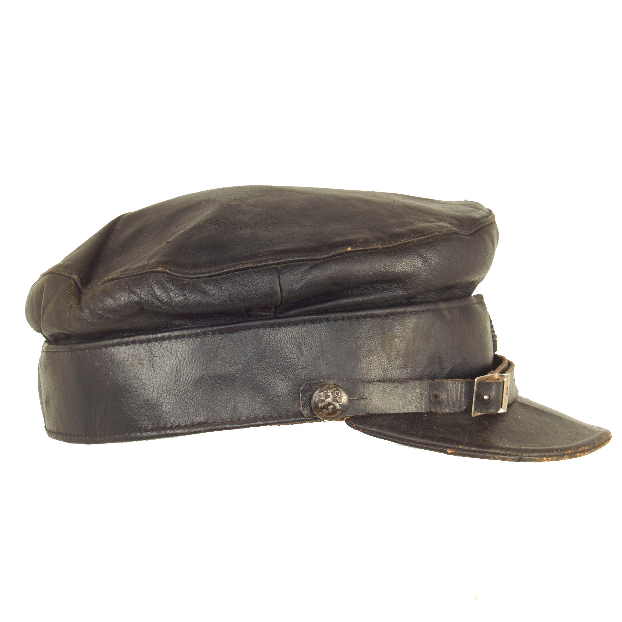 Original Item: Only One Available. This is a wonderful example of a rather uncommon WWII Finnish Civil Guard peaked visor. The visor itself is constructed entirely out of leather except for the dark gray cotton lining. The cap itself is complete and has all original devices and buttons in place. There are markings in the crown and one of which appears to be a size of 57.