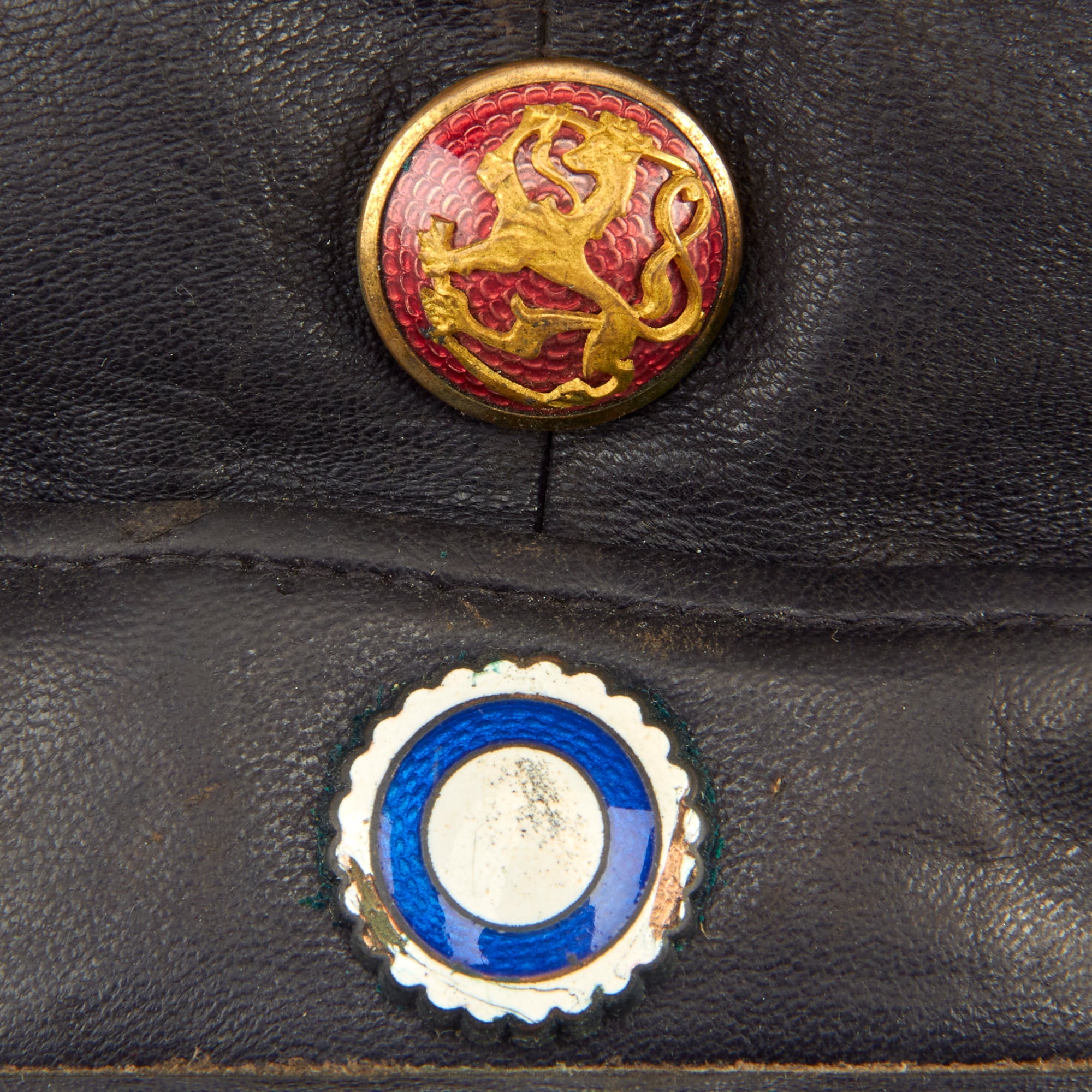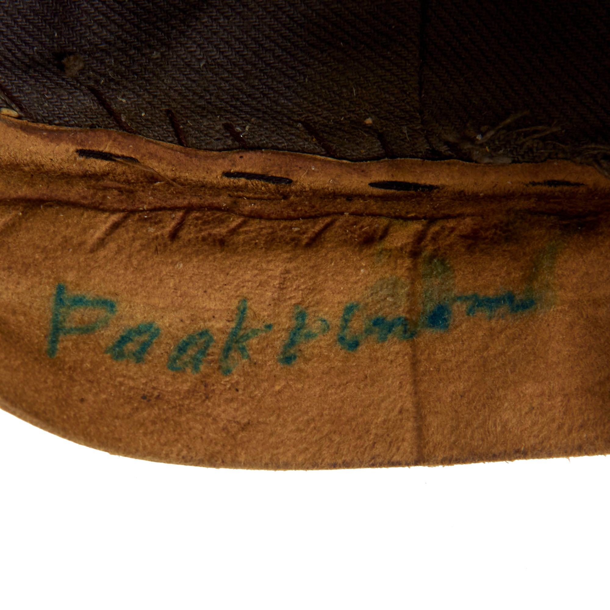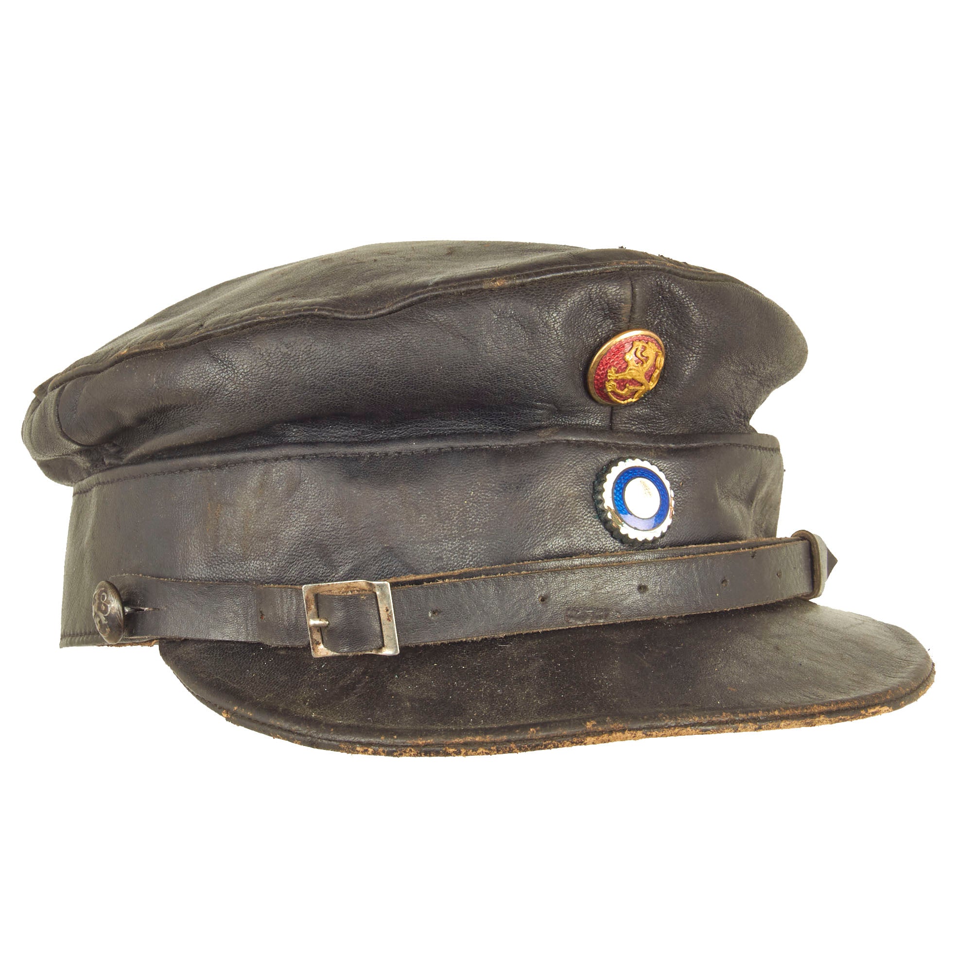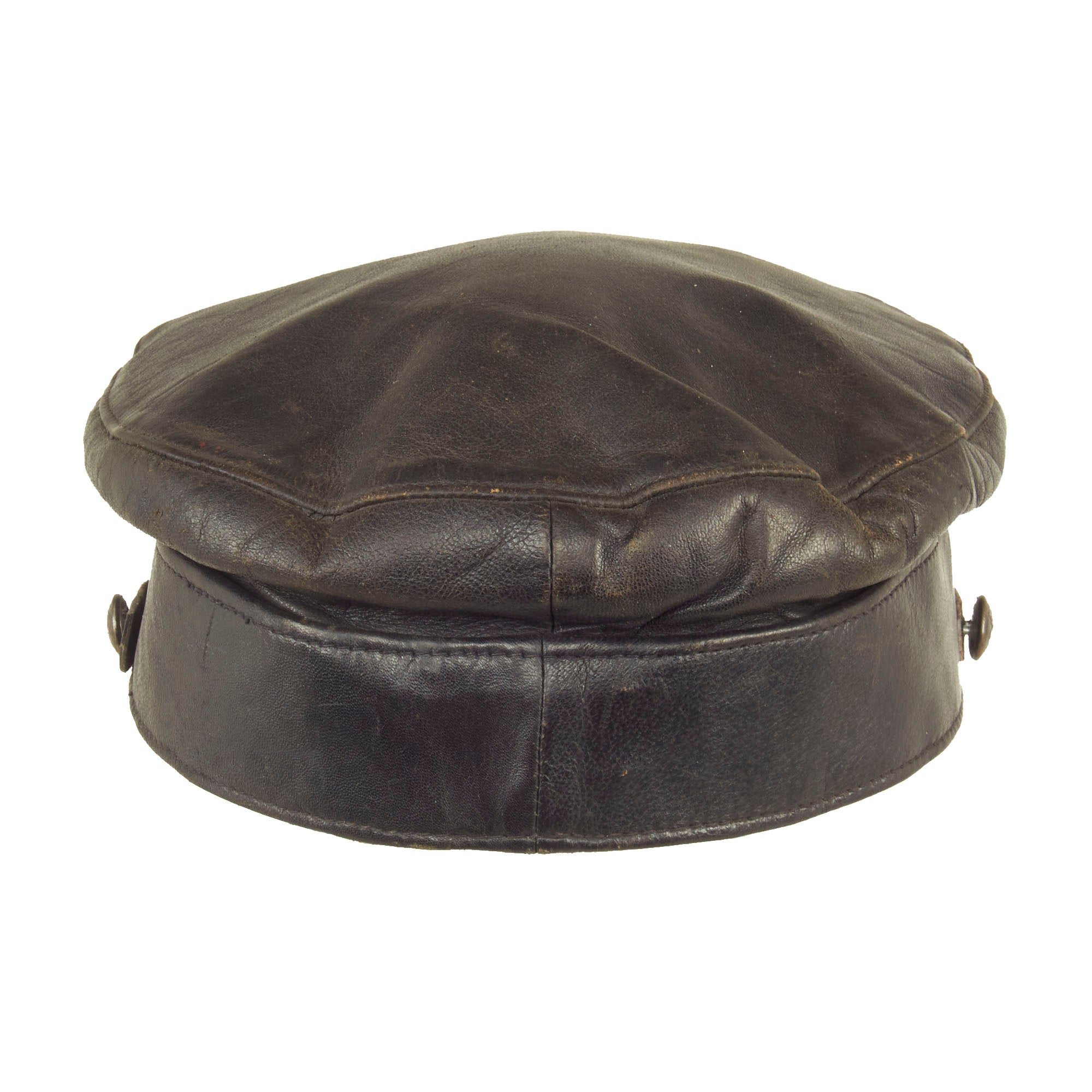 Original Item: Only One Available. This is a wonderful example of a rather uncommon WWII Finnish Civil Guard peaked visor. The visor itself is constructed entirely out of leather except for the dark gray cotton lining. The cap itself is complete and has all original devices and buttons in place. There are markings in the crown and one of which appears to be a size of 57.