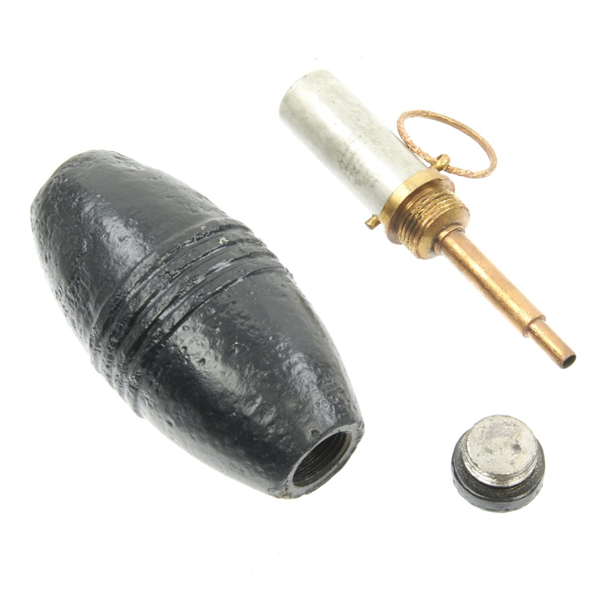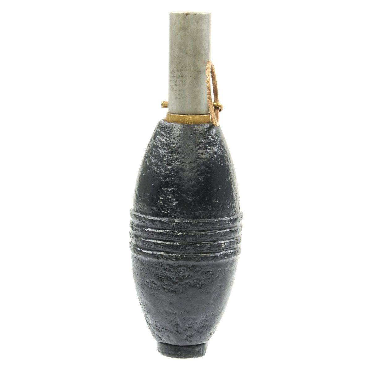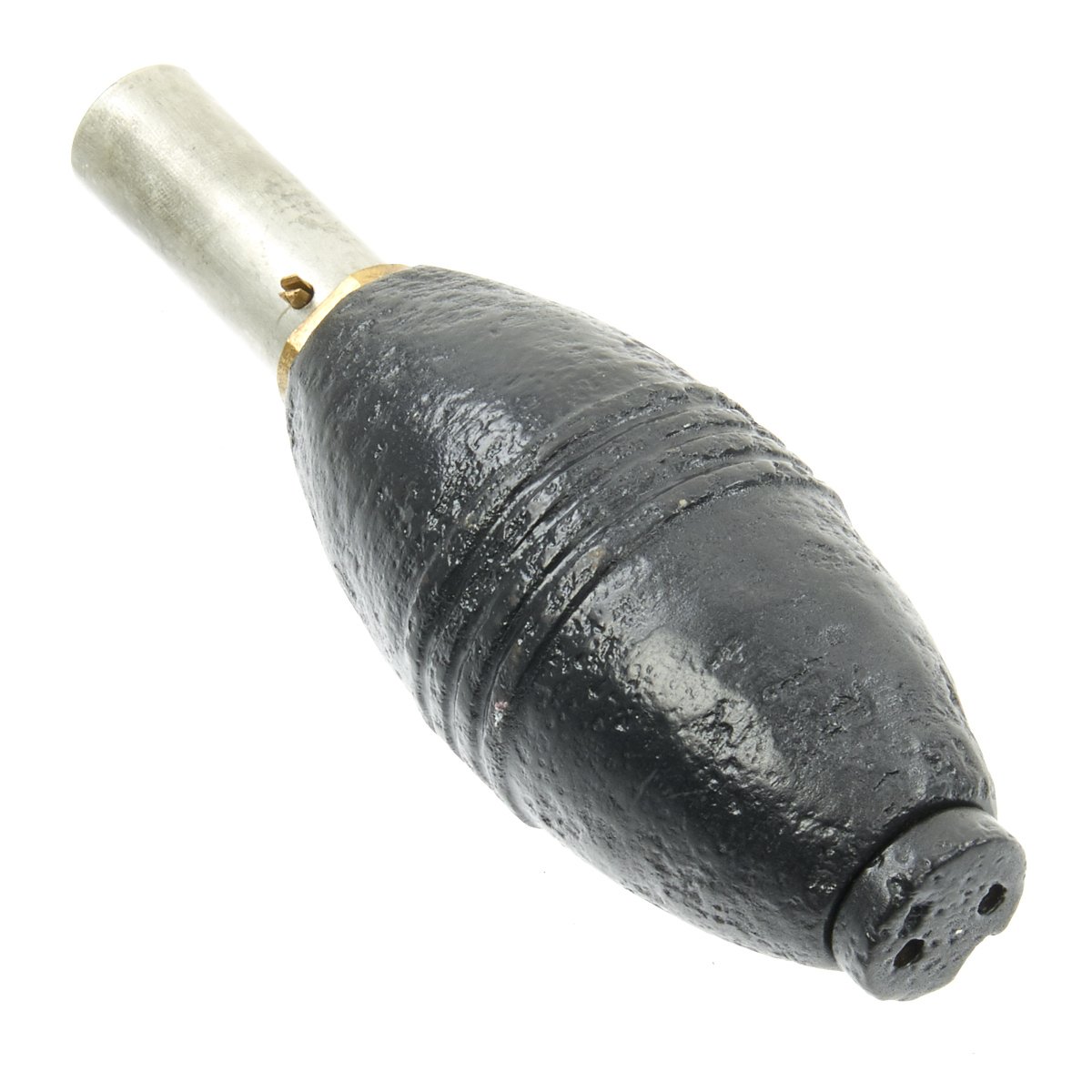 This 47mm mortar shell was used by the Finnish army during WW2, and had a System 32 fuse fitted. The tail section was removed and the base was sealed with a plug. It was used as an offensive hand grenade despite the mortar name.