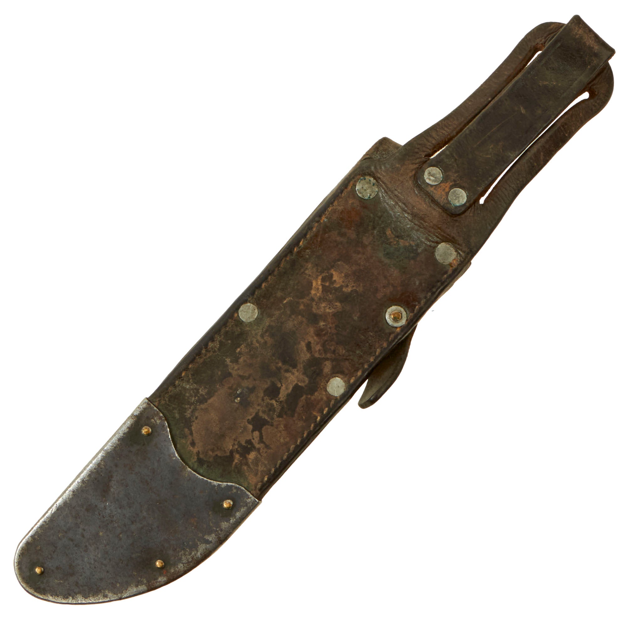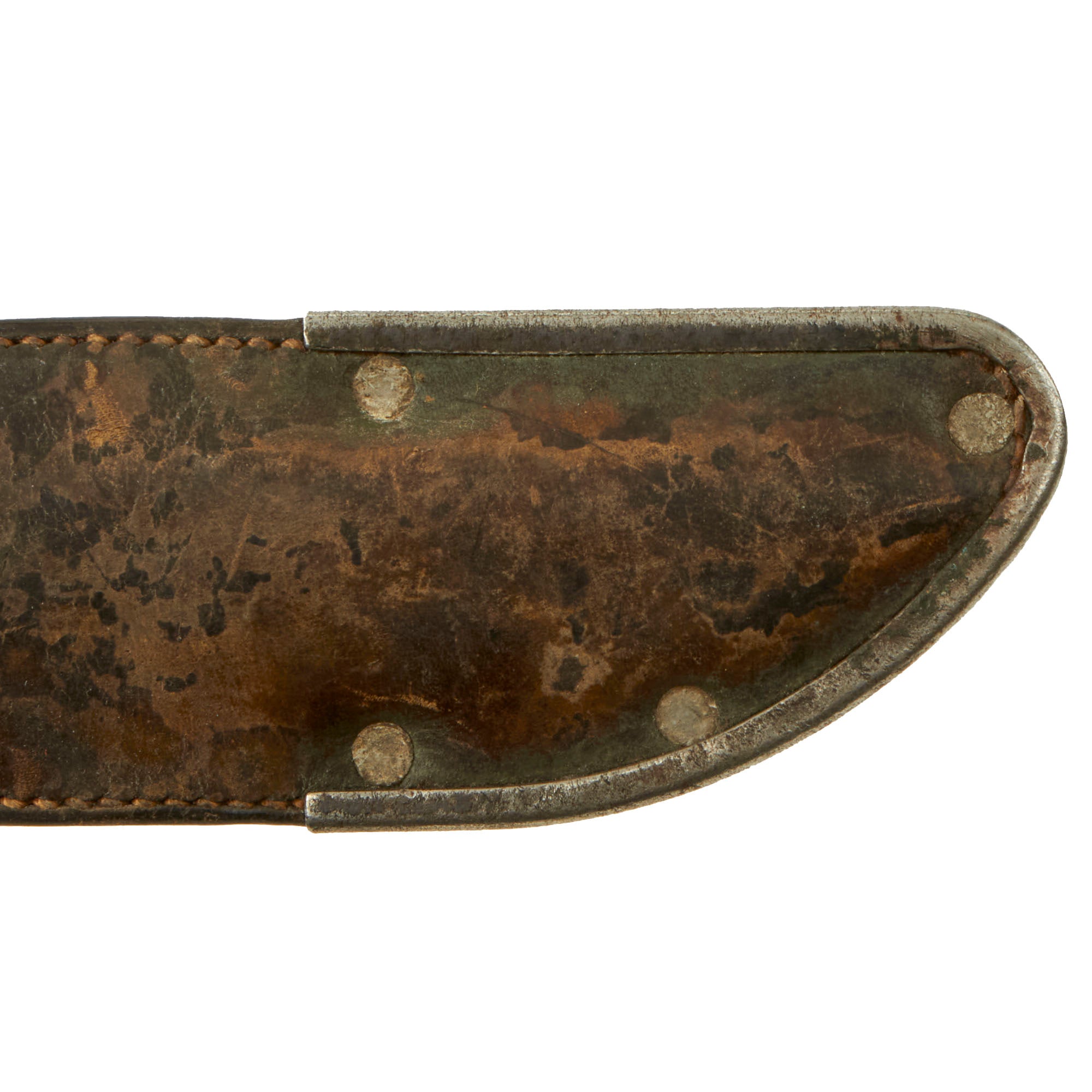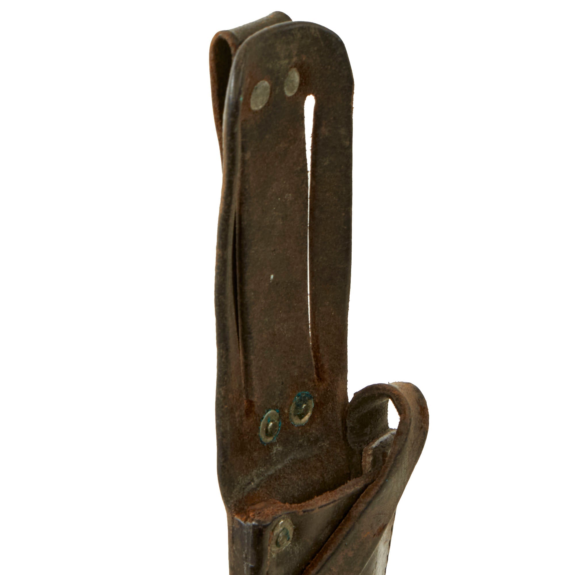 There is a good amount of verdigris on the metal fittings of the scabbard as shown. The scabbard still retains its lower metal plate and belt loop. This scabbard design is interesting in how the leather securing strap wraps around the crossguard.