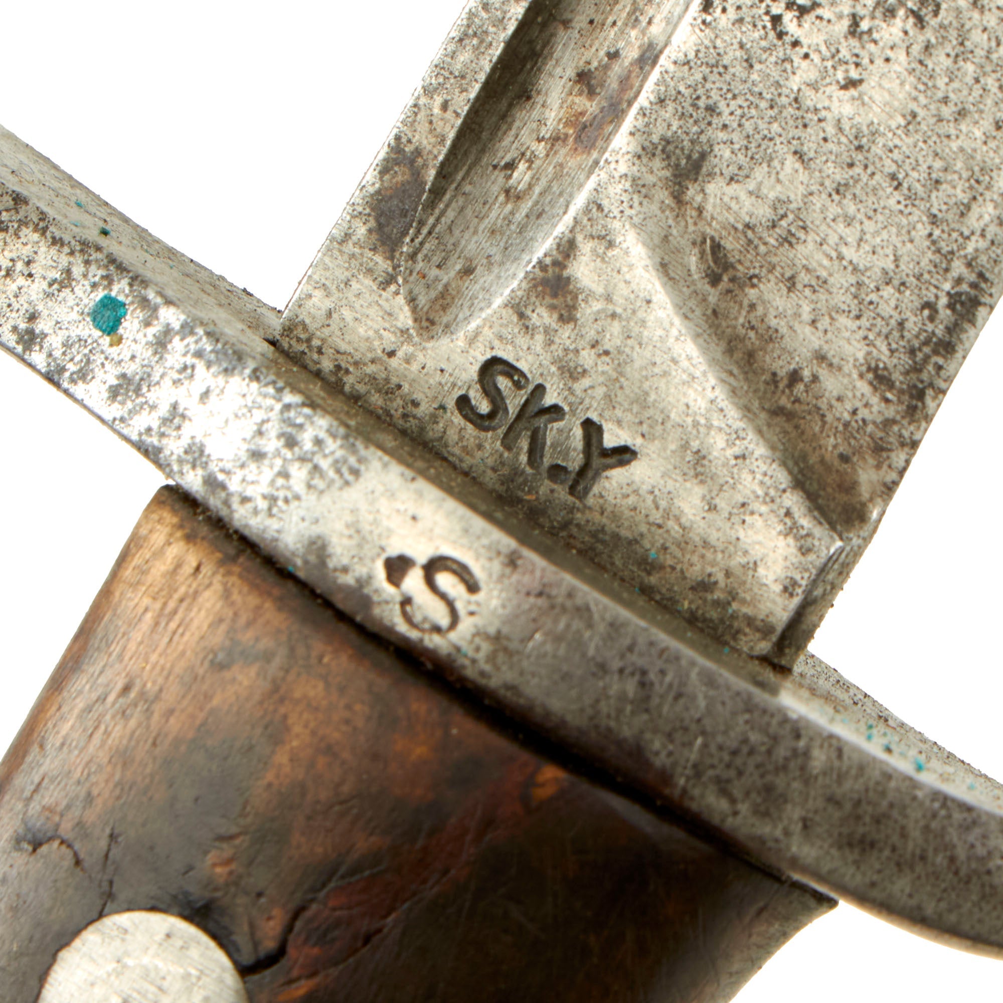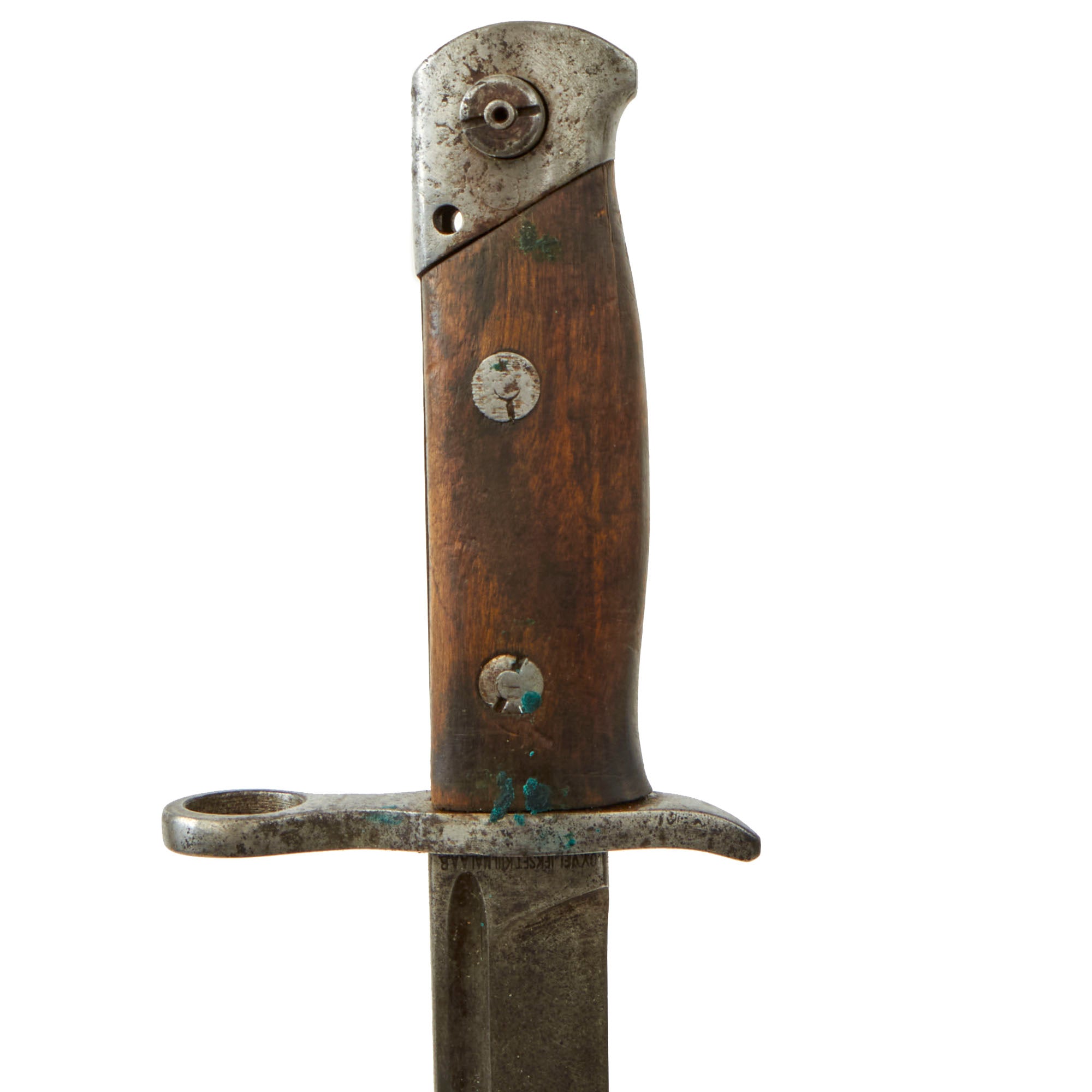 Original Item. Only One Available. This is an extremely scarce bayonet produced for the Finnish Army and Civil Guard. According to Kiesling, the Civil Guard ordered 10,000 bayonets in 1941, most were scrapped in the 1970's. This example comes with its SK.Y marked green leather scabbard of riveted and sewn construction.