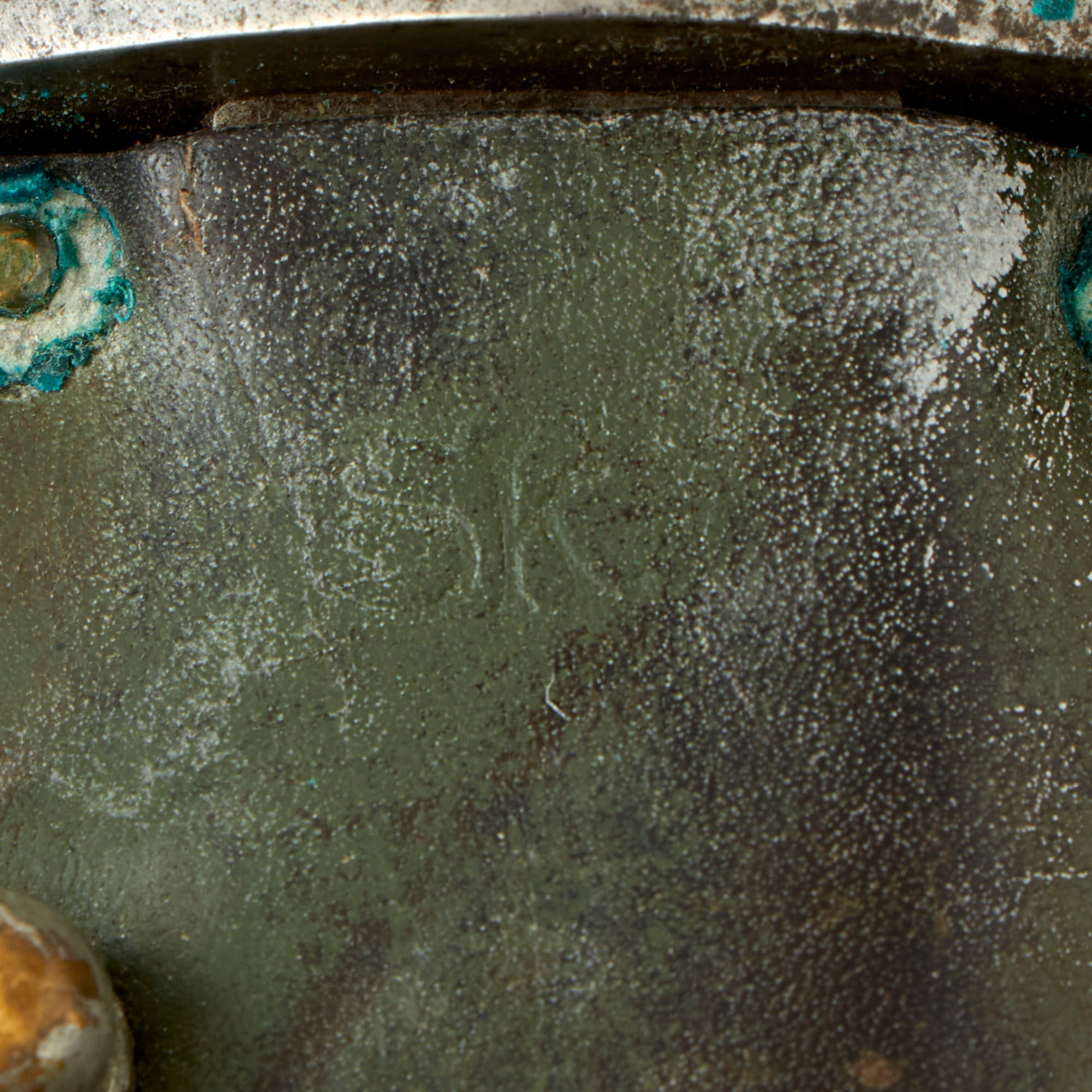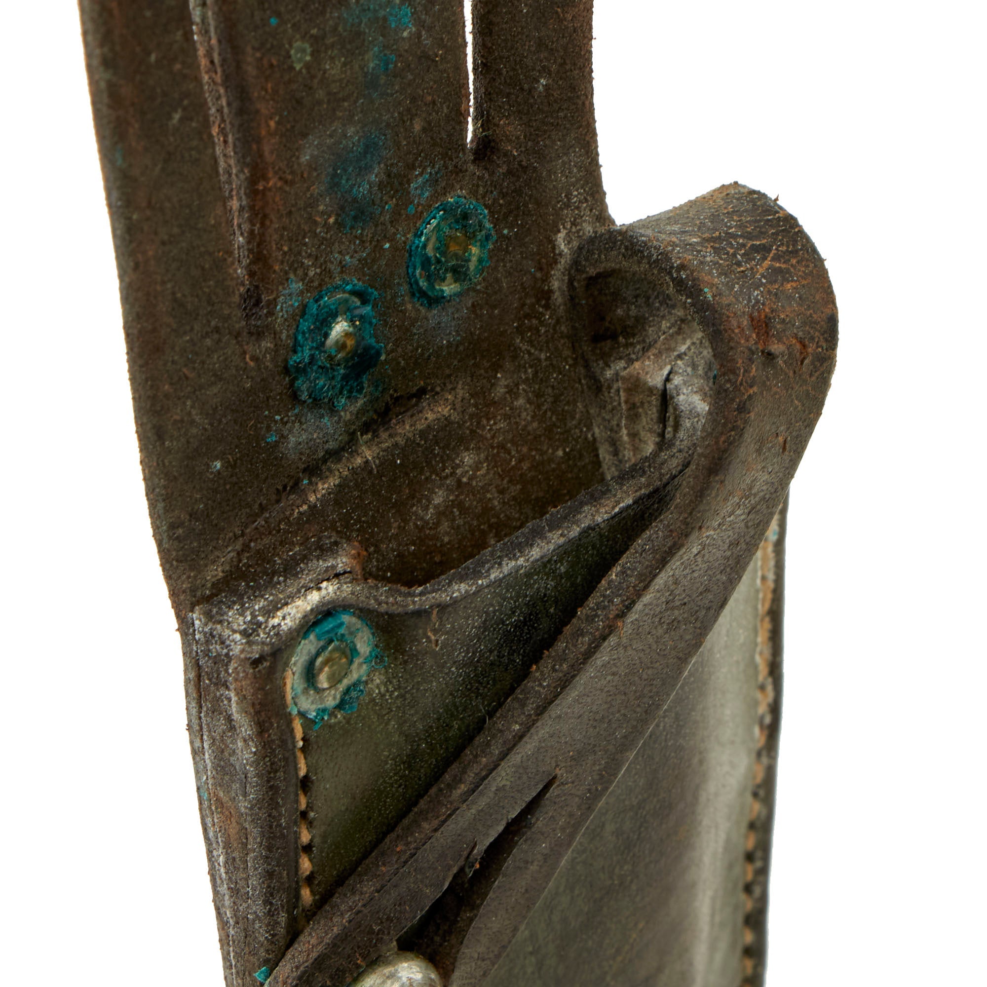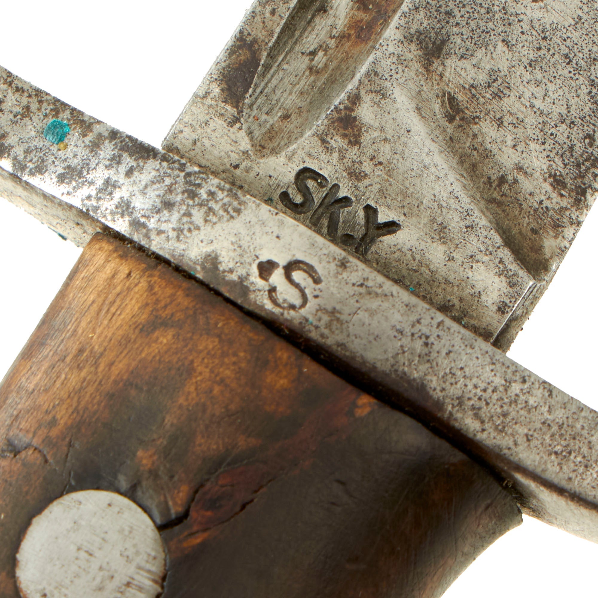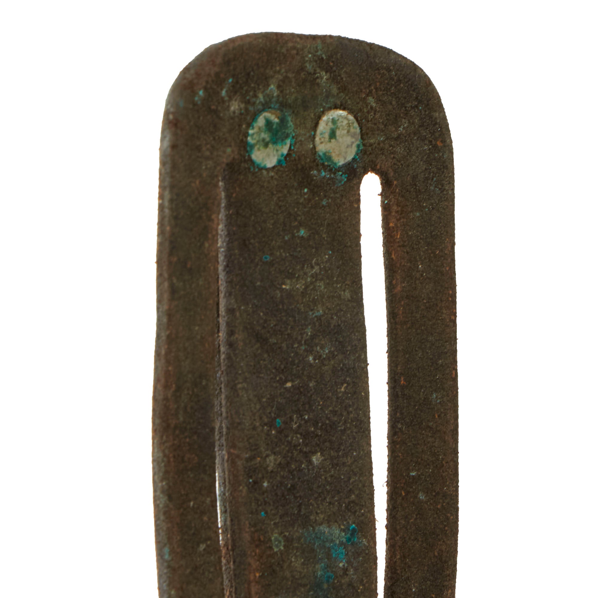 The blade is clean, showing typical service use with a few very shallow nicks in the edge towards the base. The ricasso is stamped SK.Y on one side and O.Y. VELJEKSET KULMALAAB on the other. The one piece grips show typical age and wear with much of the original varnish finish remaining. There is a heavy amount of verdigris on the metal fittings of the scabbard which has spread a bit onto the bayonet itself. The scabbard still retains its lower metal plate and belt loop. This scabbard design is interesting in how the leather securing strap wraps around the crossguard.