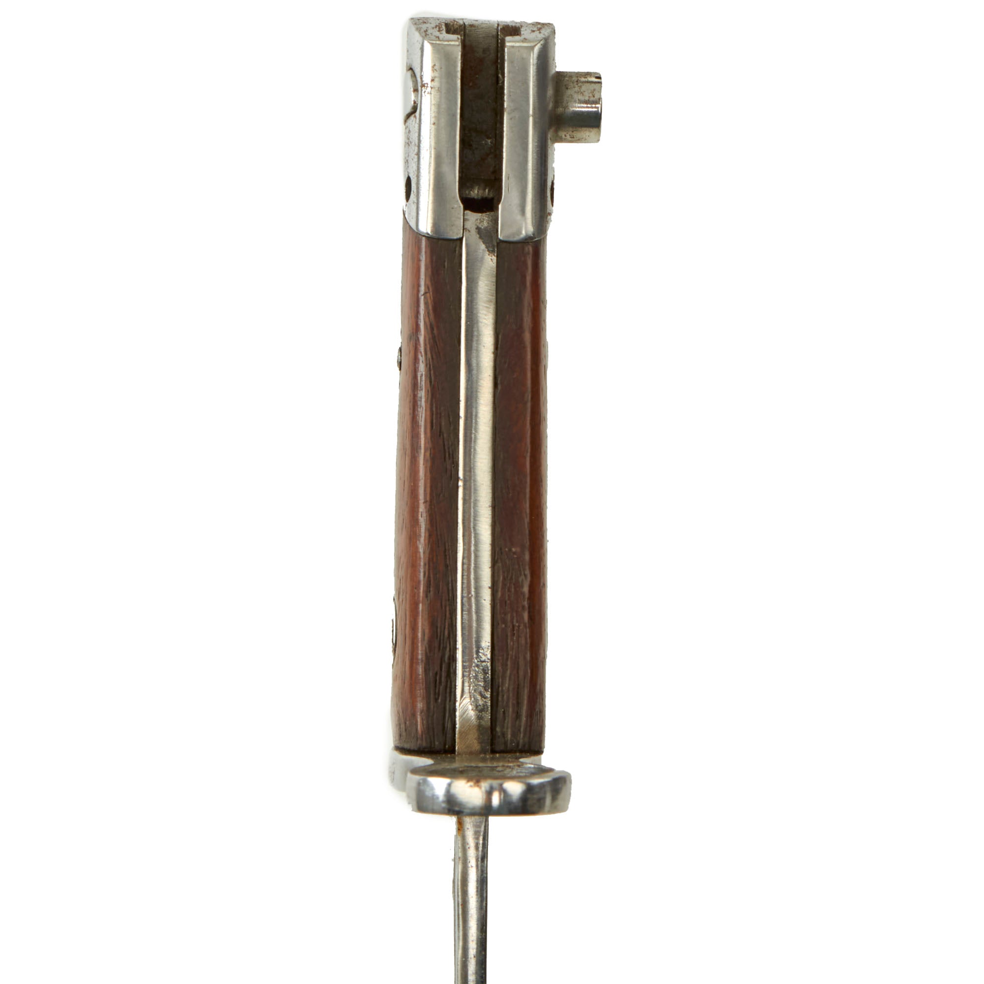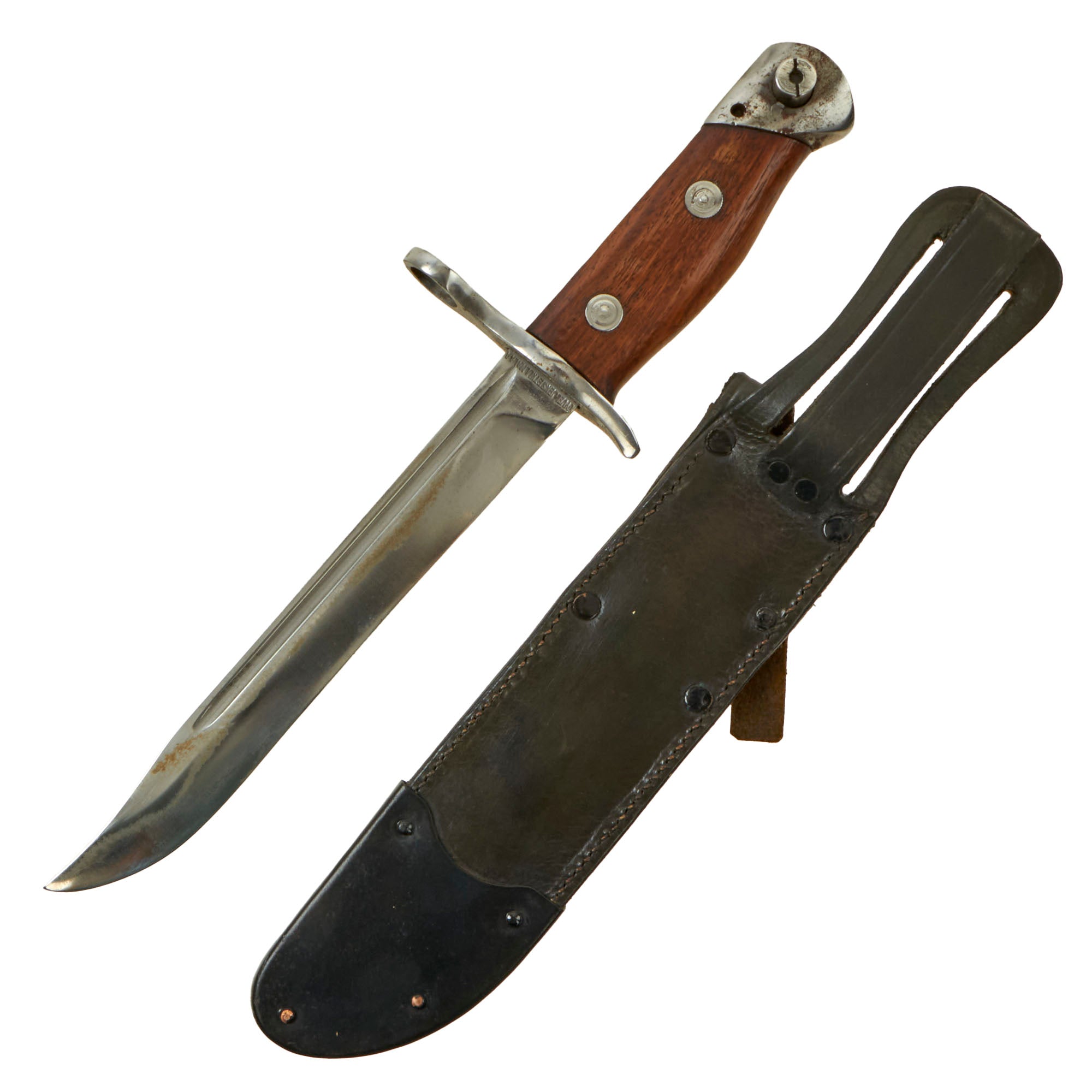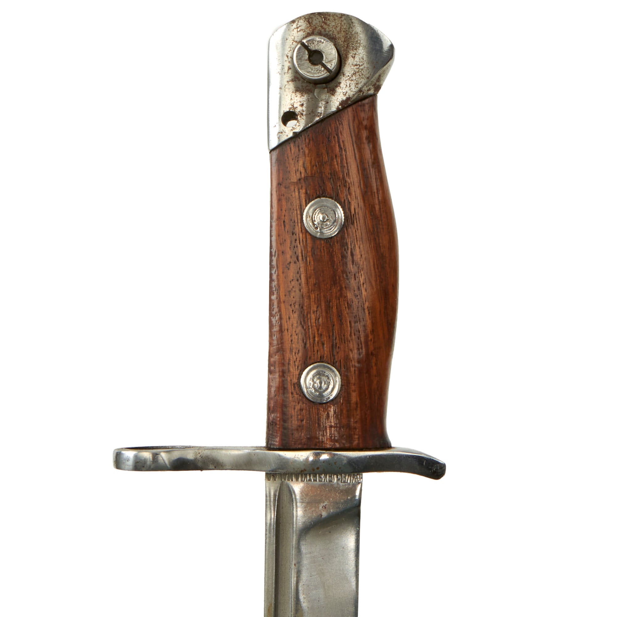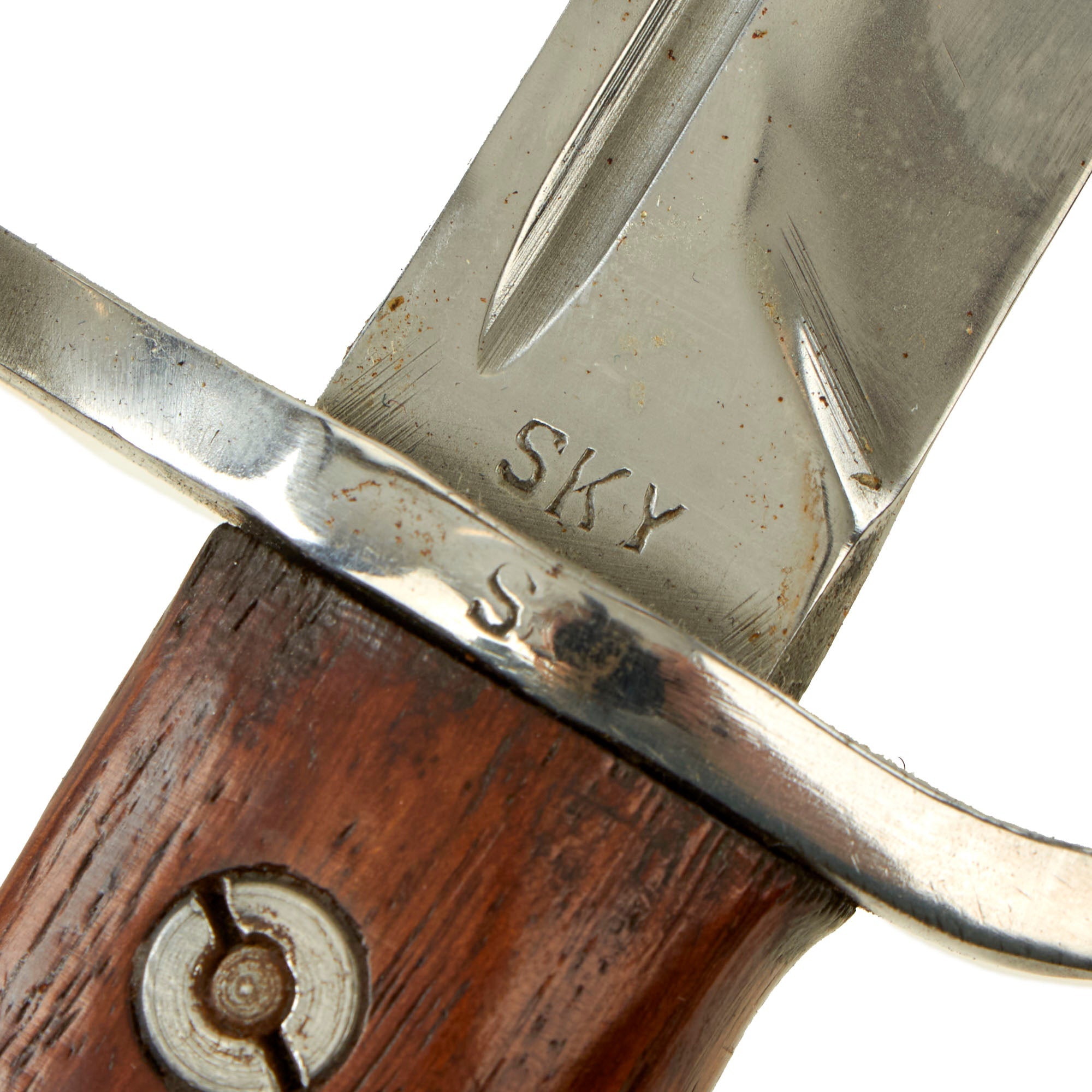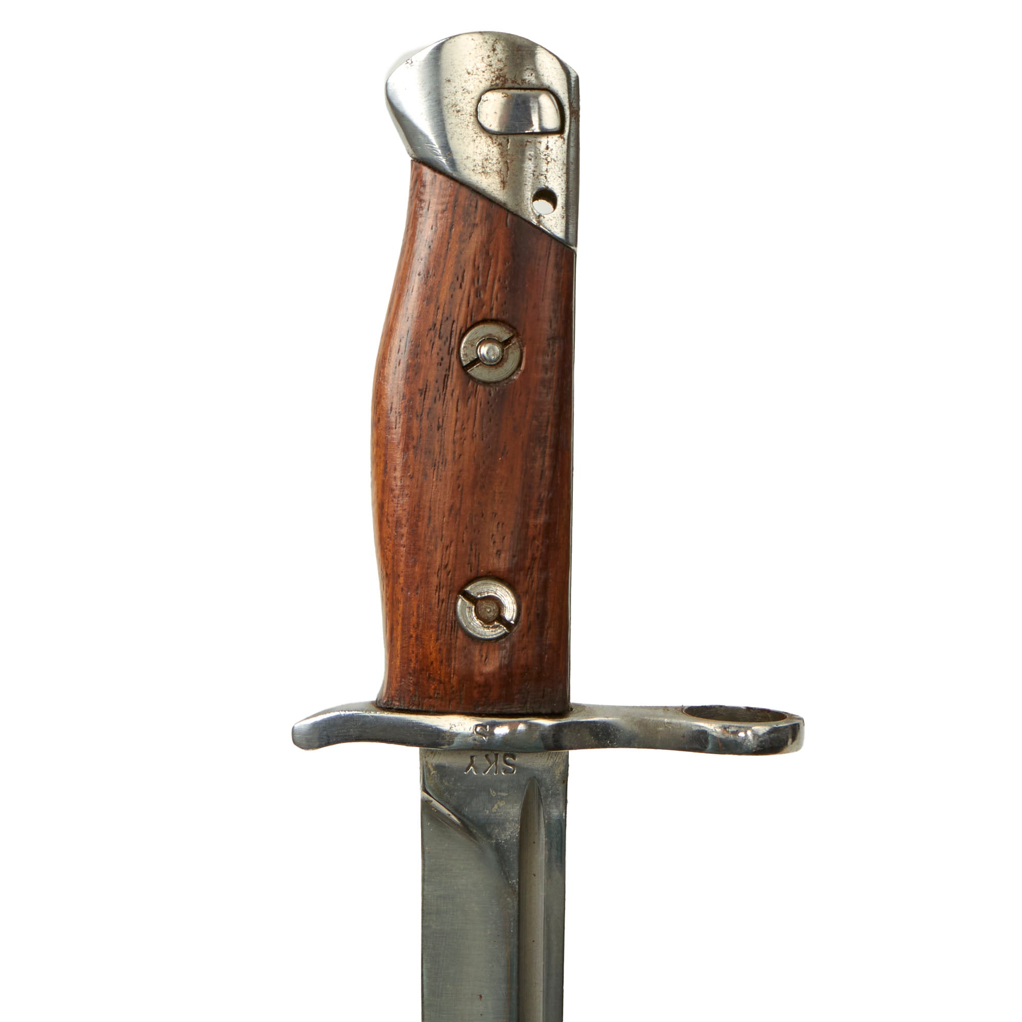 Original Item. Only One Available. This is an extremely scarce bayonet produced for the Finnish Army and Civil Guard. According to Kiesling, the Civil Guard ordered 10,000 bayonets in 1941, most were scrapped in the 1970's. This example comes with its SK.Y marked green leather scabbard of riveted and sewn construction.