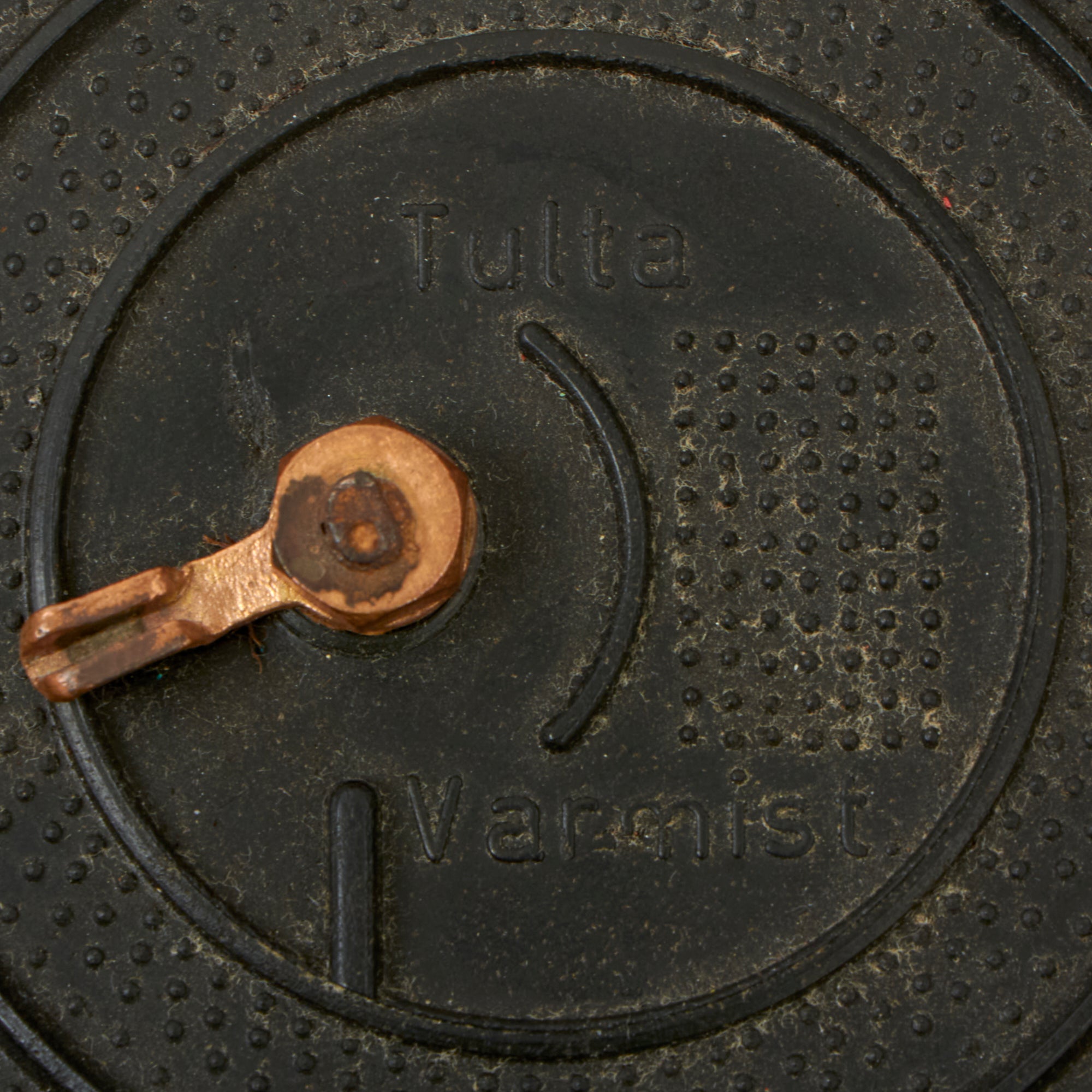 The Finnish military introduced this Anti-Personnel (AP) landmine in 1942. It has a bakelite (plastic) body with a cylindrical jar and a lid made from the same material, both of which unfortunately have cracking present.