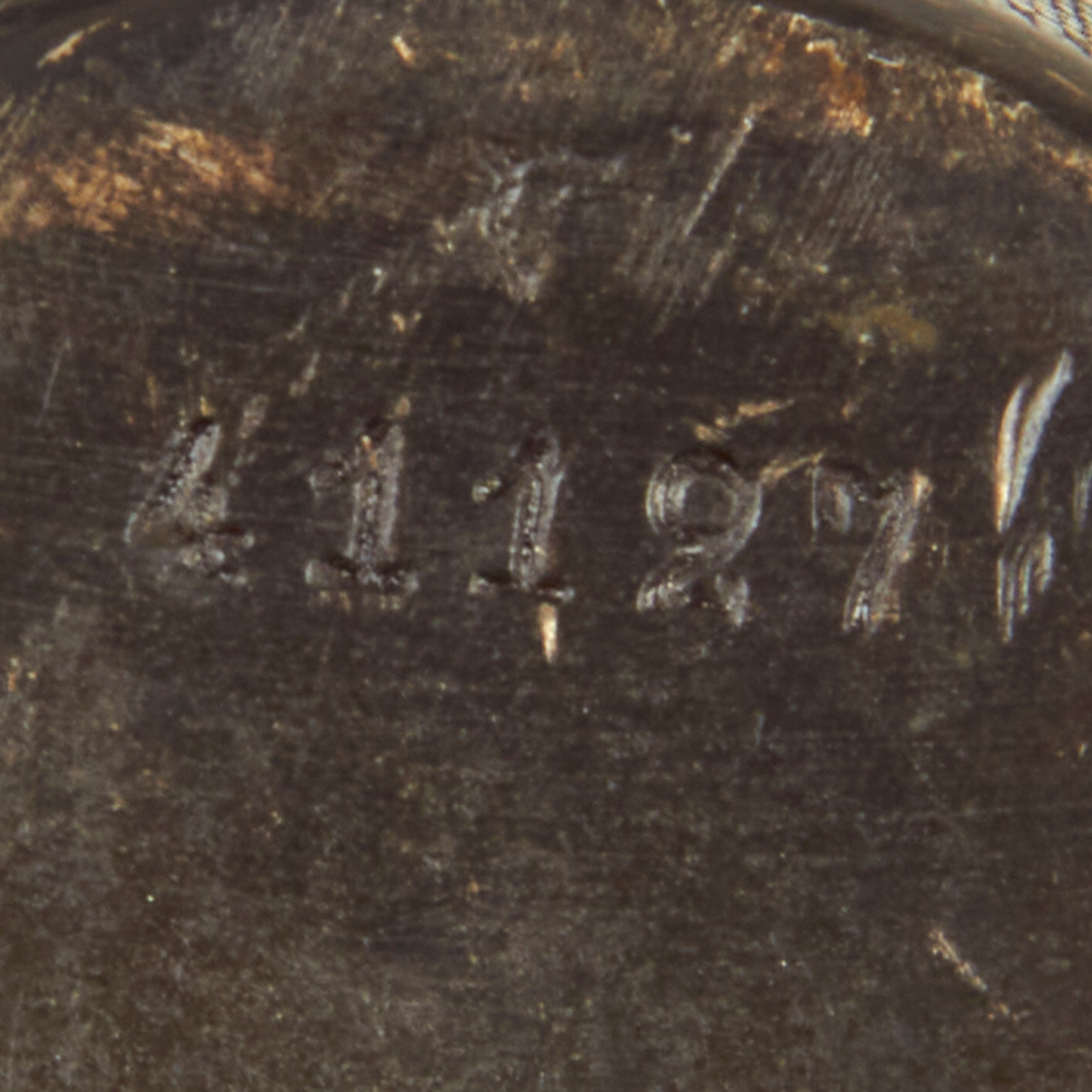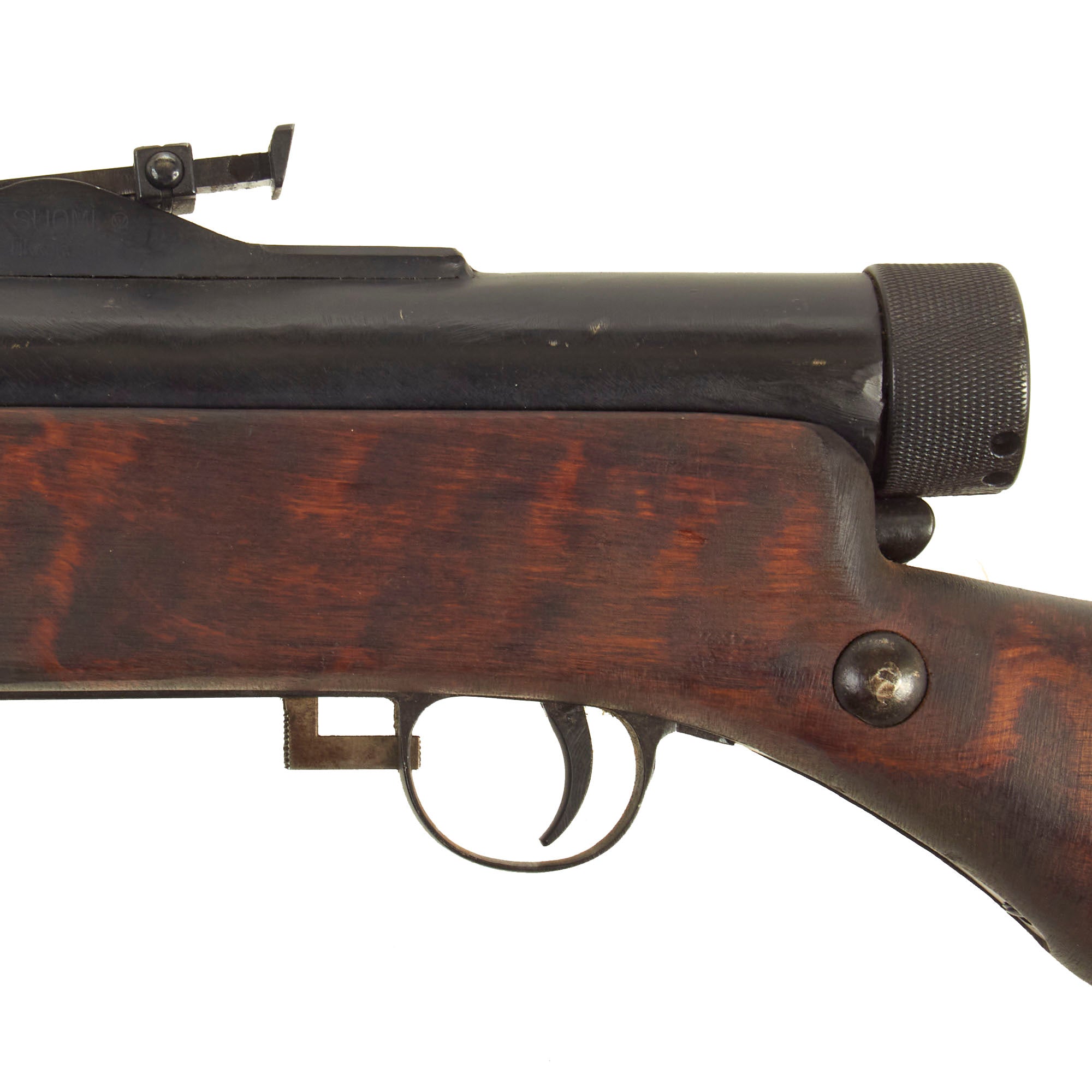 The sides of the sight are marked: SUOMI / Tikkakoski (left) and PATENT / 1932 (right), which are a bit faint. The butt cap is stamped with serial number 41127, and the barrel jacket 3834, so parts were definitely swapped out over its service life. It also bears the SA mark of the Finnish Army (Suomen Armeija), which is present on the rear sight and magazine. There are additional markings and proofs on various parts of the guns.