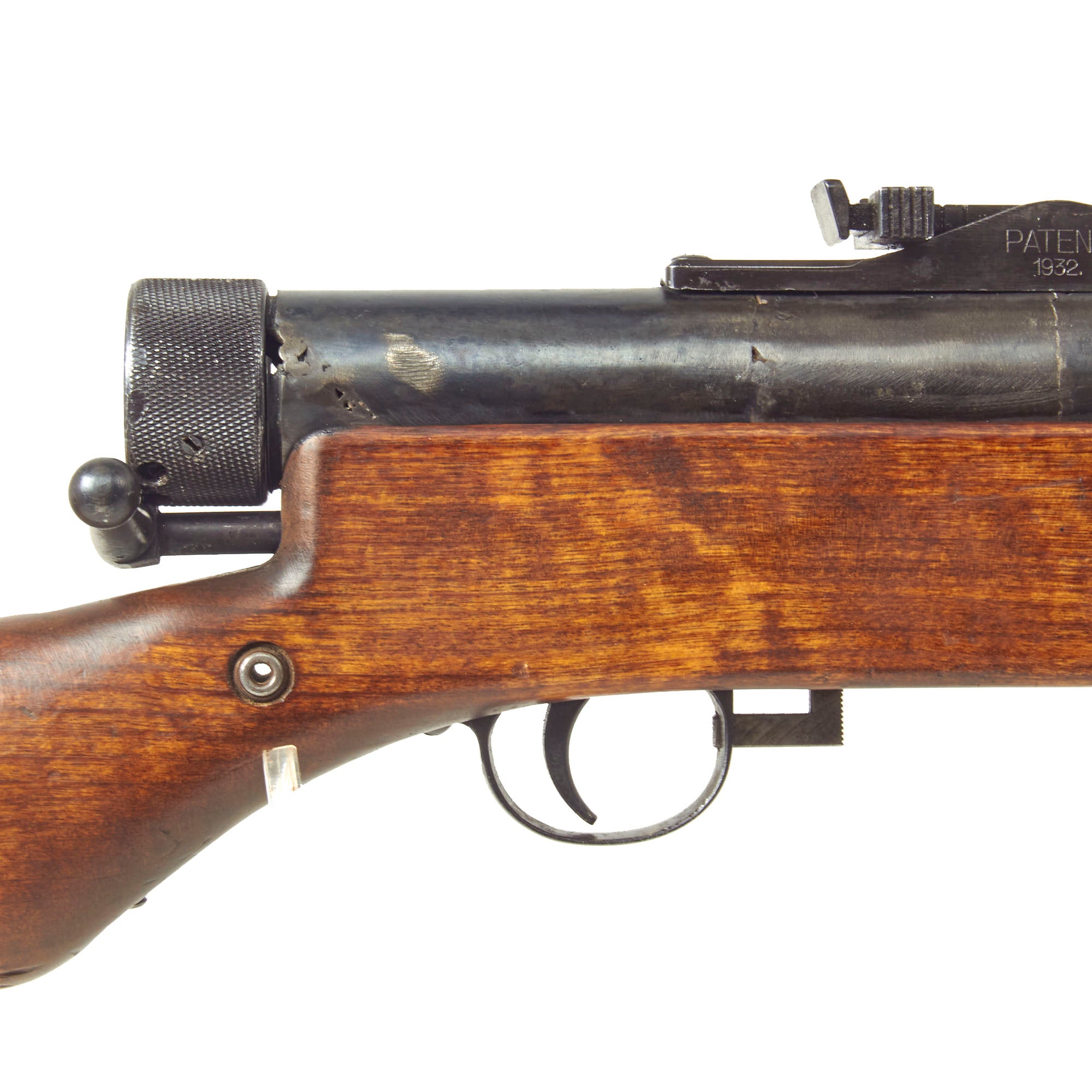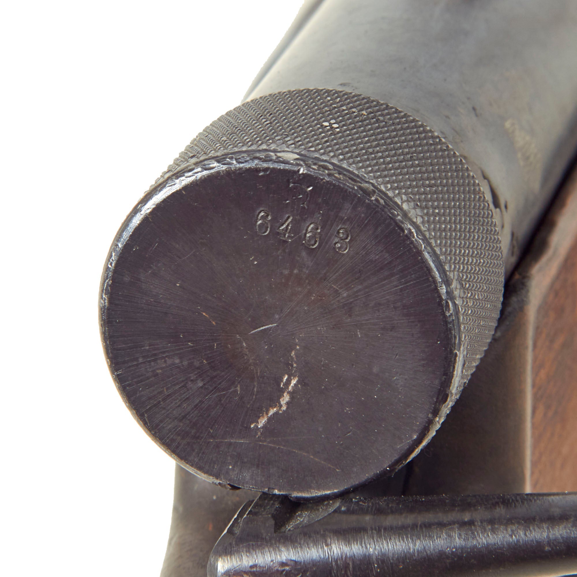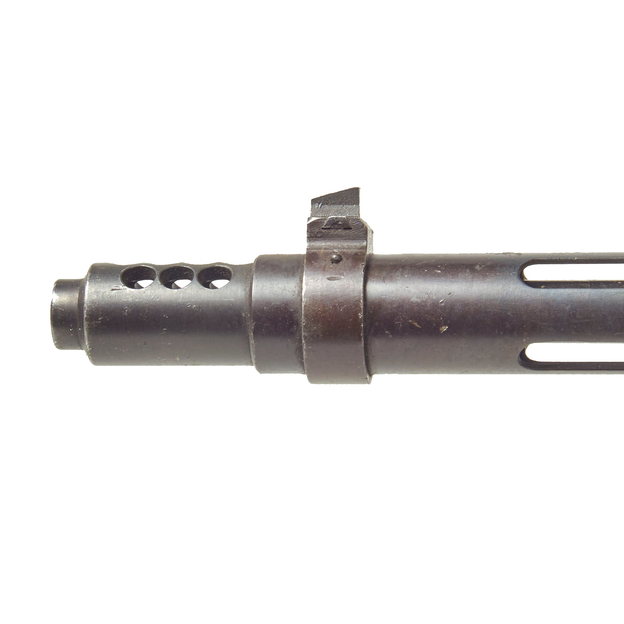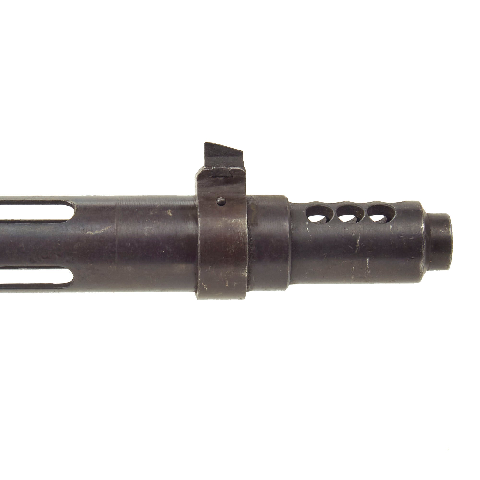 The magazine release tab, safety, and sight are all still intact and movable. However how to the display gun was demilitarized and welded, the barrel jacket can no longer be removed, and the barrel jacket lock is immobile. The barrel installed on the display gun is deactivated, with the chamber completely missing. The included magazine can be properly be removed using the latch. Overall a very nice condition piece and very attractive, especially with the figured wood stock!