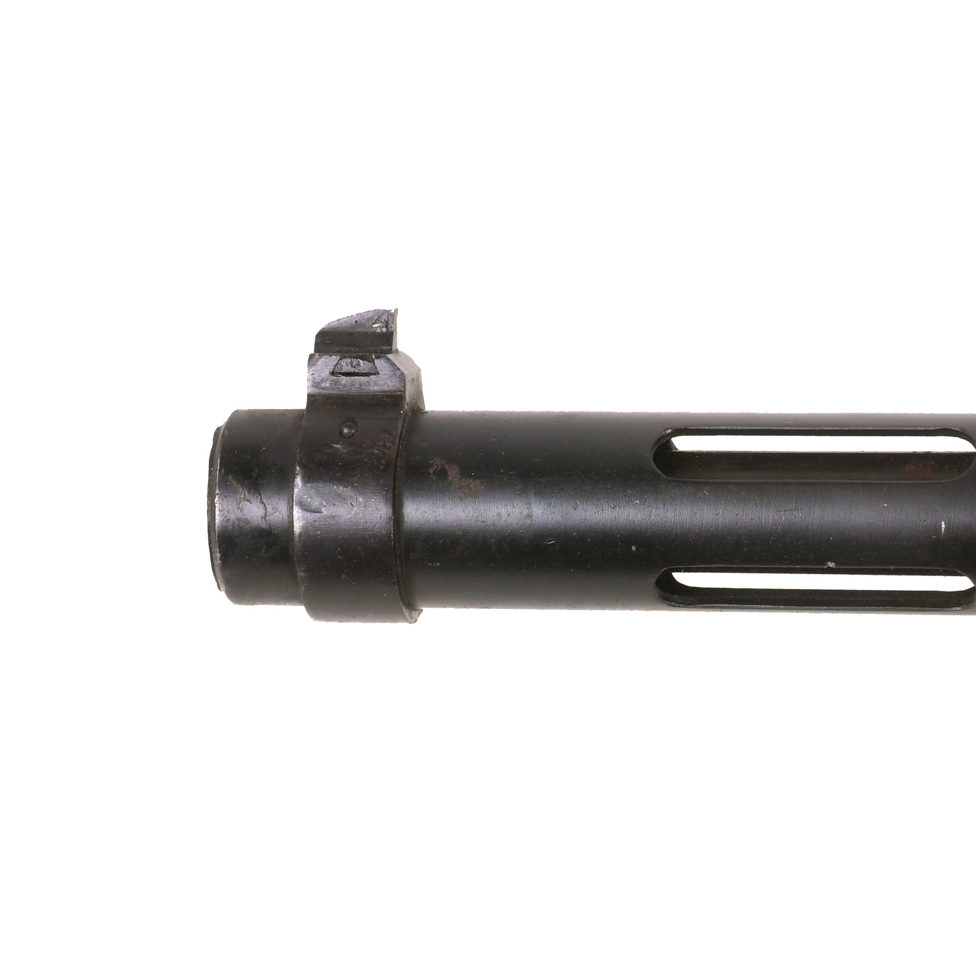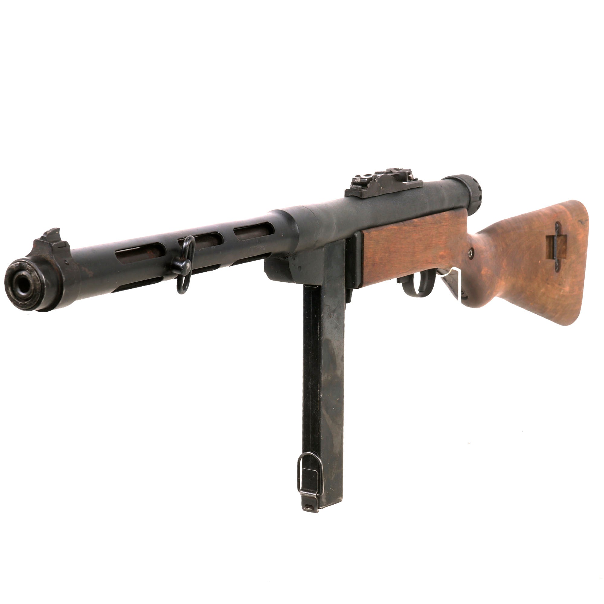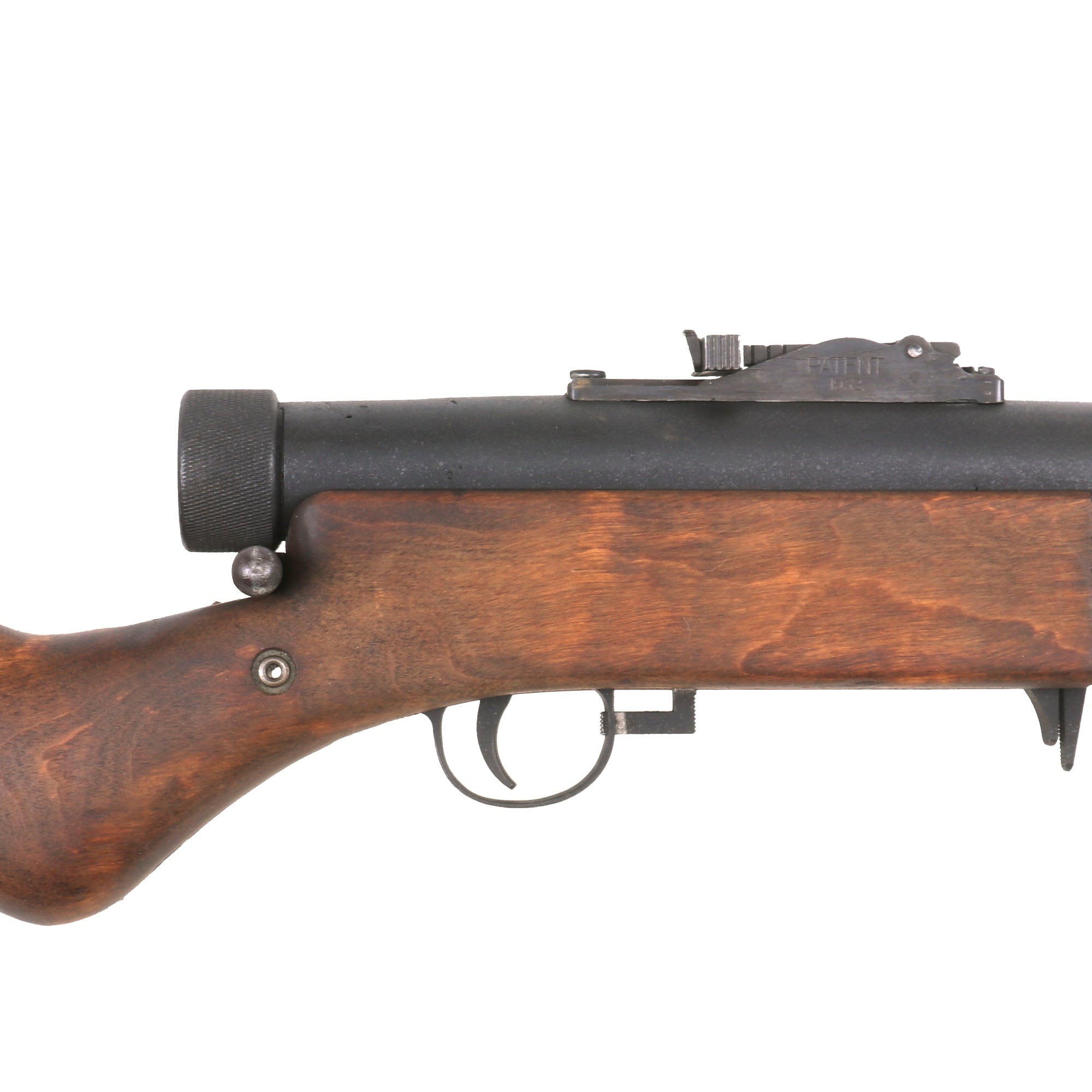 The display gun comes complete with an original stick magazine, which will be deactivated where required. It fits well into the magazine well, and the release catch is fully functional. The sight is also still intact and movable, as are the trigger and safety, though the safety does not lock back far enough to stop the trigger from moving. This example was cut right through the barrel jacket joint, so there was unfortunately no way to have it functional. The barrel looks like it was live, but it can no longer be removed from the display gun. Overall a very nice condition piece and very attractive, especially with the lovely wood stock!