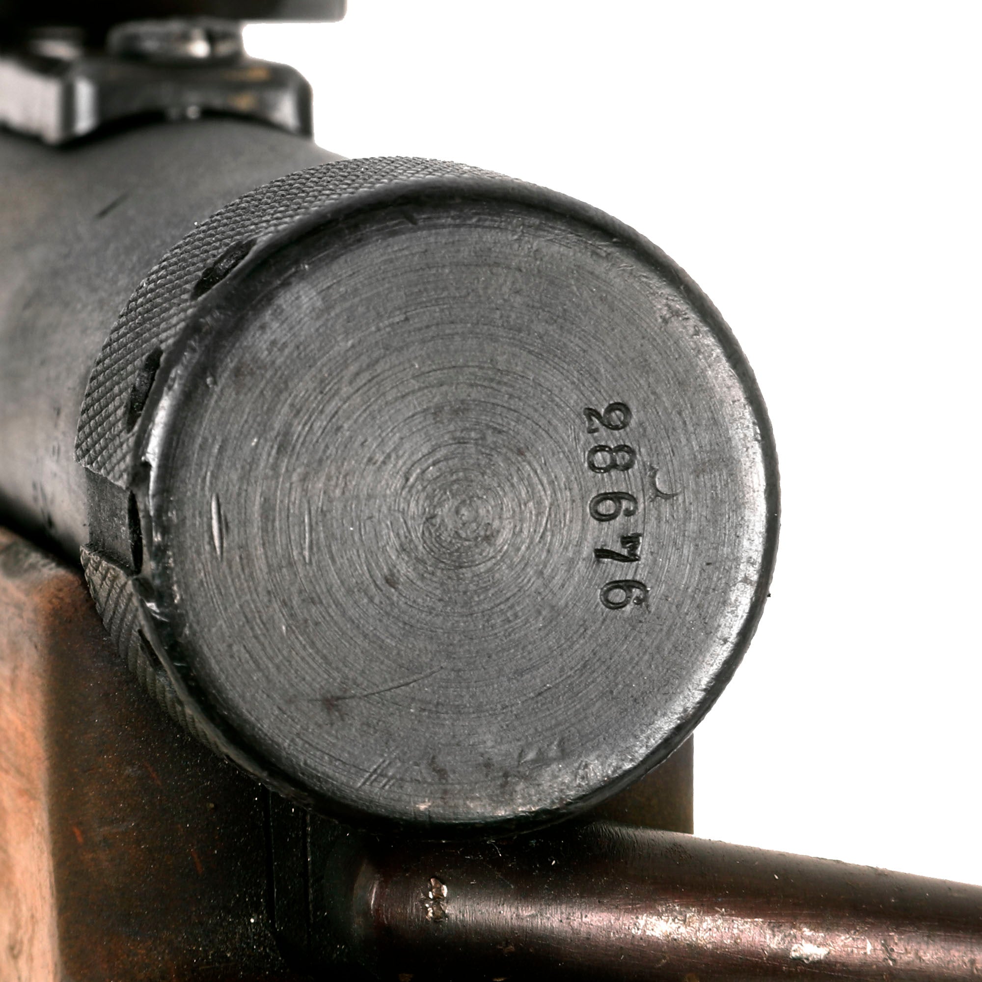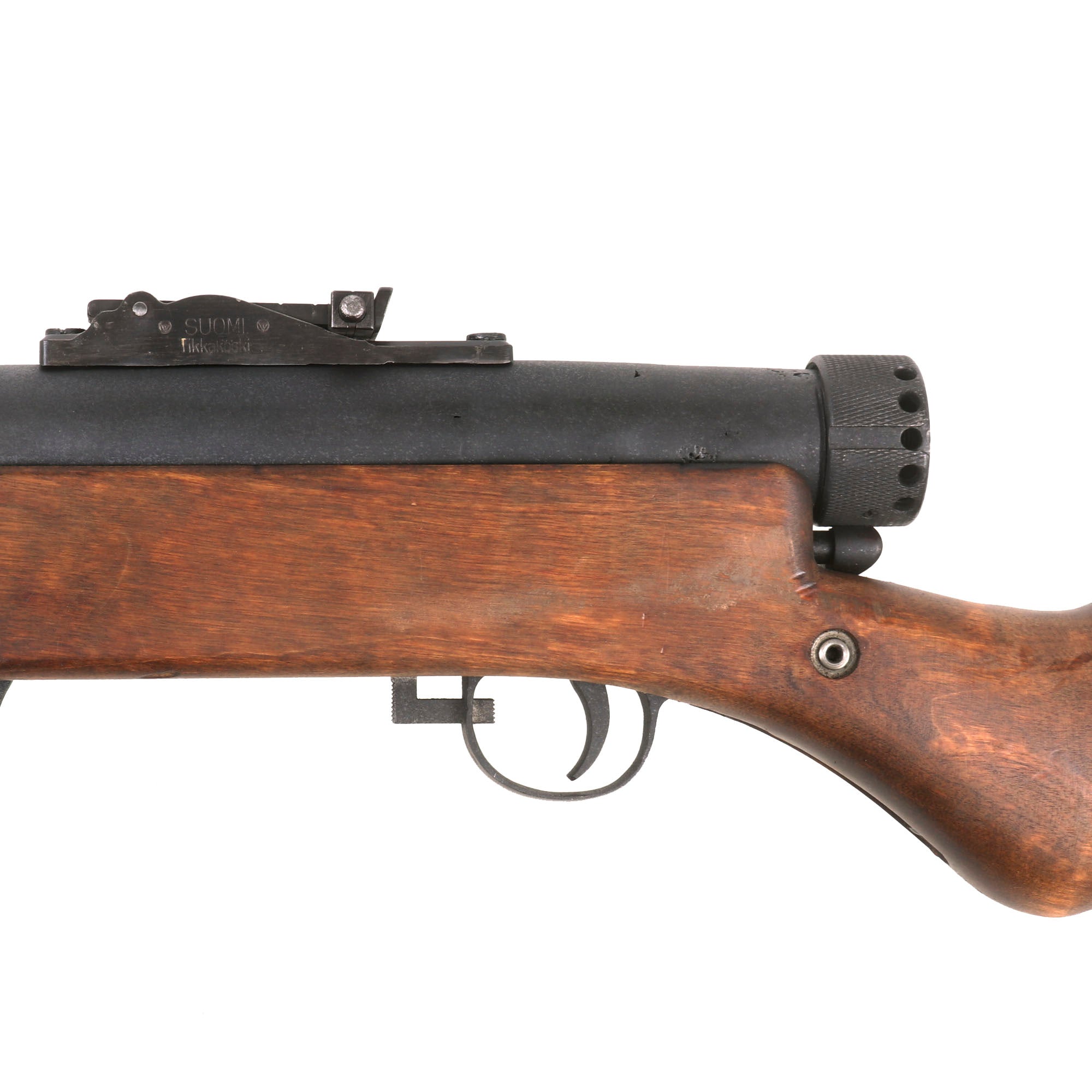 The sides of the sight are marked: SUOMI / Tikkakoski (left) and PATENT / 1932. (right), which are still easily legible. There are also stamped with the logo of the factory, a T inside a Triangle inside a Circle. The butt cap is stamped with serial number 28676. however unfortunately due to how it was deactivated, we cannot see the serial number on the barrel jacket or barrel. It also bears the [SA] mark of the Finnish Army (Suomen Armeija), which is present on rear sight base and the magazine. There are additional markings and proofs on various parts of the gun.