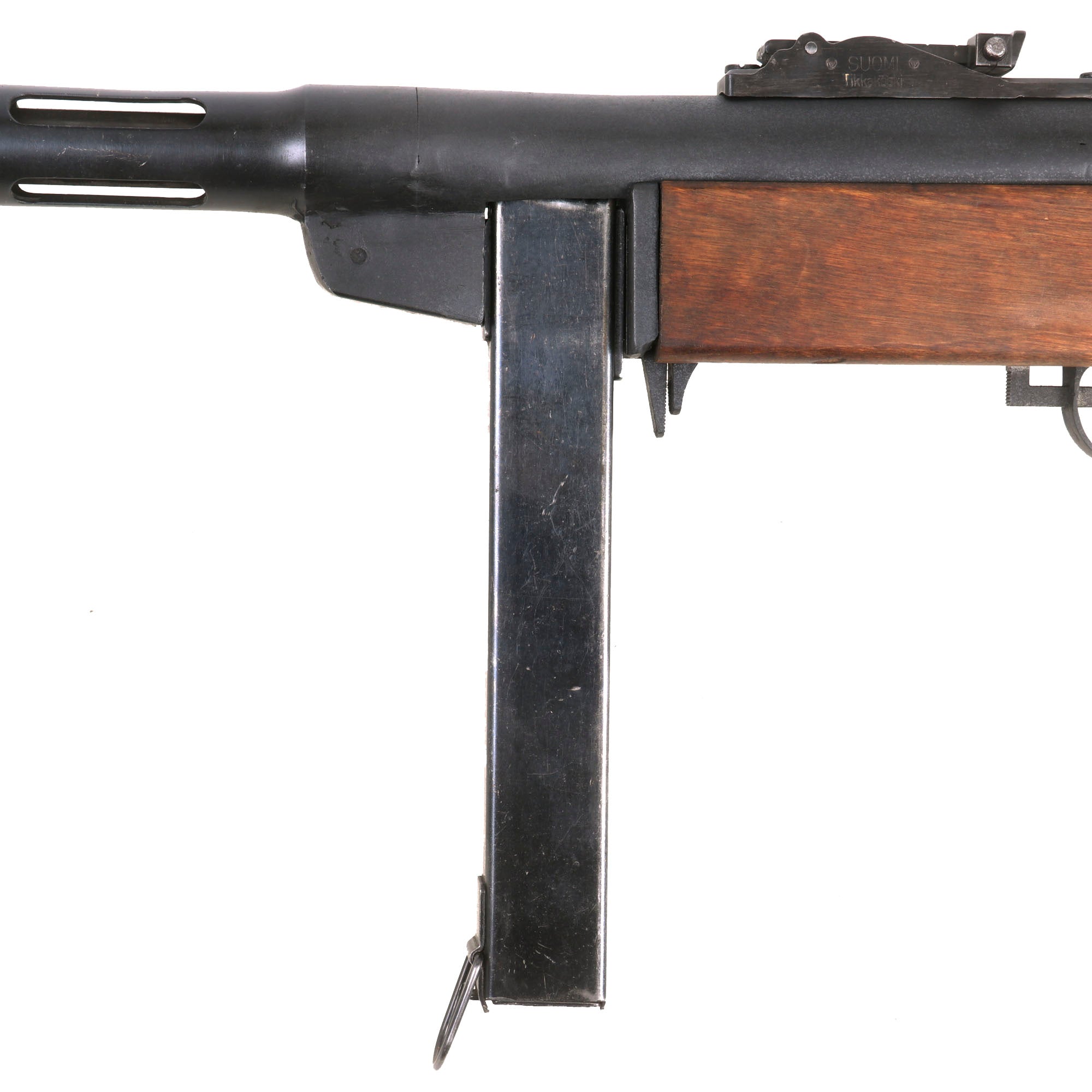 Original Item: Only One Available. Offered in great condition is this lovely Finnish Suomi M-31 Display Submachine gun, built from all original parts on an original BATF compliant non-firing display receiver, making this a 100% legal display Sub-Machine gun. This receiver was created by using portions of the original torch cut receiver, including the barrel bushing, combined with some new made steel portions. It has properly had a 25% section of the total length completely replaced entirely with solid steel bar stock (as required by BATF). Meaning a 1/4 length section of the display receiver is solid steel, making this totally legal to own without a license of any kind. Every part on this display gun is original WWII manufacture other than the replaced portions of the receiver.