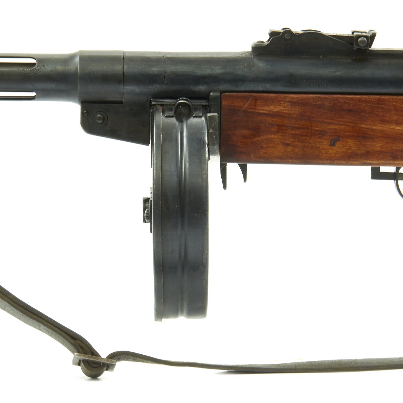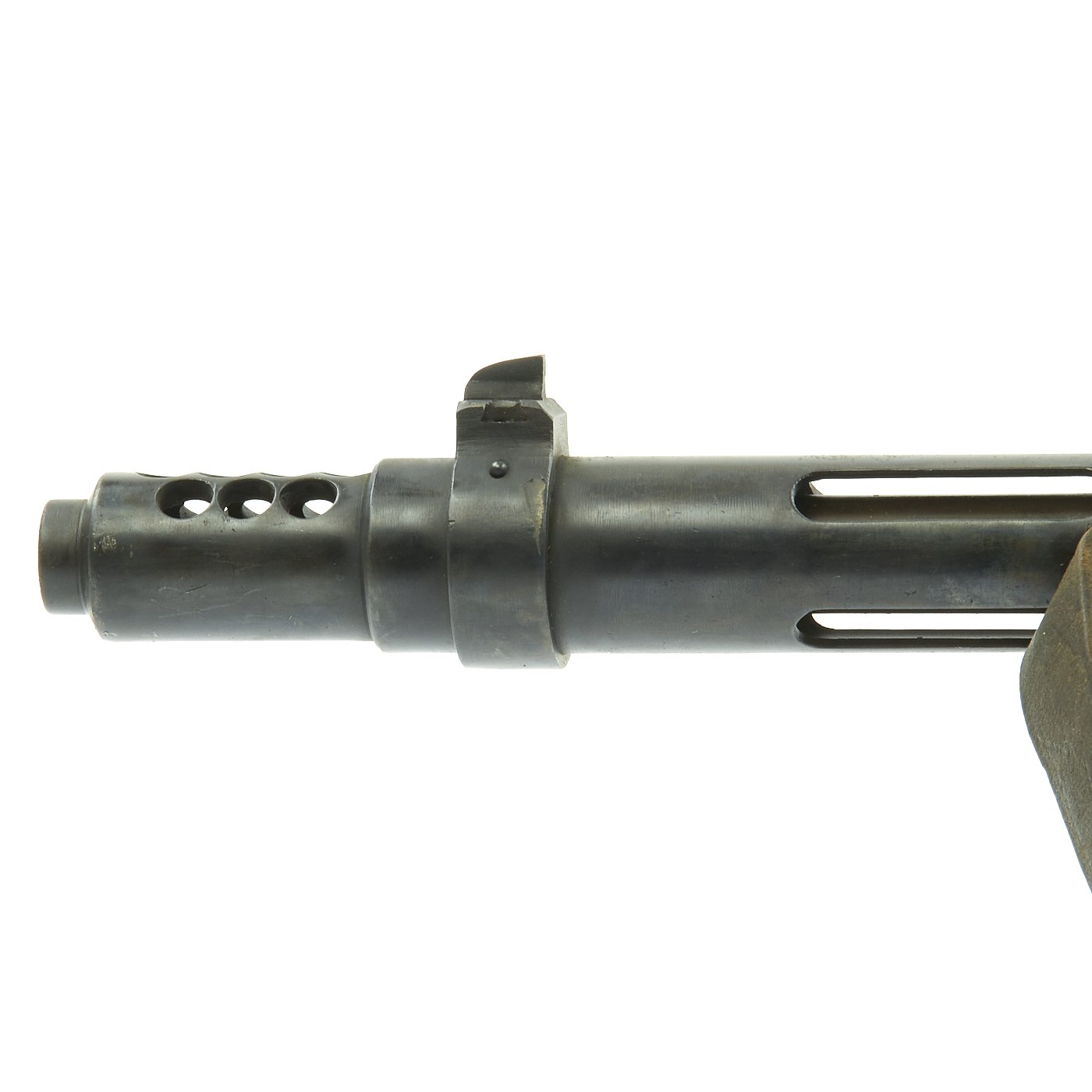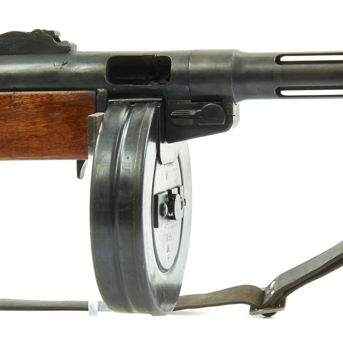 Original Item: Only One Available. Offered in fine condition built on a newly made non-firing BATF approved non-gun display receiver this SMG comes with an original drum magazine. Magazine release tab, safety, barrel jacket lock, and sight are all intact and movable. The cocking handle is unfortunately missing. Comes complete with an original sling. Overall a very nice condition piece and very attractive.