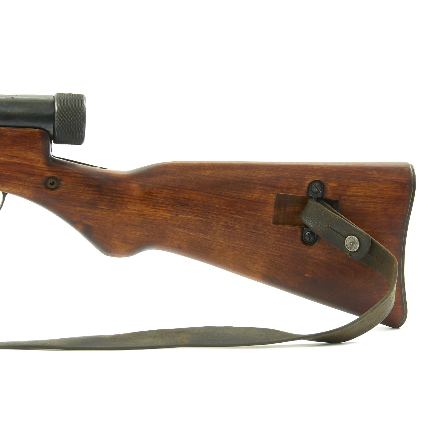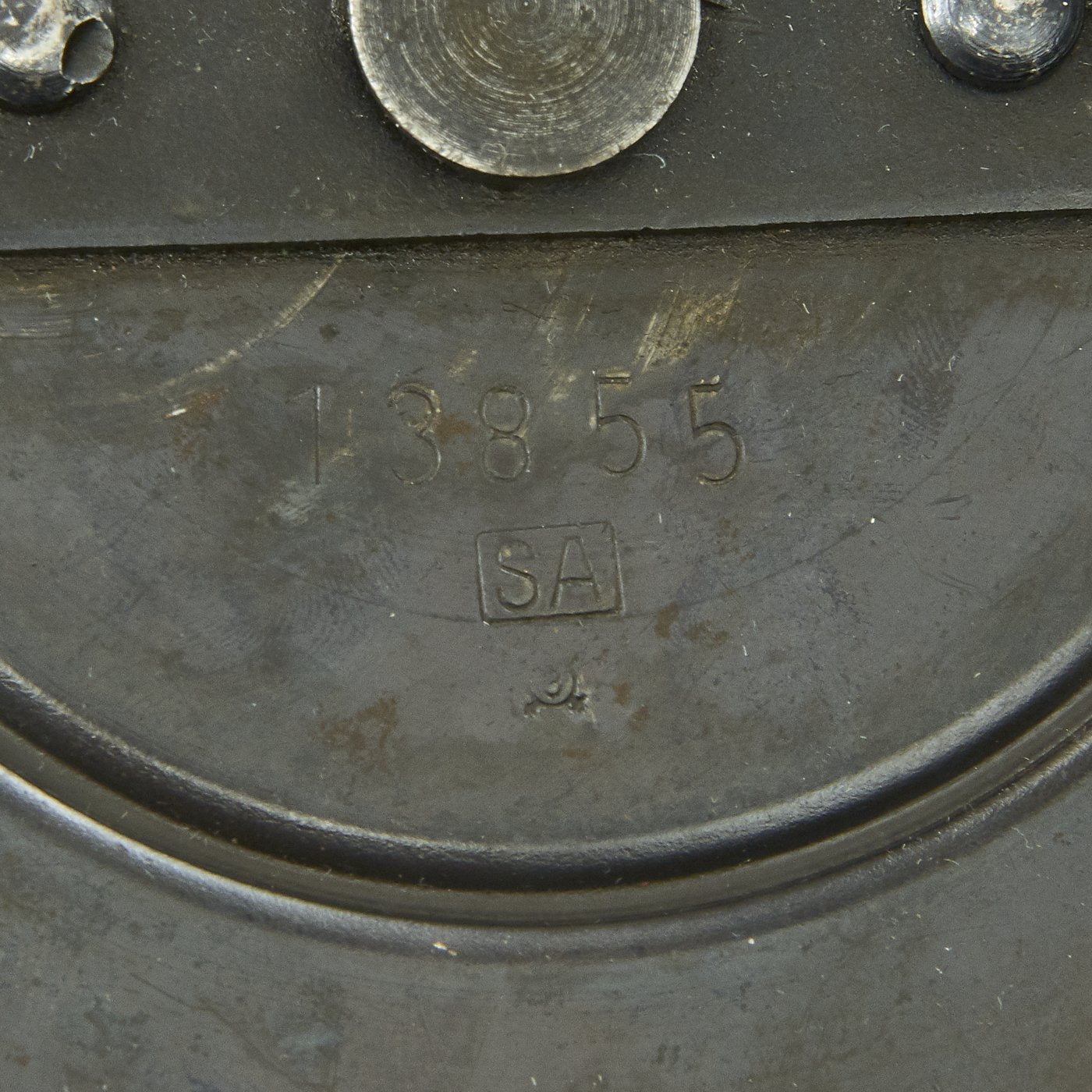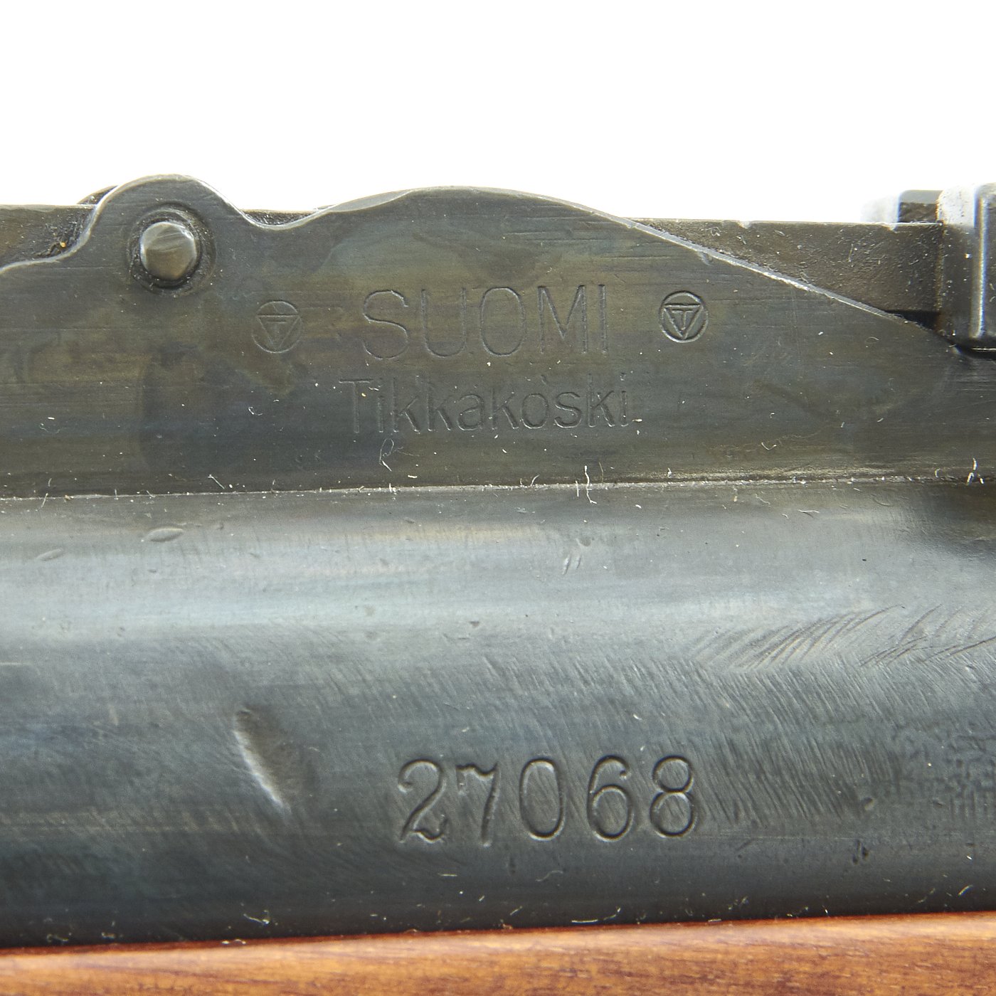 The sides of the sight are marked: SUOMI / Tikkakoski and PATENT / 1932. The side of the receiver is marked with serial number 27068, and there are other numbers on the barrel jacket and butt cap. It also bears the SA mark of the Finnish Army (Suomen Armeija), which is present on the magazine and elsewhere on the display gun. Also has various proof marks throughout.