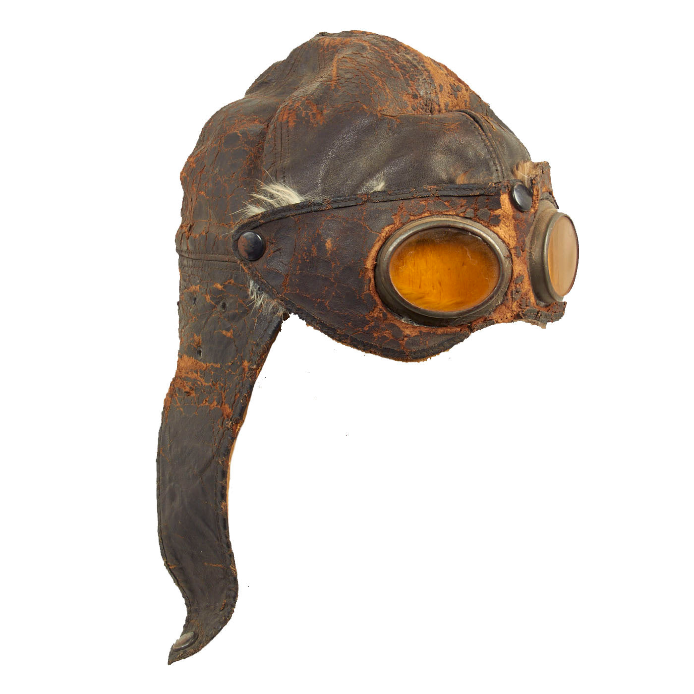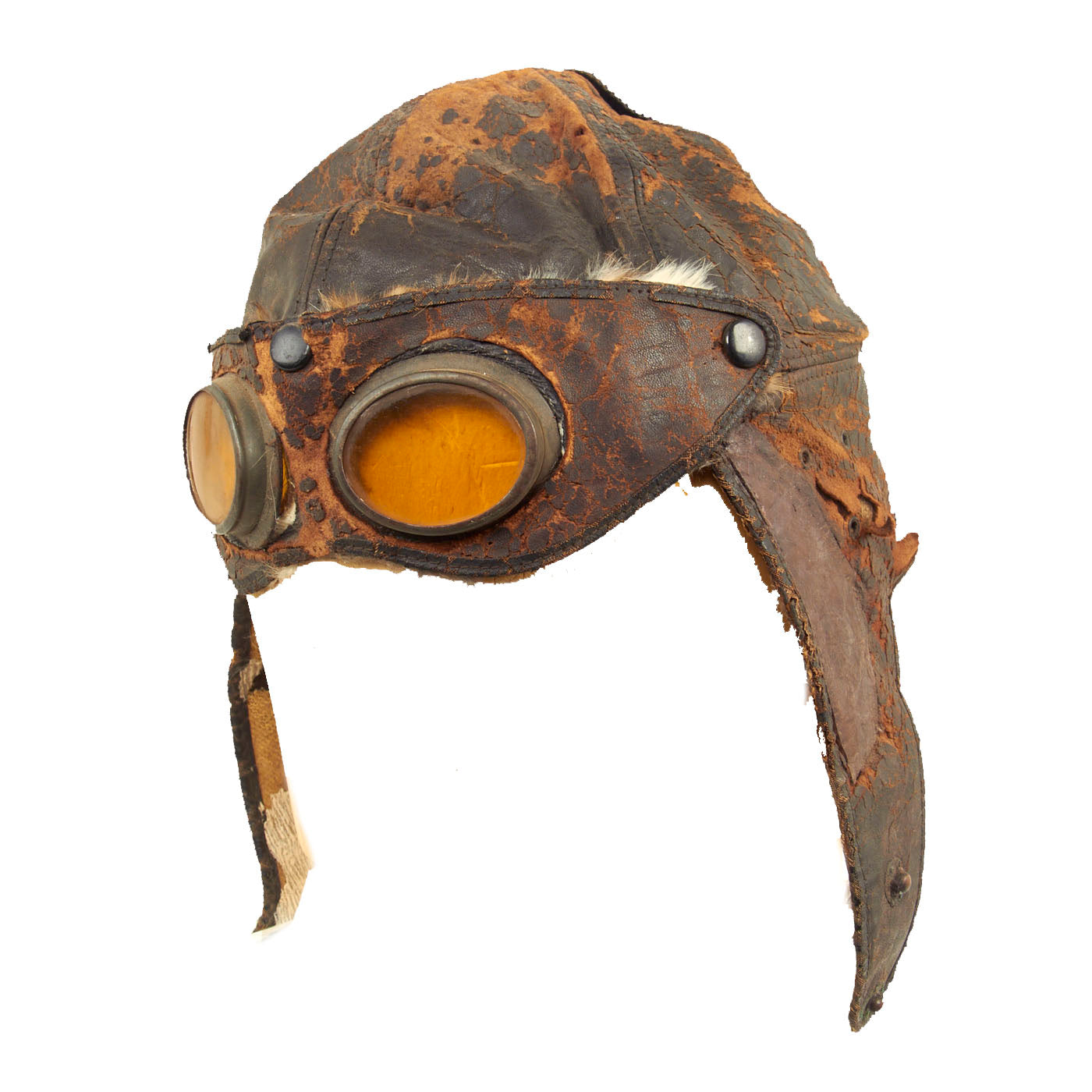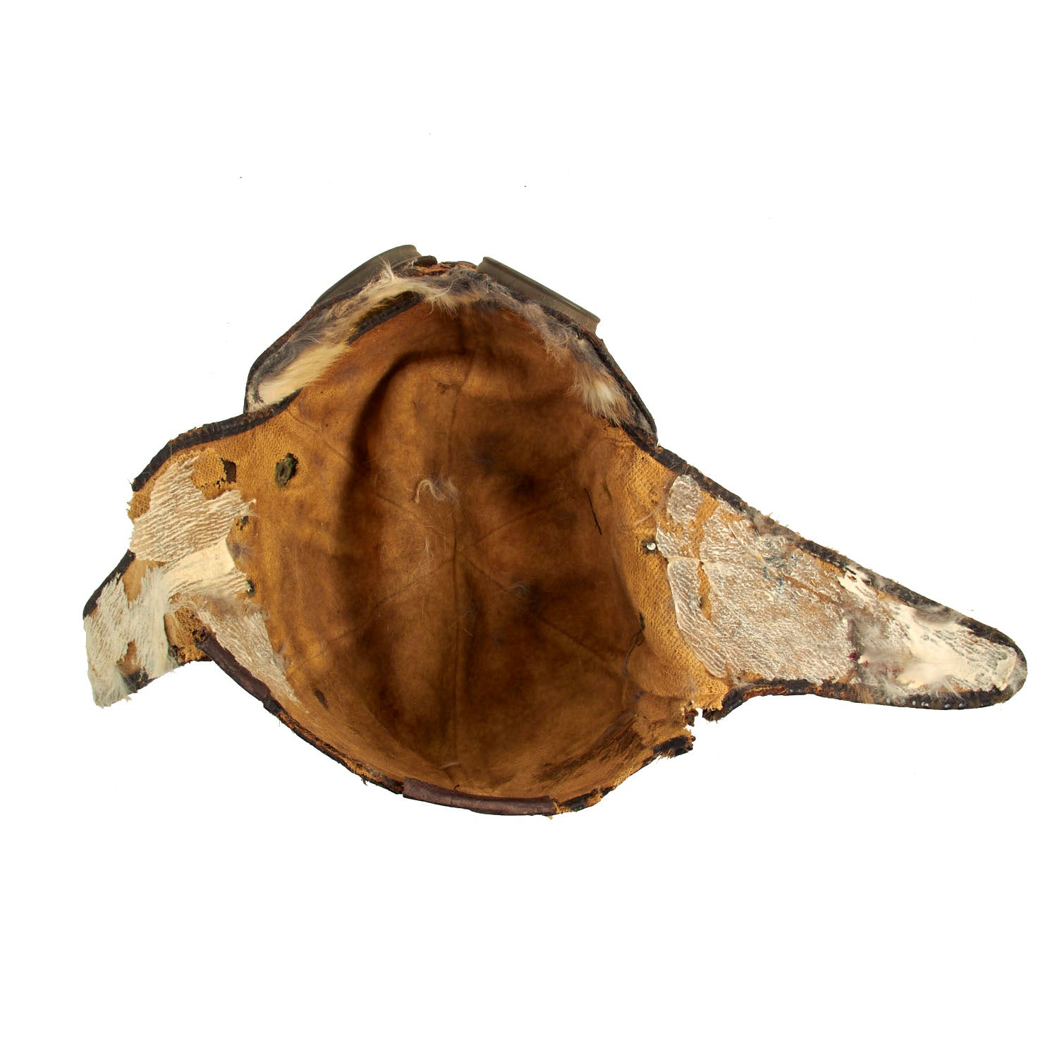 This example is unmarked, but due to the construction and appearance, it is our belief that this helmet is of French origin. The condition is good for the age, but there is extensive cracking present in the leather and almost feels delicate. There is still strong stitching present and what appears to be period leather reinforcements and repairs done. Seeing how these helmets were popular both on and off the battlefield, this helmet could have continued its service after the war by early automobile and motorcycle enthusiasts. The lining appears to have once been rabbit fur and soft chamois, however the fur on the ear flaps is almost completely gone. The attached goggles are in similar condition to the helmet, but appears to have retained the rabbit fur lining better. The lenses are amber in color and are the same plastic type material as seen on WW1 German gas masks.