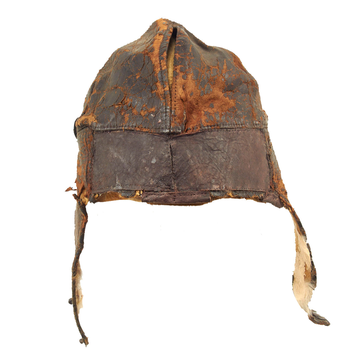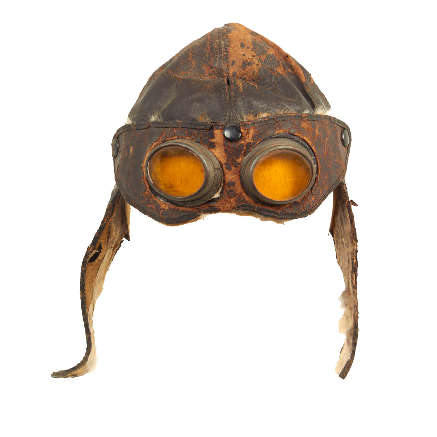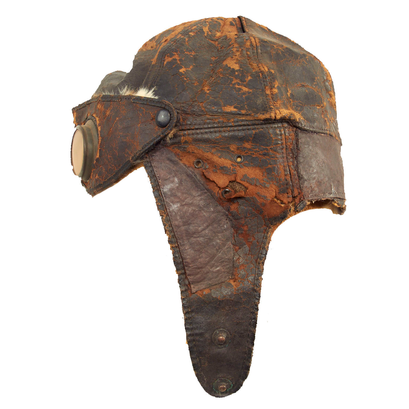 This example is unmarked, but due to the construction and appearance, it is our belief that this helmet is of French origin. The condition is good for the age, but there is extensive cracking present in the leather and almost feels delicate. There is still strong stitching present and what appears to be period leather reinforcements and repairs done. Seeing how these helmets were popular both on and off the battlefield, this helmet could have continued its service after the war by early automobile and motorcycle enthusiasts. The lining appears to have once been rabbit fur and soft chamois, however the fur on the ear flaps is almost completely gone. The attached goggles are in similar condition to the helmet, but appears to have retained the rabbit fur lining better. The lenses are amber in color and are the same plastic type material as seen on WW1 German gas masks.