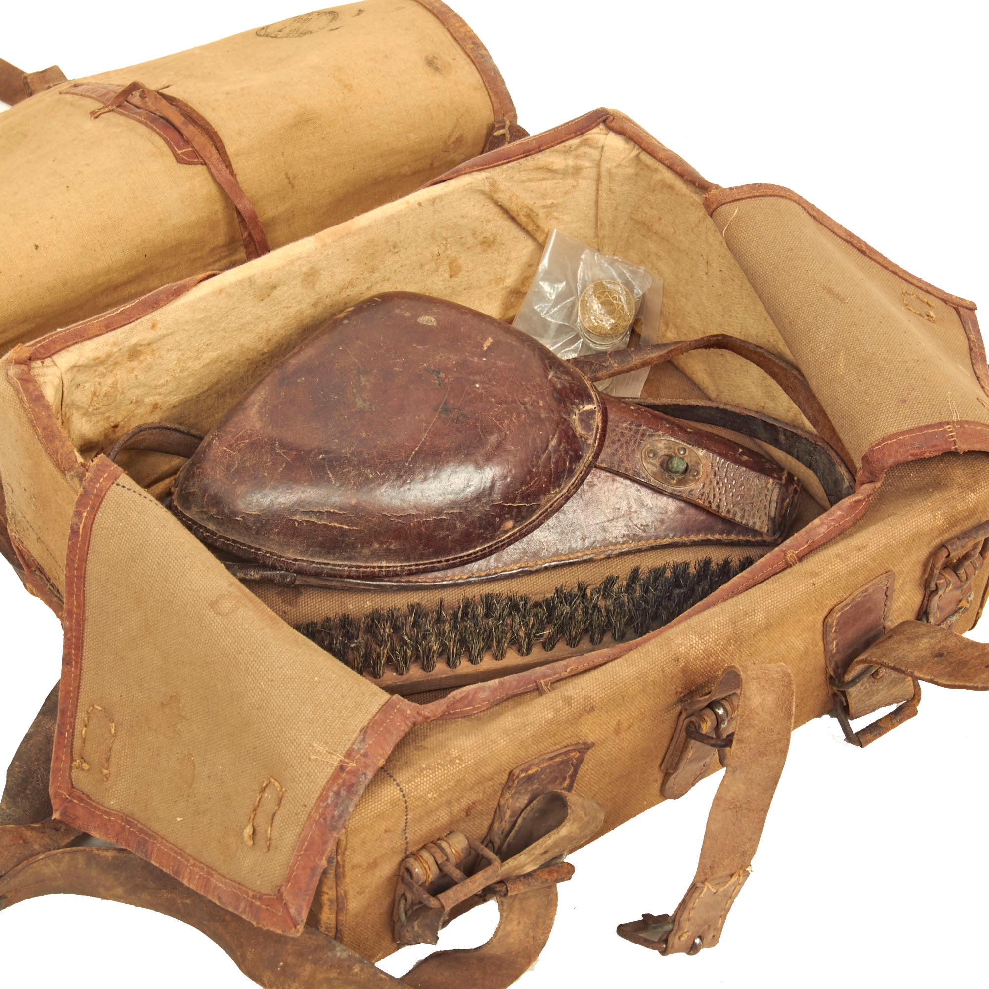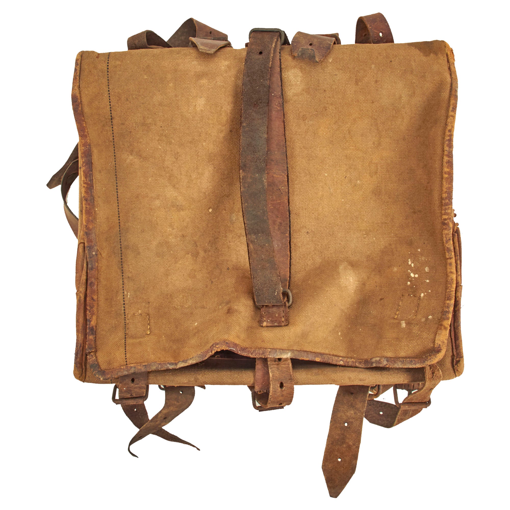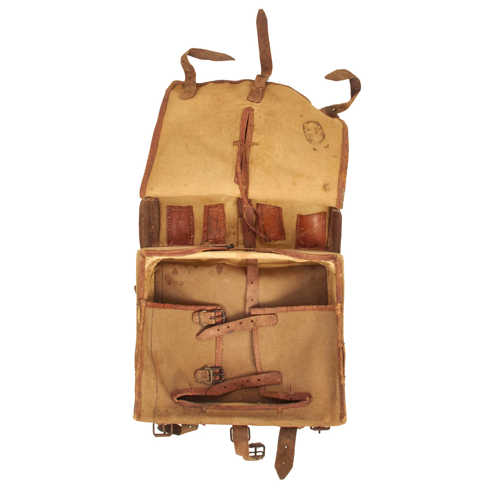 - Model 1893 l'Havresac: The M.1893/14 knapsack is made of unpainted canvas around a wooden frame and is offered in wonderful, field used condition. The front flap of the pack is marked with his rank, name and what appears to be a unit marking but we are unsure. The canvas does have staining to it but nothing that retracts from the beauty of the item. All leather straps and buckles appear to be present and in functional order, but as with all leather of this era, it is cracked and in a rather delicate state.