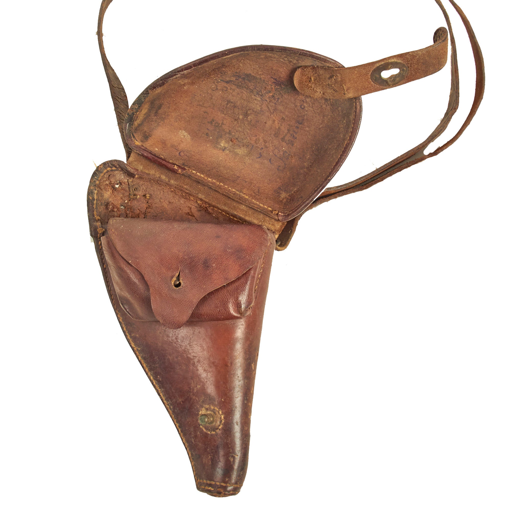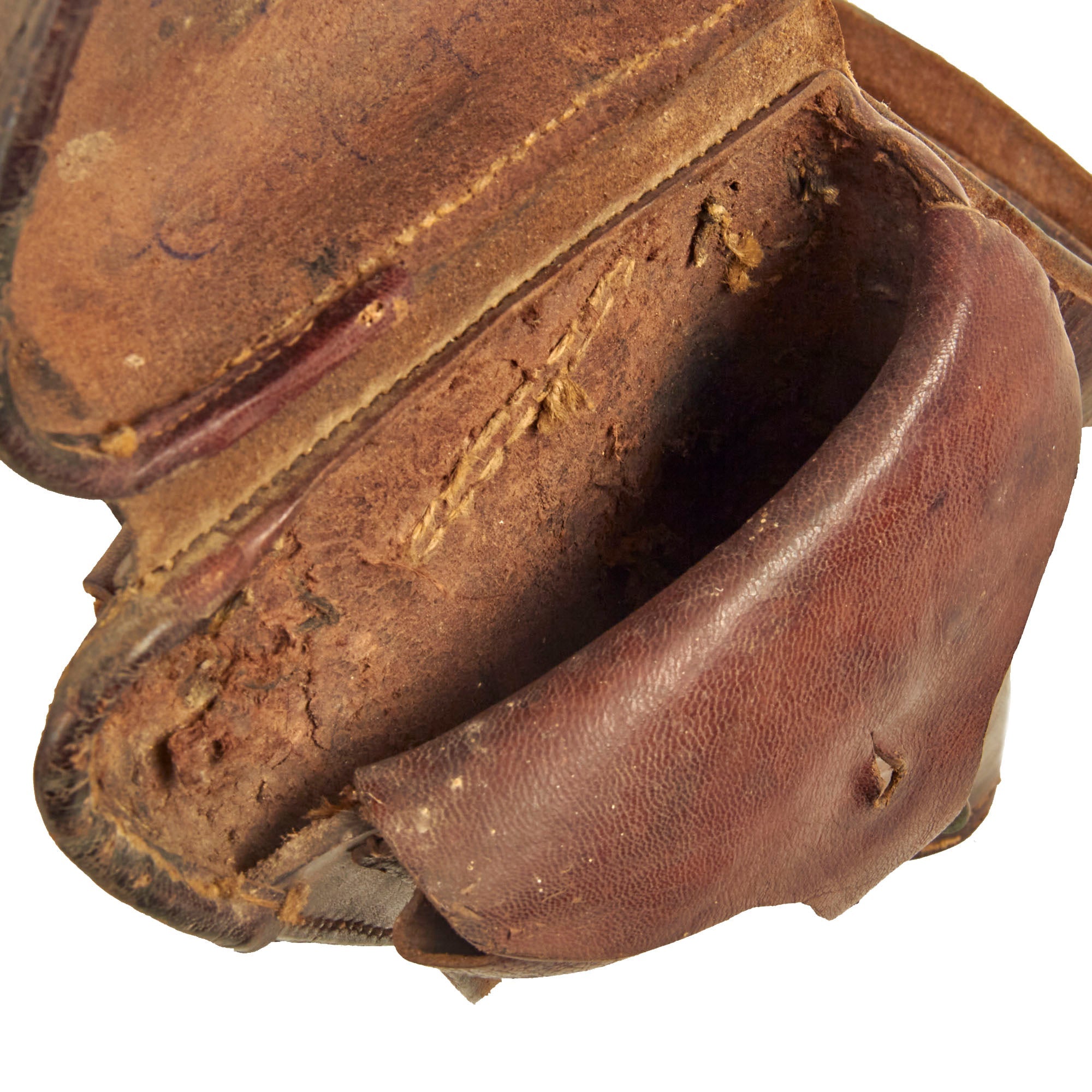 The holster is in good condition for its age. The cross belt is intact, not ripped or broken, and still supple to some degree. The holster itself is supple. Closure holes are intact and not ripped. Internal ammunition pouch is present but the individual loops are missing. There is some crazing to the leather and areas of dryness, but overall this is in very good condition considering the age. The leather still retains a pleasing russet coloration to the leather. The interior of the clamshell is marked with the same rank, name and similar looking unit information as the pack, but it is extremely faded and barely legible.