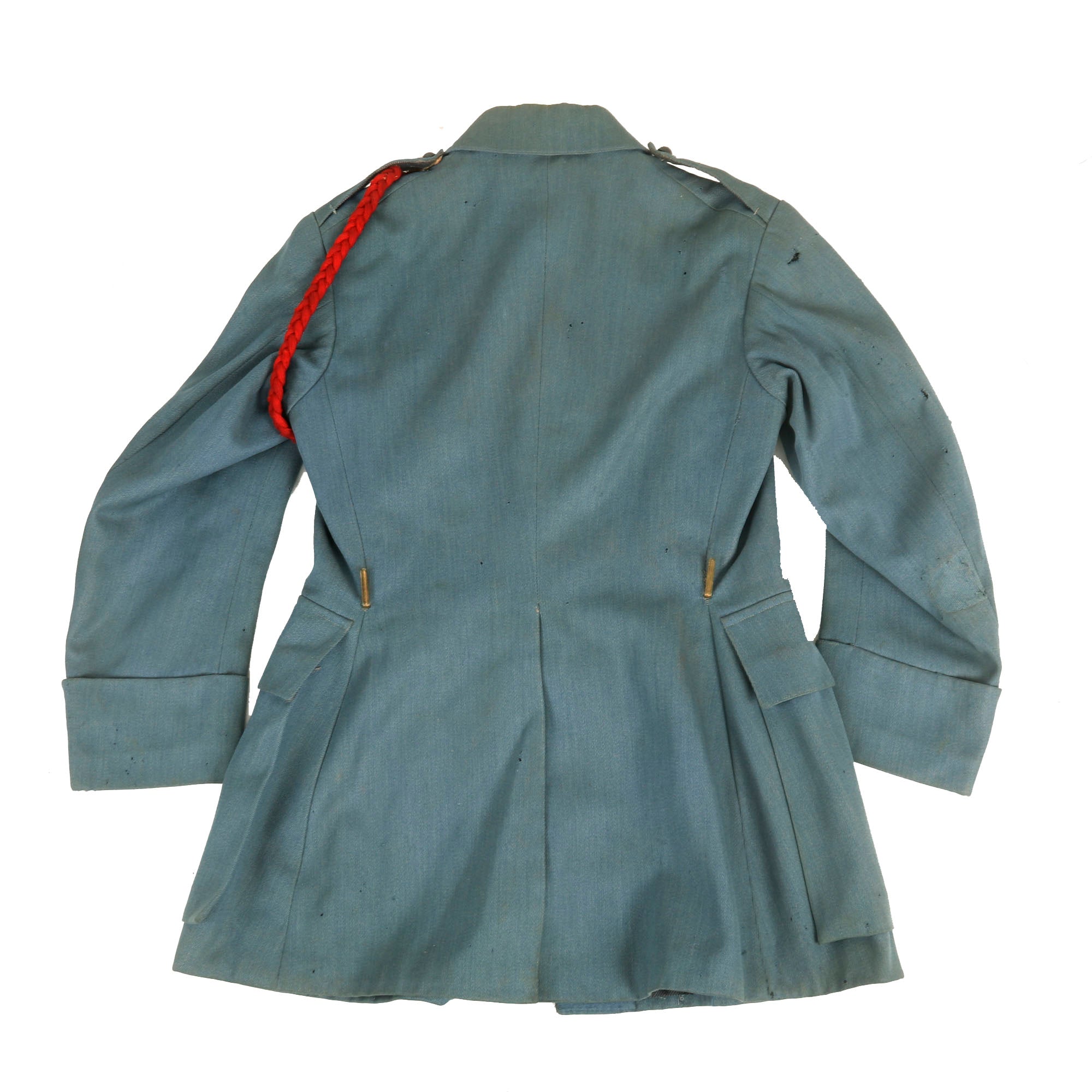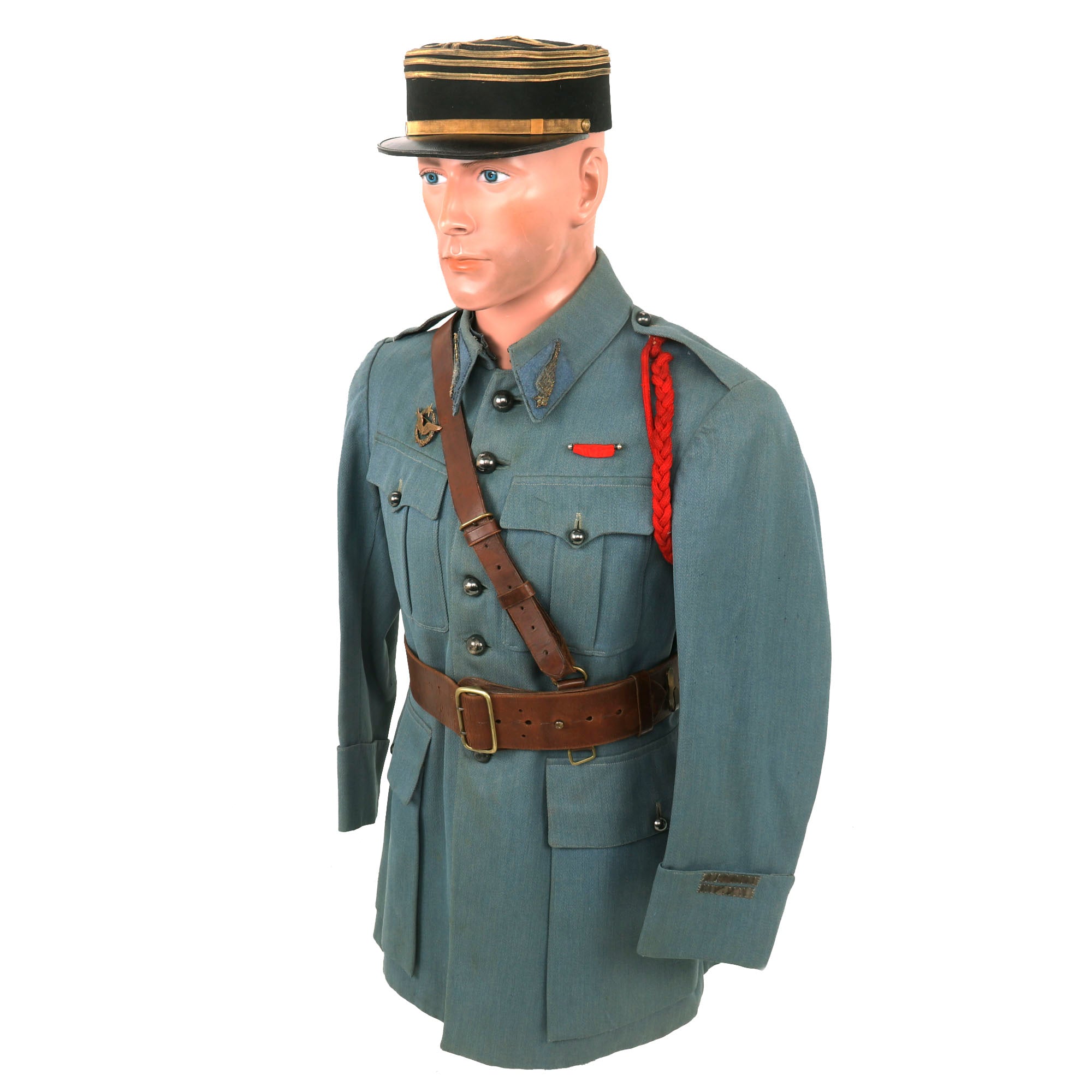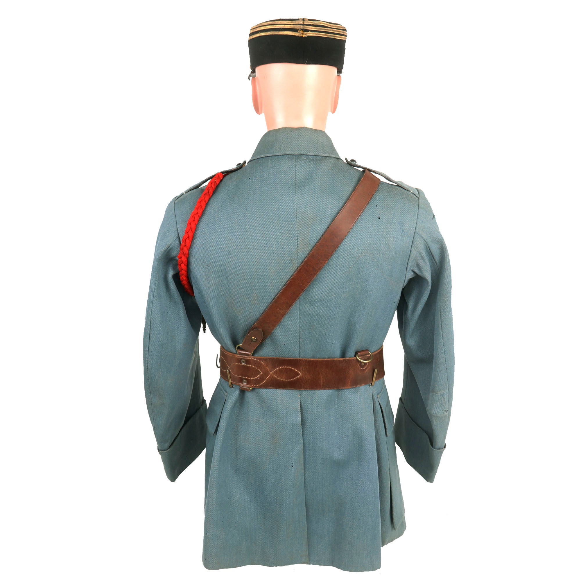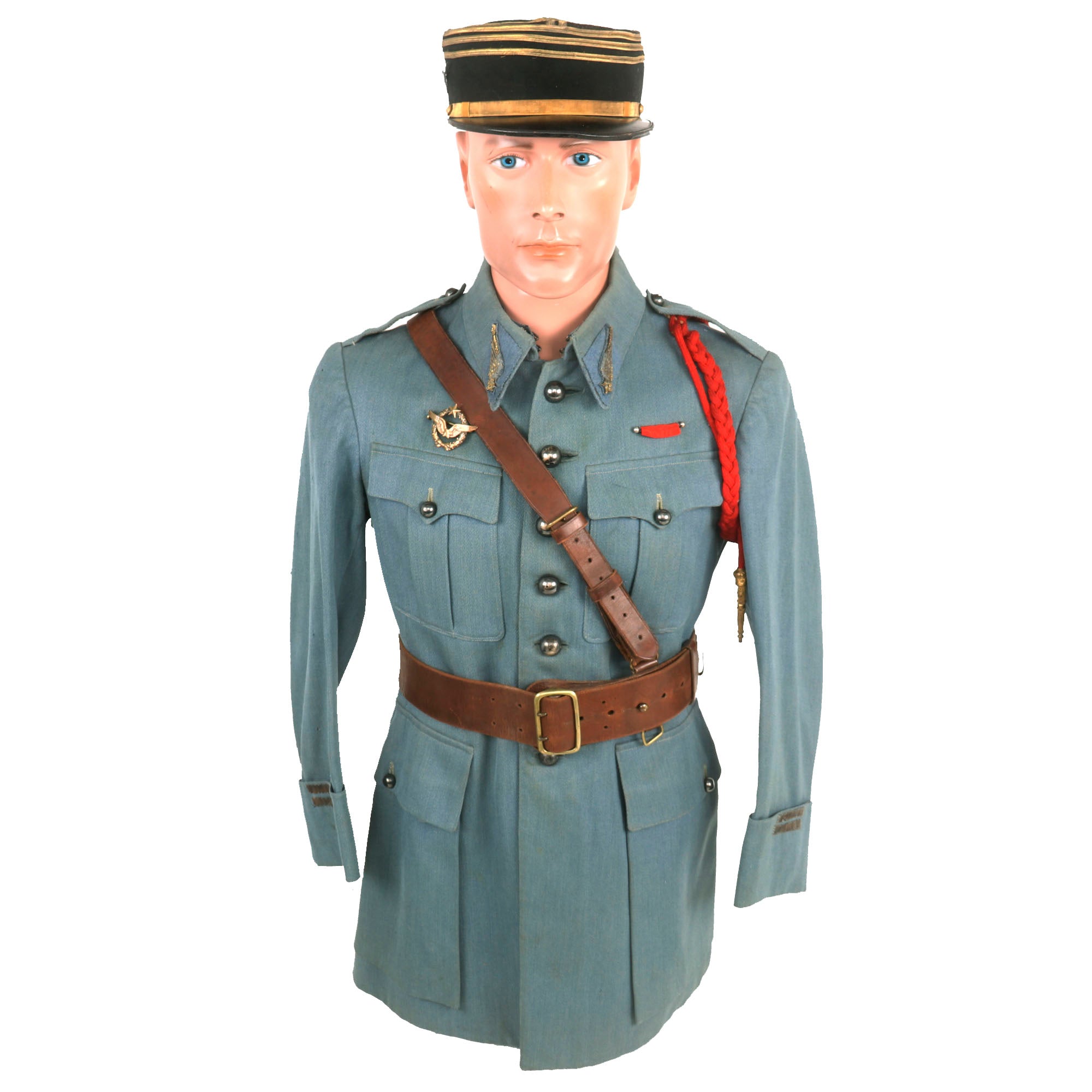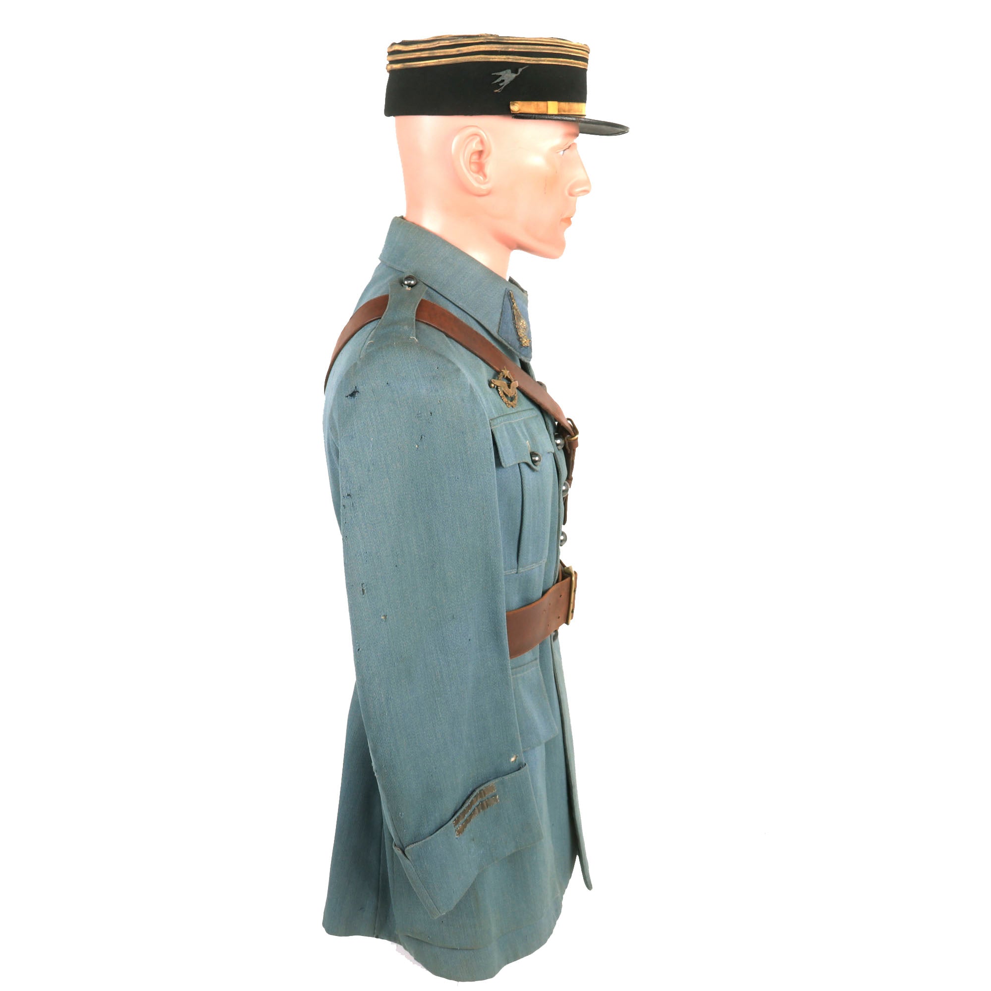 Now this is an absolutely stunning uniform set. This was the standard issue for a WWI French Pilot. Horizon blue French Air Service service coat, single breasted with all 7 brass buttons down front. The collar tabs feature beautiful gold bullion “winged star” insignia with the color retained very well. The right side of the uniform features a lovely “B” hallmarked Pilot’s Wings Badge with the colors retained very well. The badge was issued in the final years of the war, while the “B” hallmarked badges were used up into 1925. The badge is serialized with the number 9777 indicating that it dates between 1915 to 1916. These badges in their own standpoint are very rare. The belt featured on the tunic is in wonderful condition and rests on the integrated belt hooks on the tunic quite nicely.