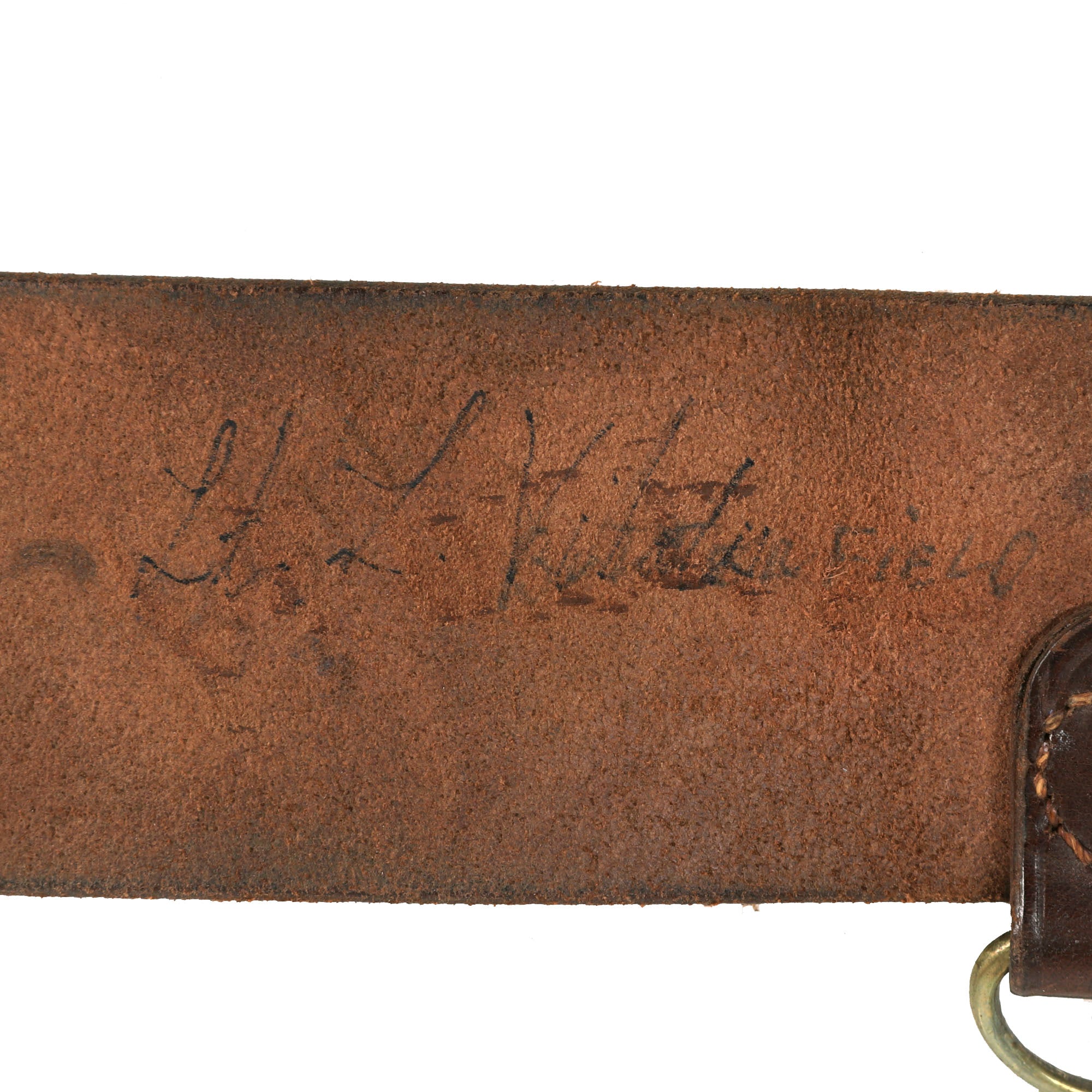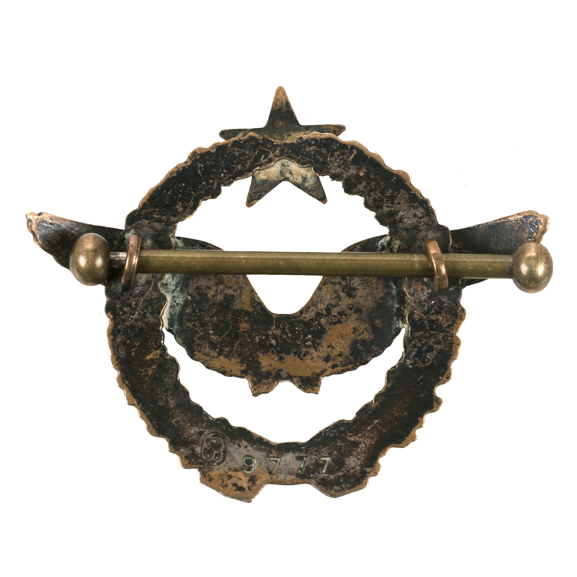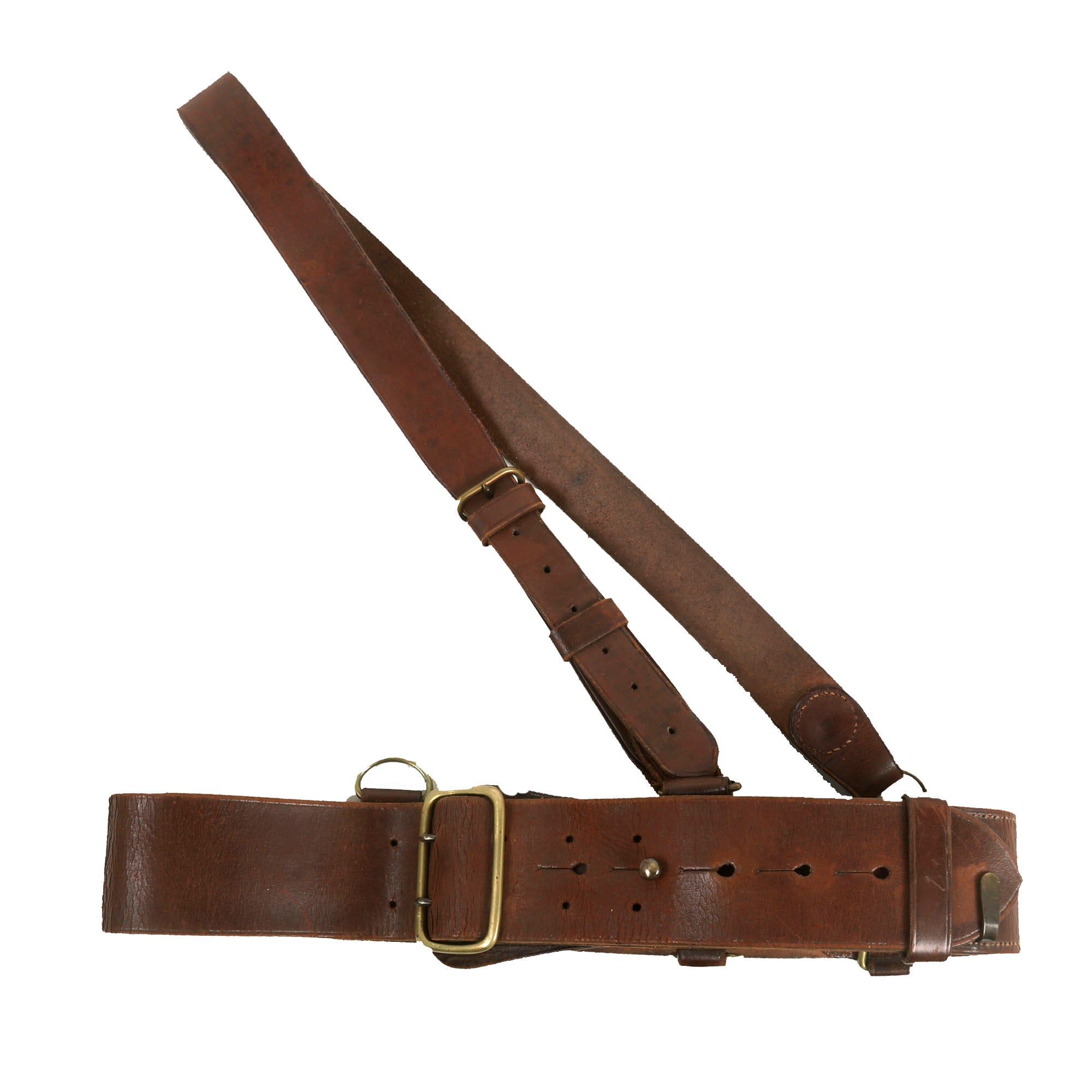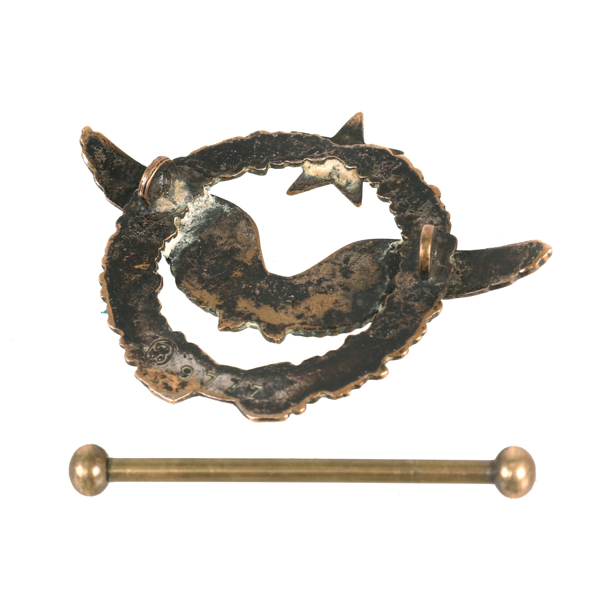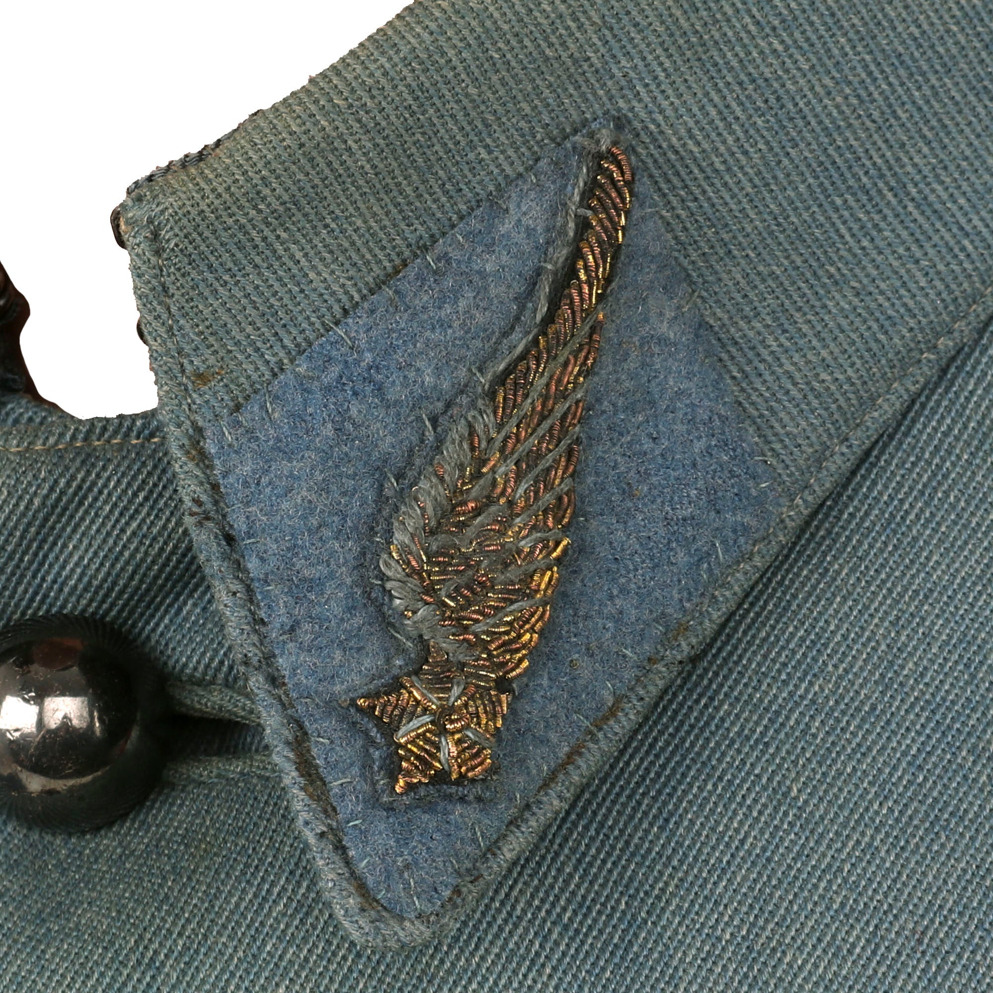 Now this is an absolutely stunning uniform set. This was the standard issue for a WWI French Pilot. Horizon blue French Air Service service coat, single breasted with all 7 brass buttons down front. The collar tabs feature beautiful gold bullion “winged star” insignia with the color retained very well. The right side of the uniform features a lovely “B” hallmarked Pilot’s Wings Badge with the colors retained very well. The badge was issued in the final years of the war, while the “B” hallmarked badges were used up into 1925. The badge is serialized with the number 9777 indicating that it dates between 1915 to 1916. These badges in their own standpoint are very rare. The belt featured on the tunic is in wonderful condition and rests on the integrated belt hooks on the tunic quite nicely.